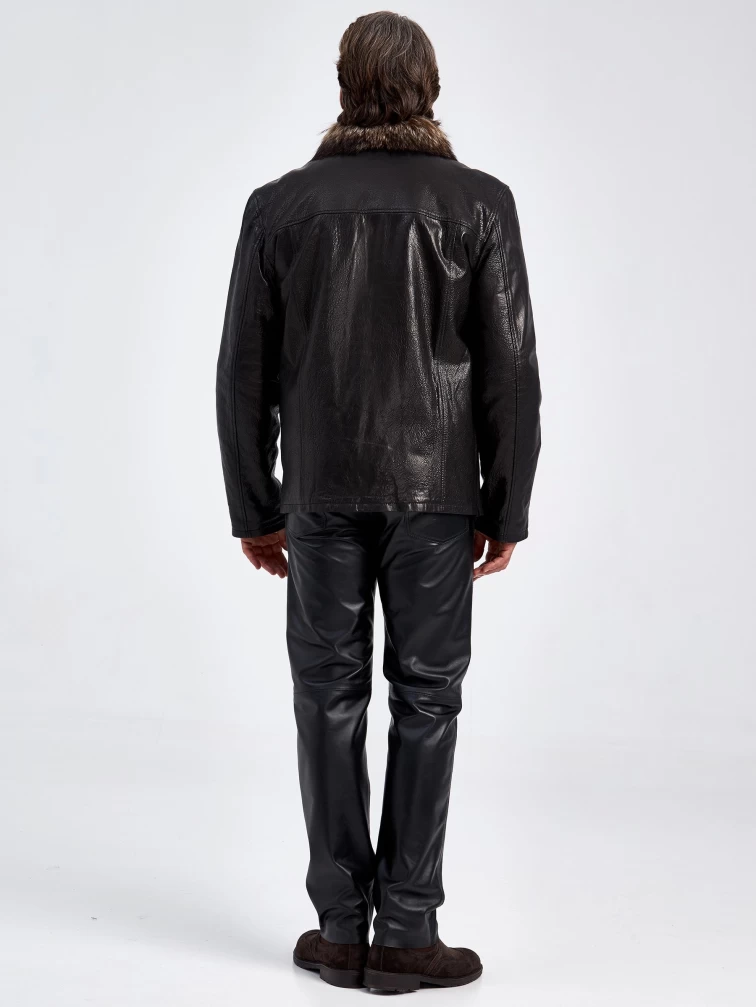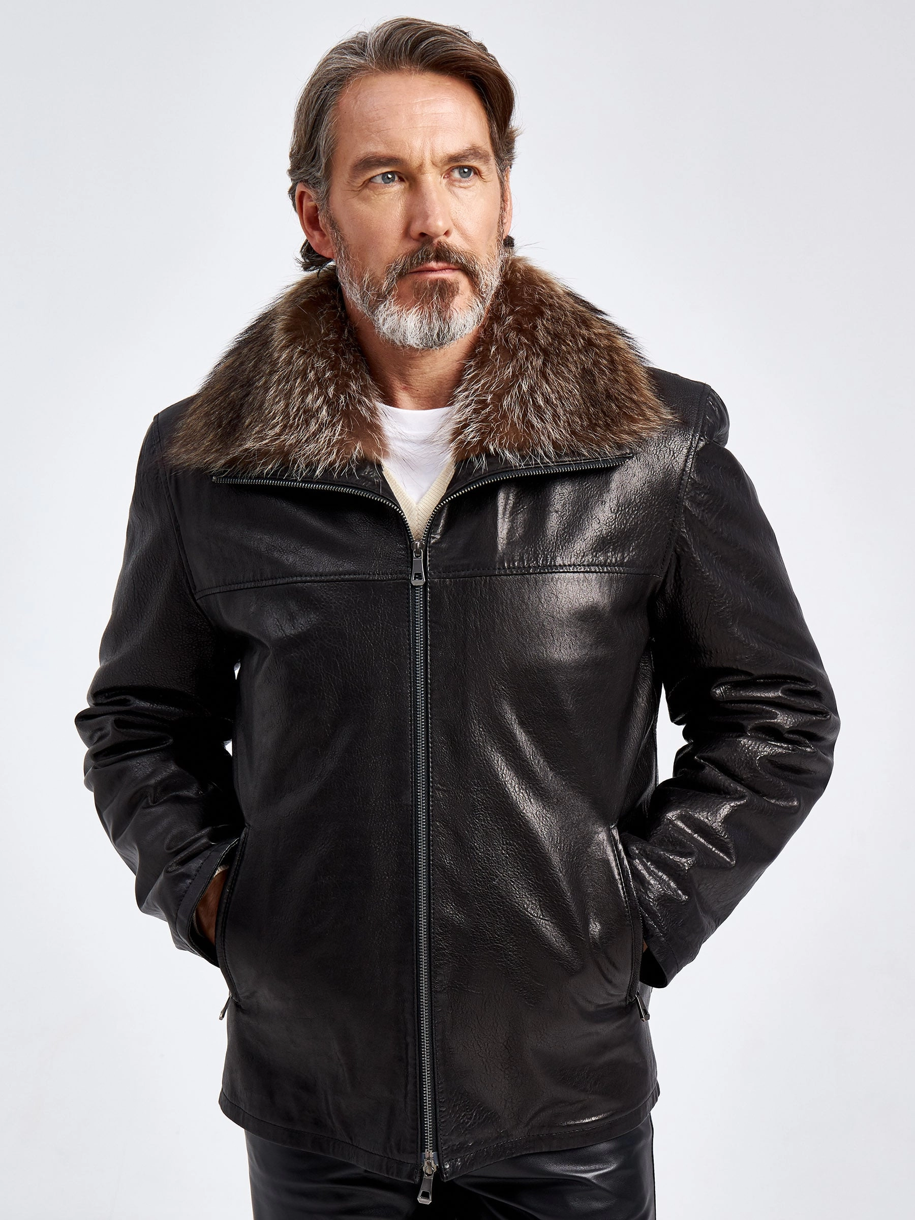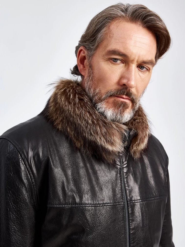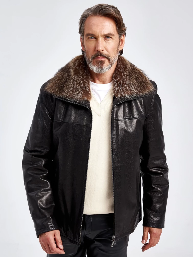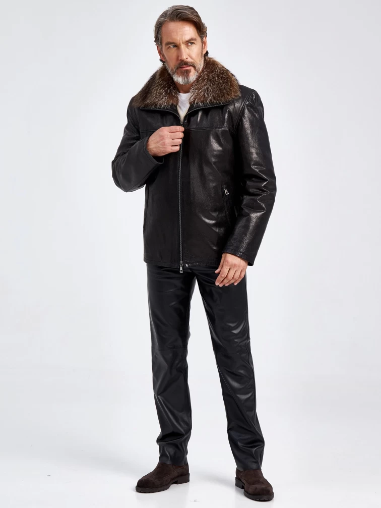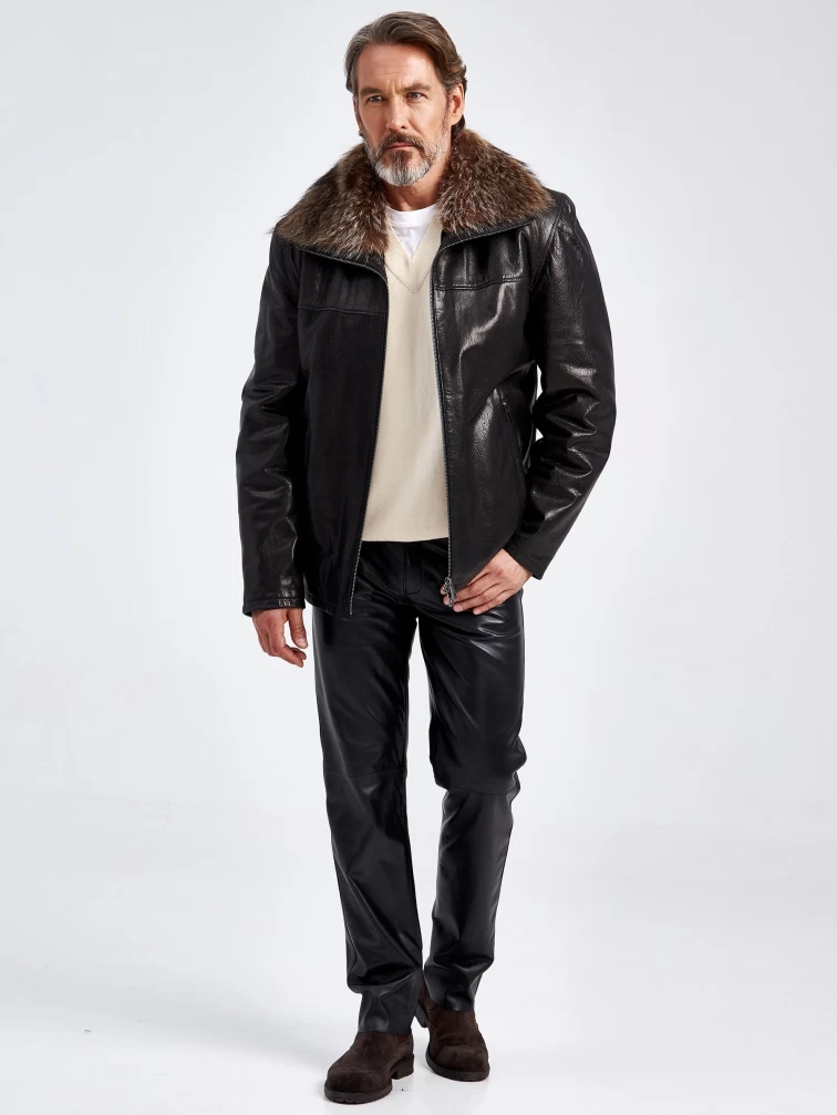 Кожаная дубленка с мехом енота для мужчин 5319, черная, размер 48, артикул 71070