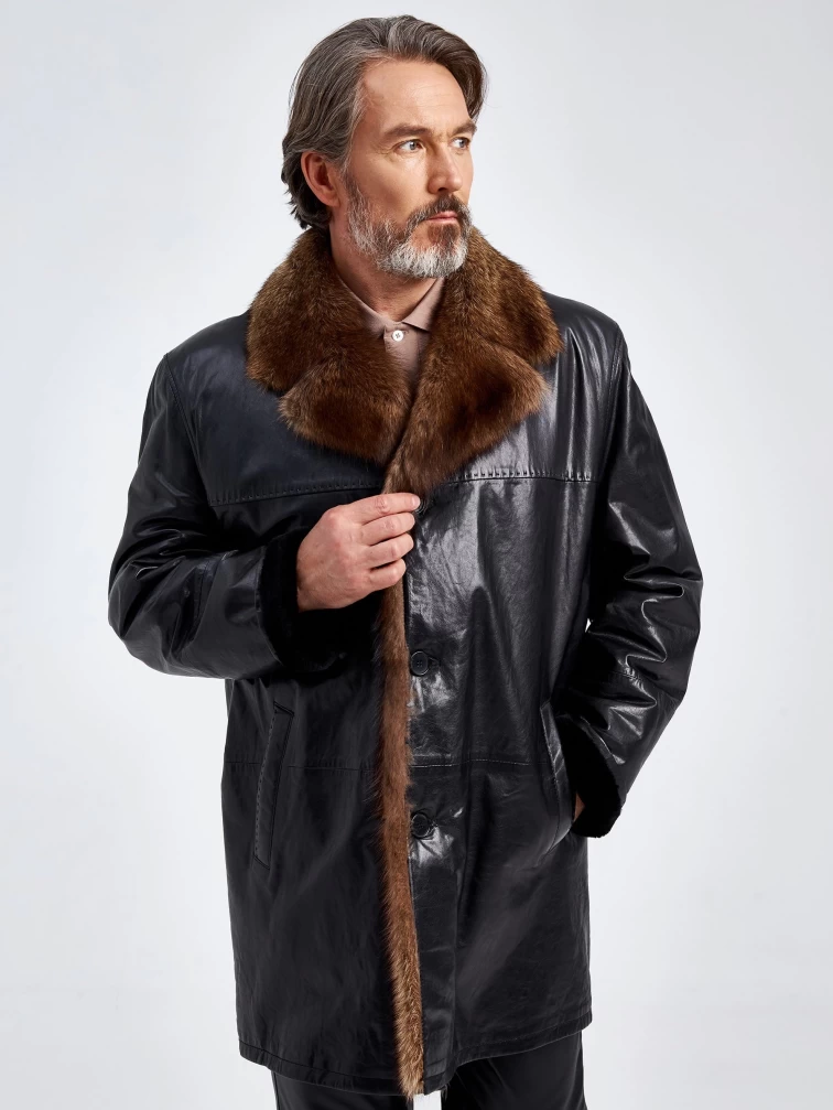 Кожаная мужская дубленка с воротником меха соболя премиум класса 5140, черная, размер 56, артикул 71120