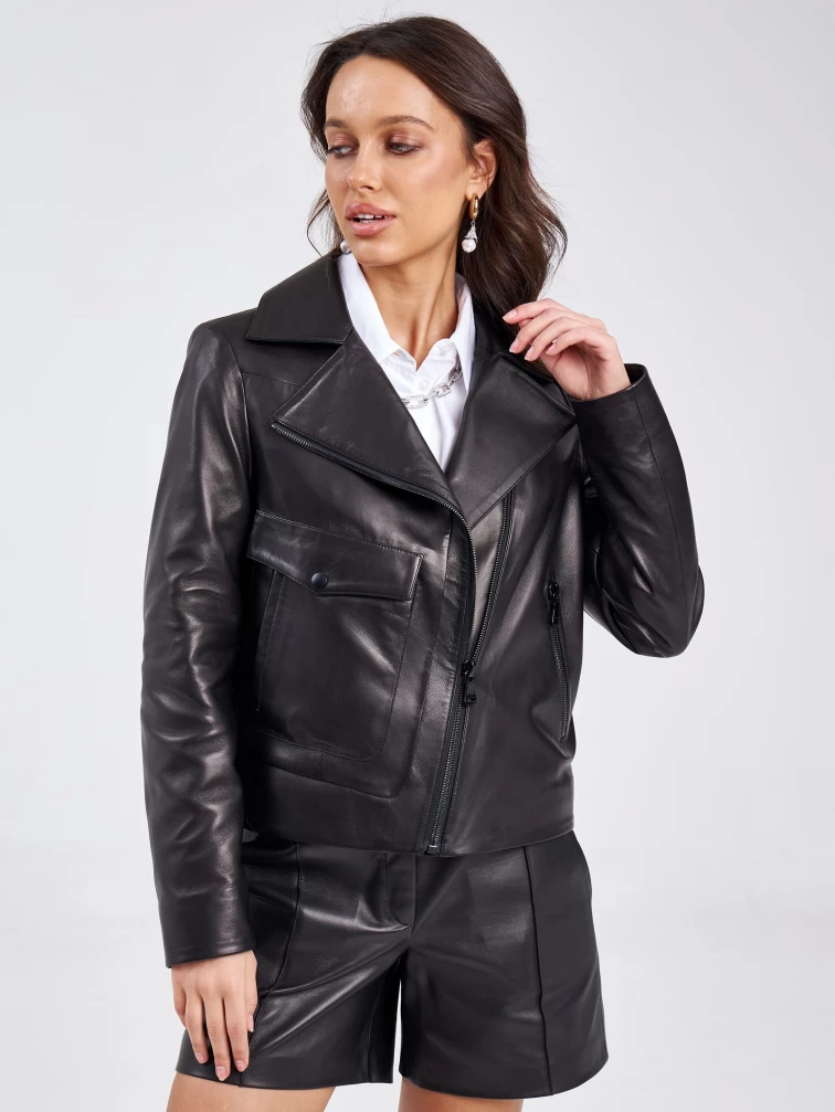 Короткую куртку прямого кроя с косой молнией и широкими лацканами выполнили из мягкой гладкой кожи премиум класс. Акцент сделали на двух асиммитричных карманах.