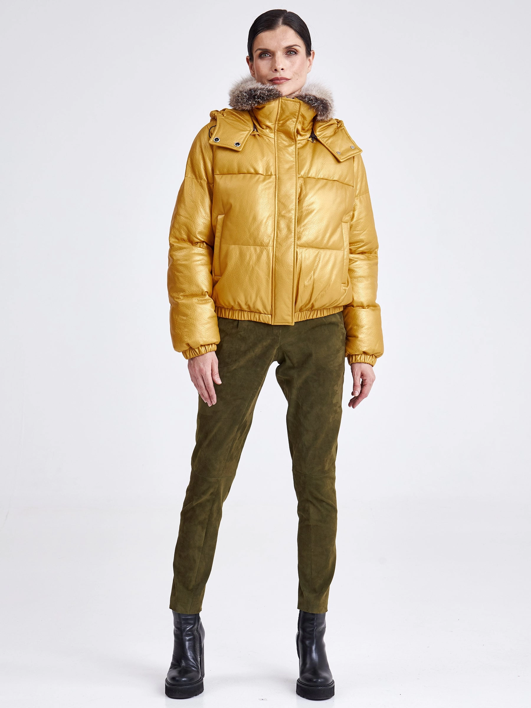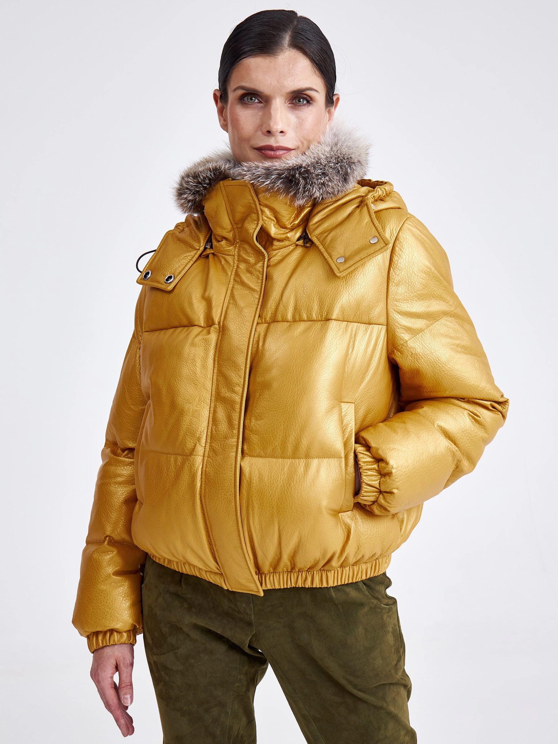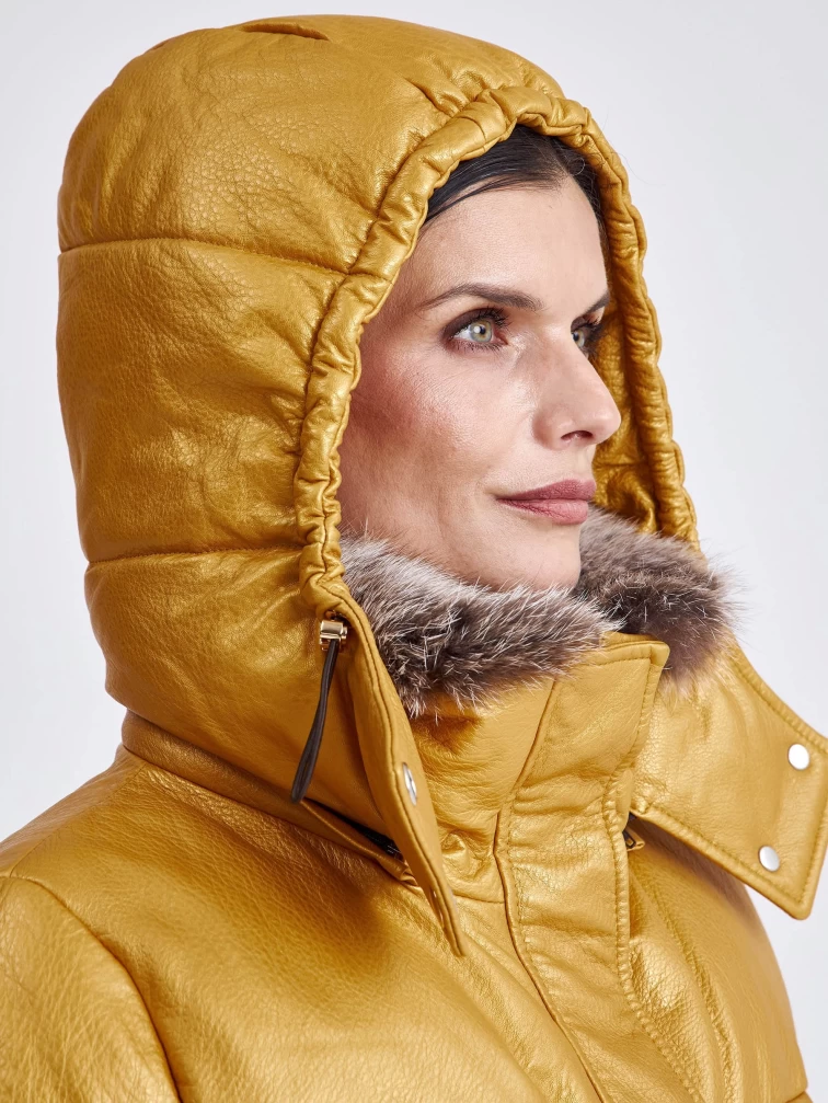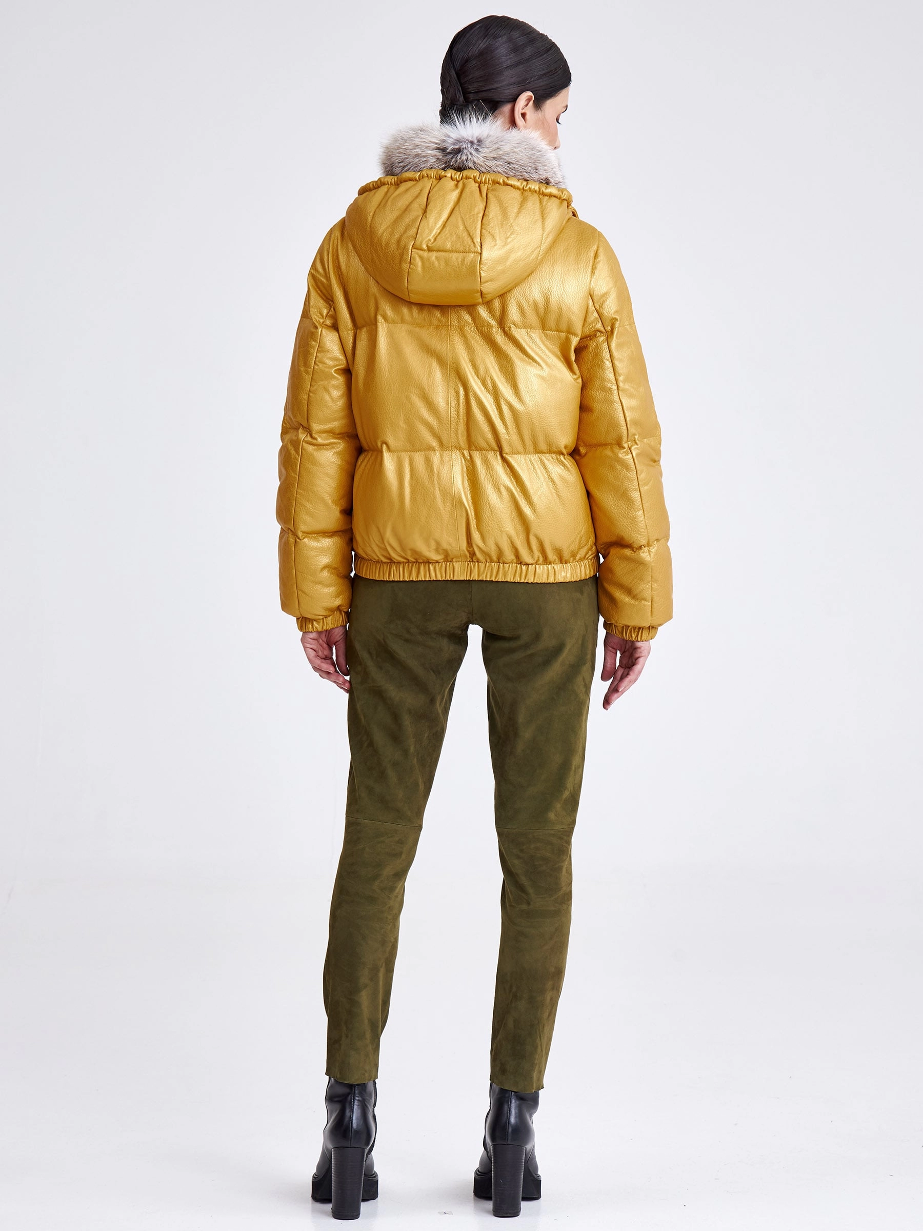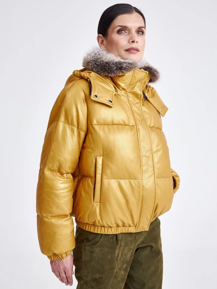 Женская кожаная куртка бомбер с меховым капюшоном 3027, желтая, размер 44, артикул 25440