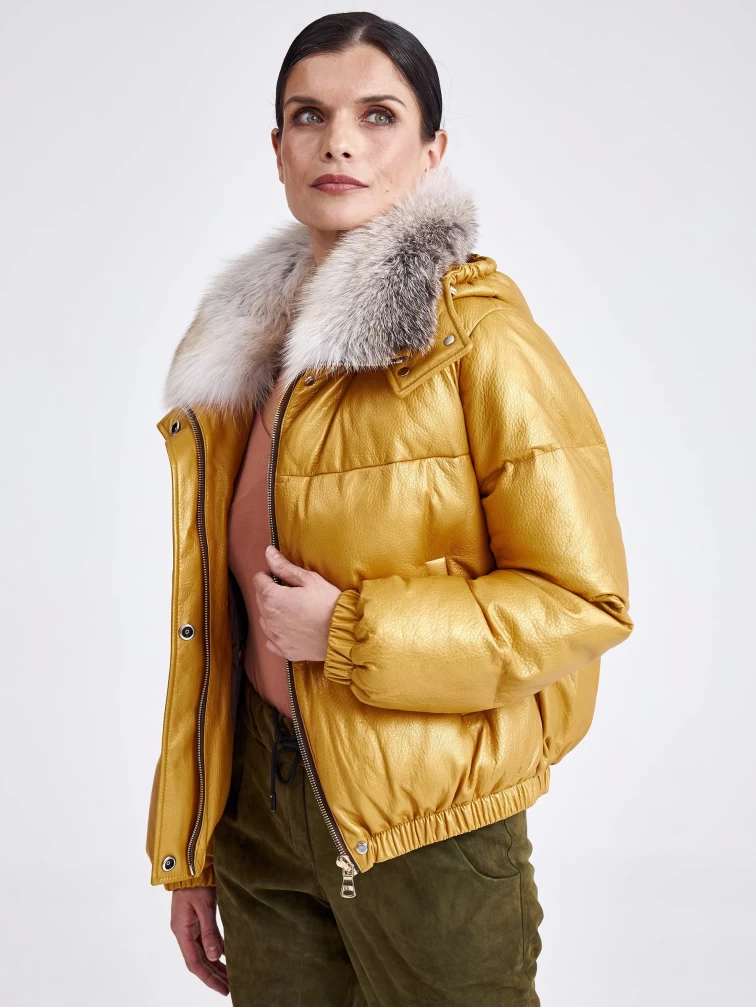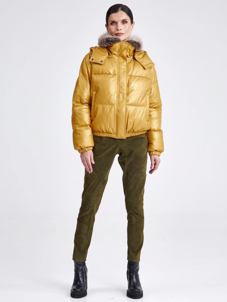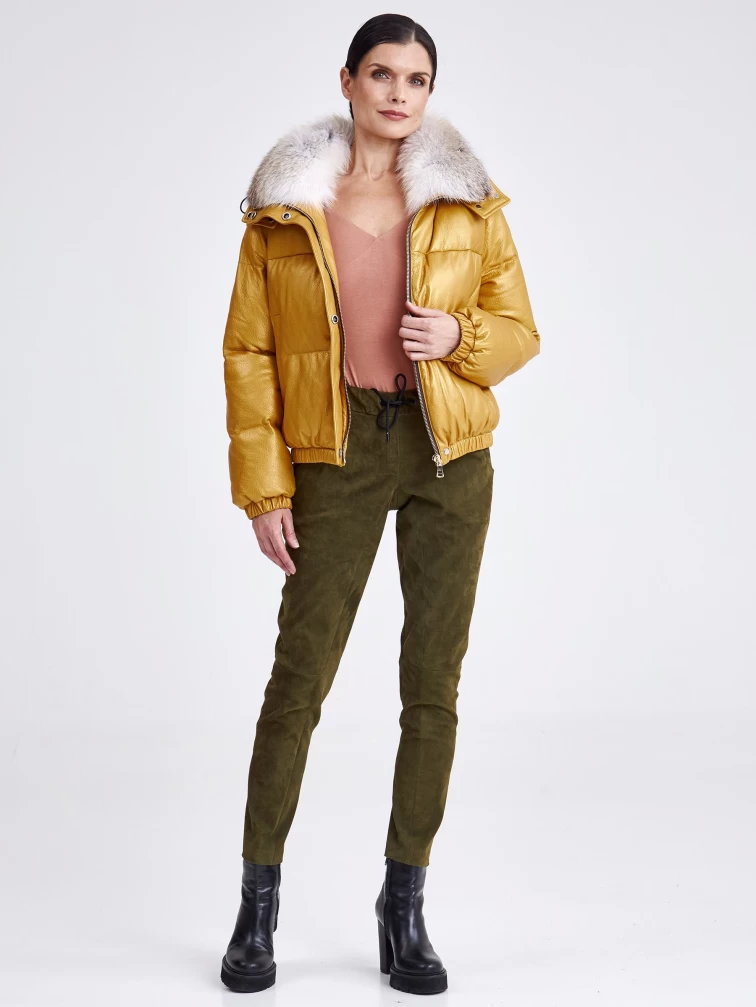 Товар женская кожаная куртка бомбер с меховым капюшоном 3027, желтая, размер 44, артикул 25440 выполнен из натуральной кожи с застежкой молния. Рассчитан на сезон: осень-зима. Длина изделия 51-74 см, силуэт свободный.