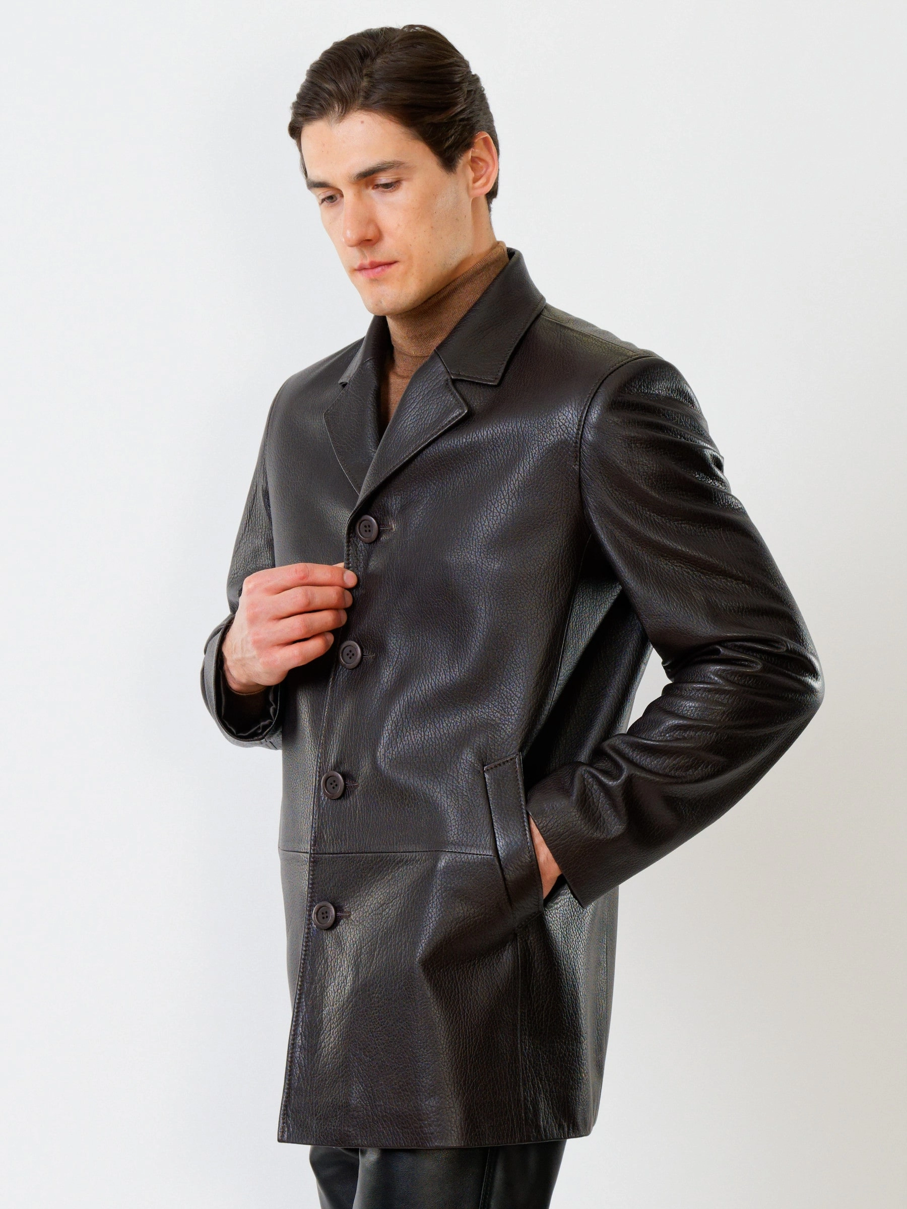 Мужская куртка на пуговицах в современном исполнении. Черная кожа особой выделки. Модель комфортно садится по фигуре поверх пиджака. Прямой силуэт. Английский воротник. Рукав втачной двухшовный. Ширина рукавов и специальное построение плечевого пояса, обеспечивают комфортную посадку на любой тип фигур. Широкий усиленный подборт предотвращает деформацию. Эргономичные усиленные листочки наружных карманов. Предусмотрены внутренние застёгивающиеся карманы для документов. Особая обработка петель под пуговицы предотвращает их изнашивание. Безупречная работа наших портных.