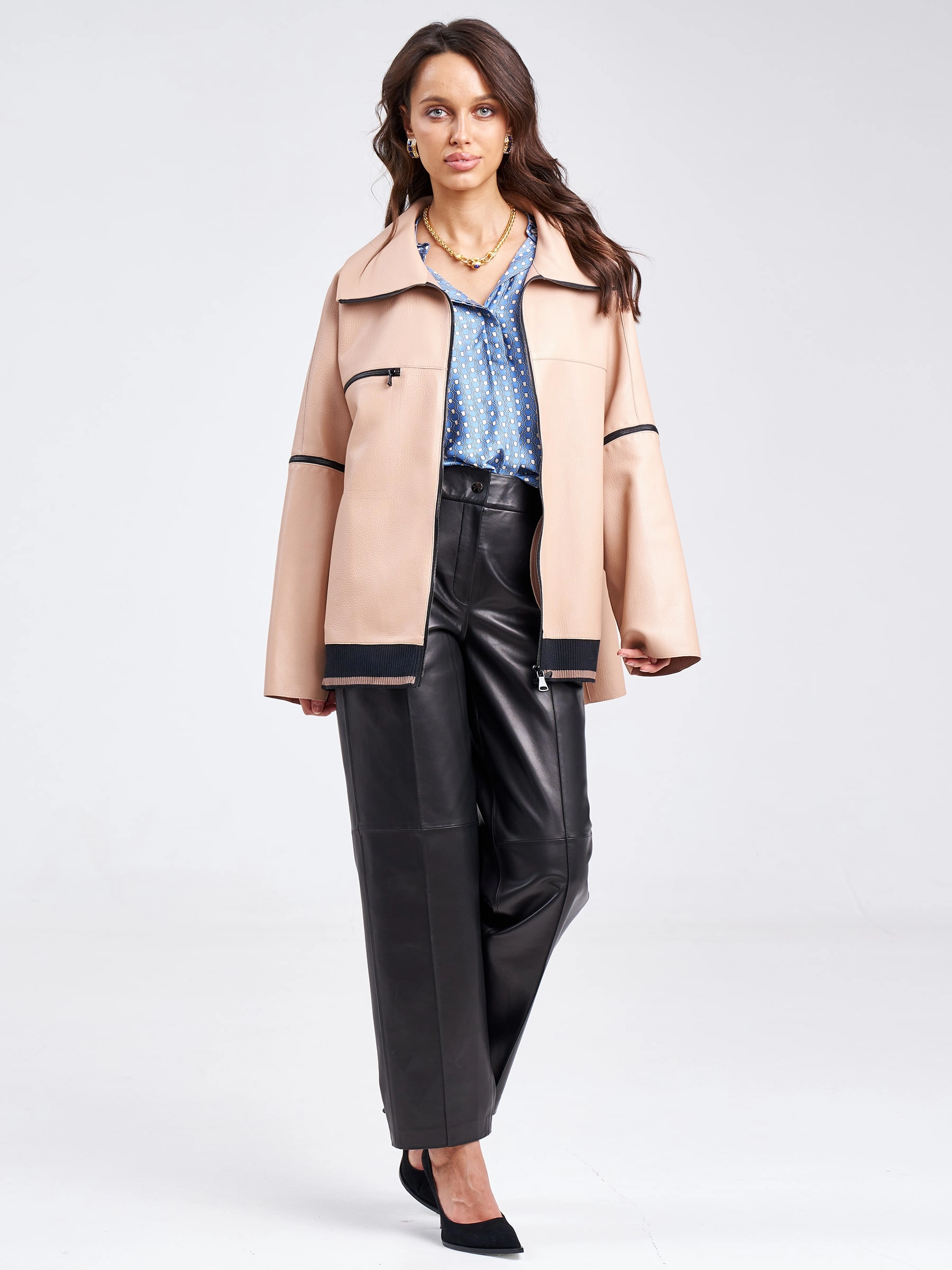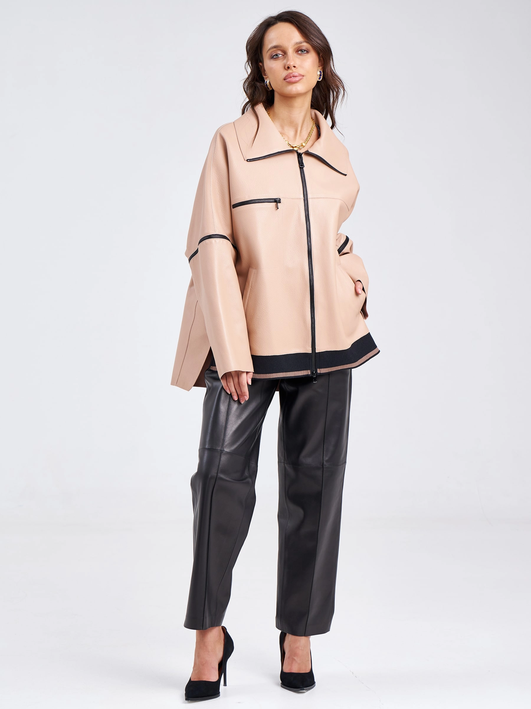 Товар кожаная женская куртка оверсайз на резинке премиум класса 3031, пудровая, размер 52, артикул 23200 выполнен из натуральной кожи с застежкой молния. Рассчитан на сезон: весна-лето. Длина изделия 76 см, силуэт свободный.
