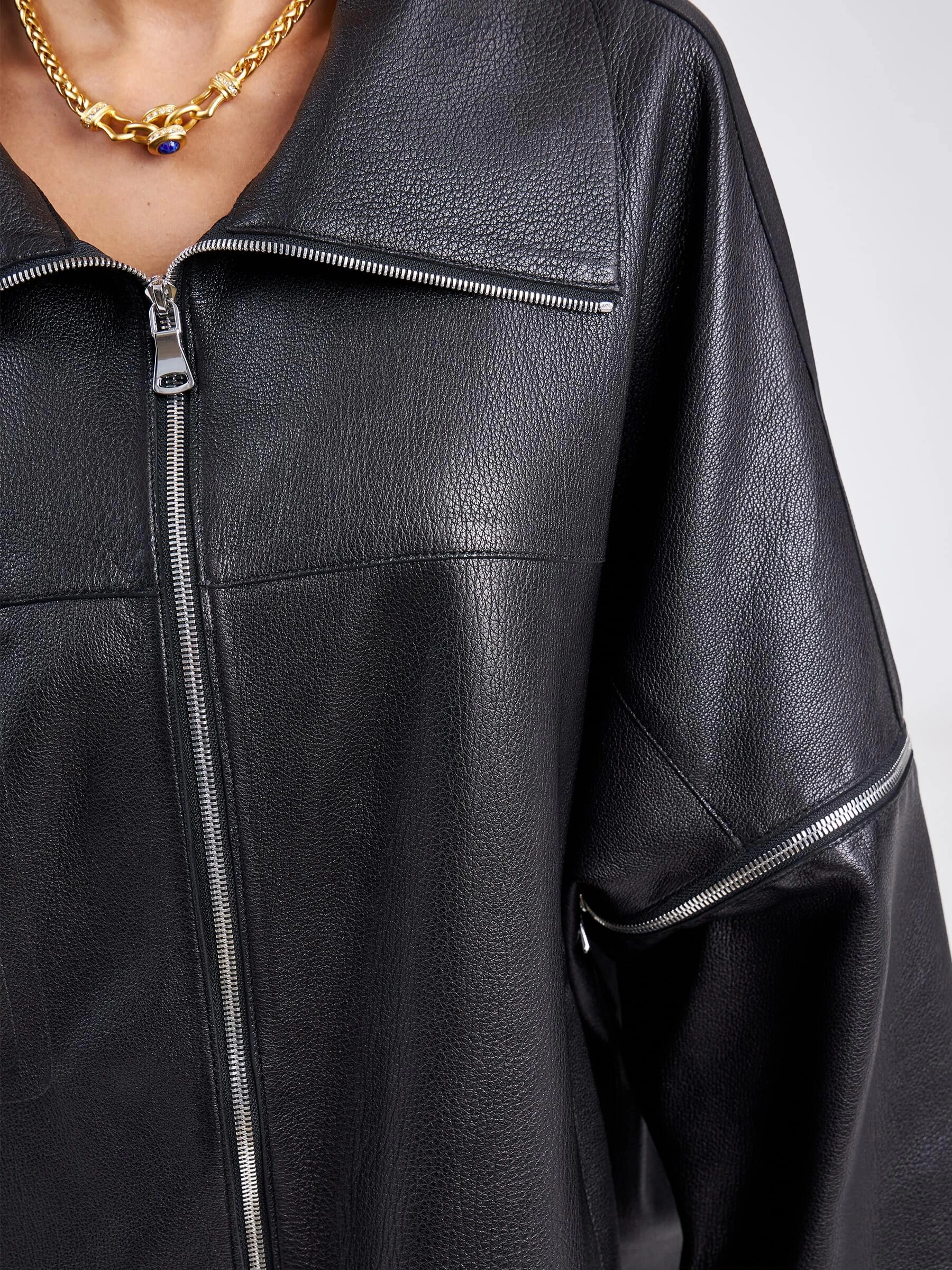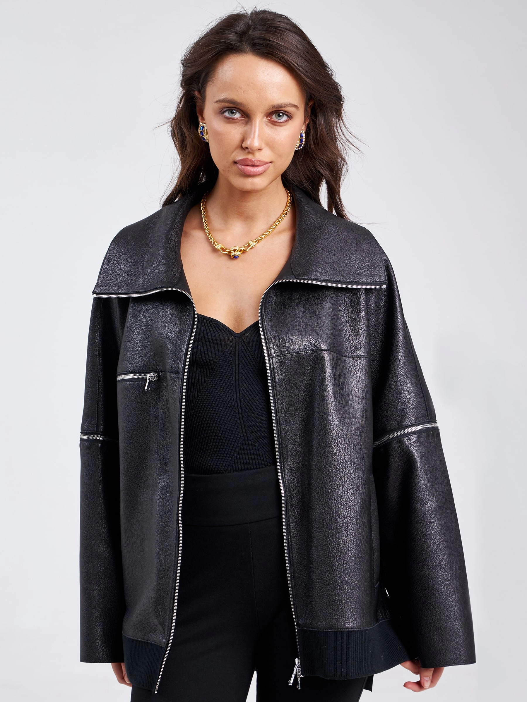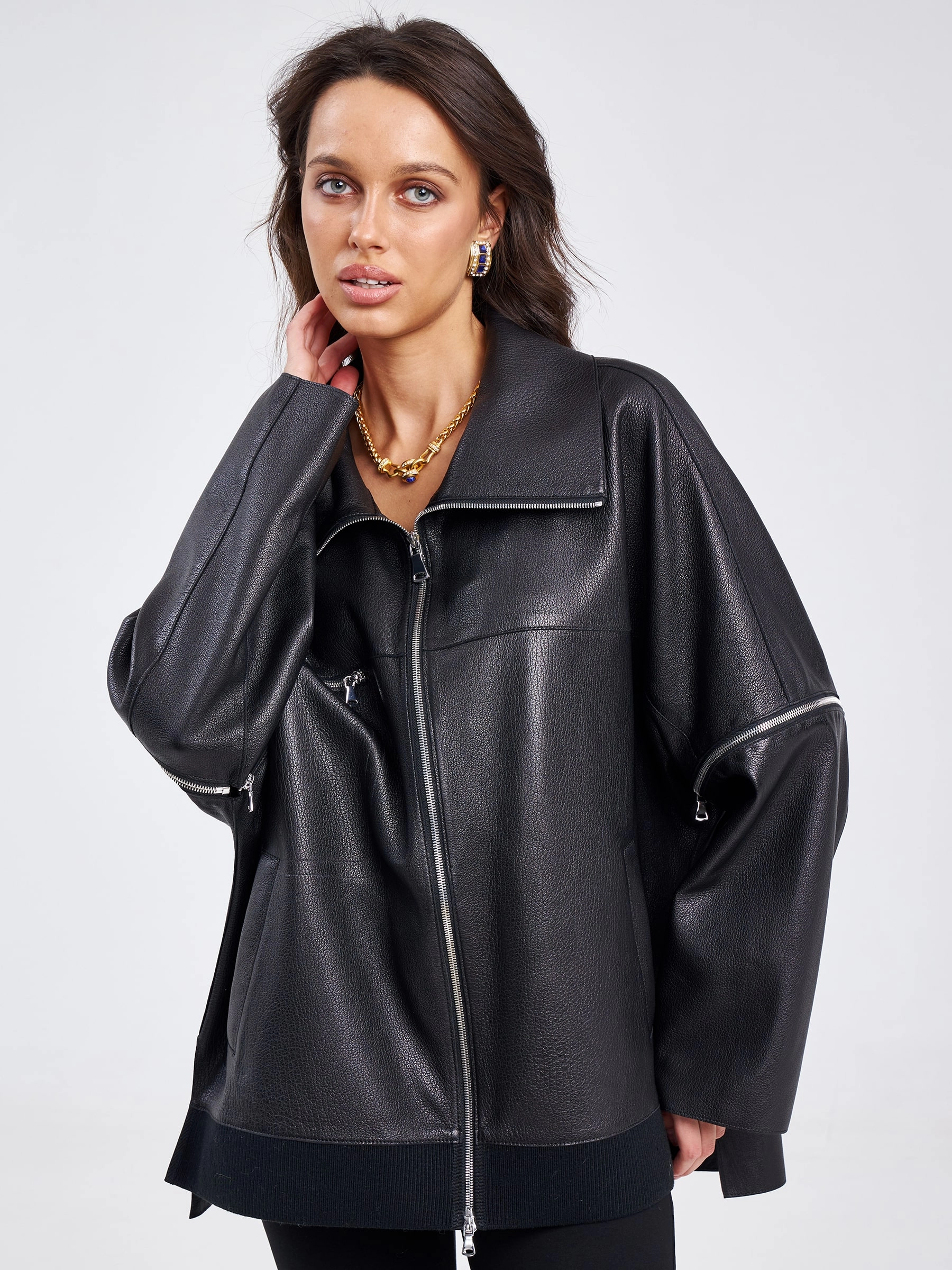 Премиальная кожаная куртка‑жакет оверсайз для сезона весна–лето воплощает стиль и комфорт: выполнена из натуральной кожи высшего качества, имеет свободный крой и длину 76 см, спущенный рукав и широкий рукав‑трансформер для дополнительной функциональности, отложной воротник легко трансформируется в стойку, придавая образу нужную выразительность, модель дополнена практичными карманами и трикотажной резинкой по низу, не имеет капюшона, отделки и подкладки, застёгивается на молнию. Эта вещь идеально подойдёт и в качестве куртки, и как элегантный жакет, органично впишется как в повседневный, так и в более строгий гардероб. Стилисты советуют сочетать её с приталенными или полуприталенными вещами —например, с узкими джинсами, облегающим платьем‑футляром или юбкой‑карандашом: контраст силуэтов подчеркнёт универсальность куртки‑жакета и сделает образ гармоничным. Для кэжуал‑лука дополните образ массивными ботинками или кедами и минималистичной сумкой, а для более элегантного варианта выберите ботильоны на устойчивом к