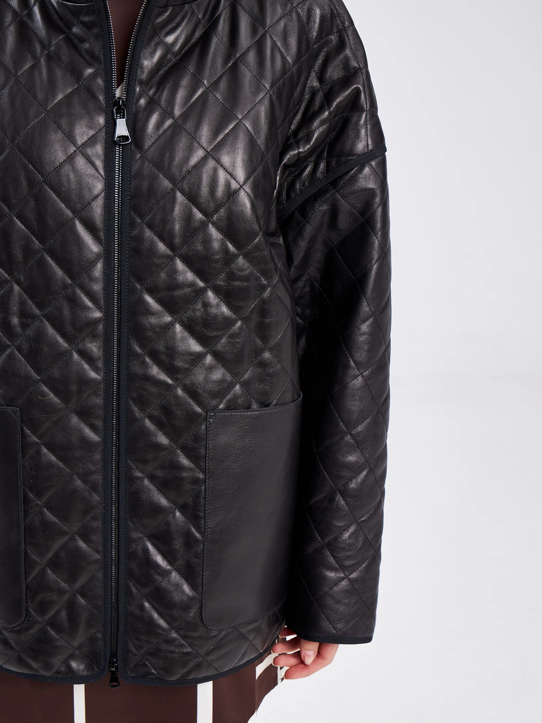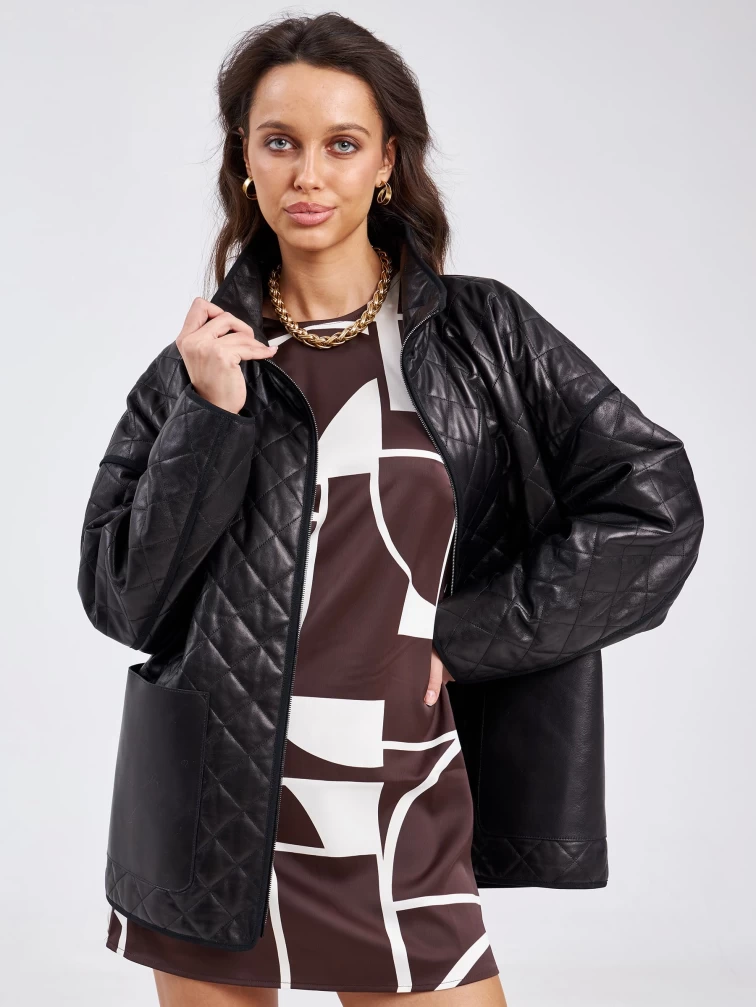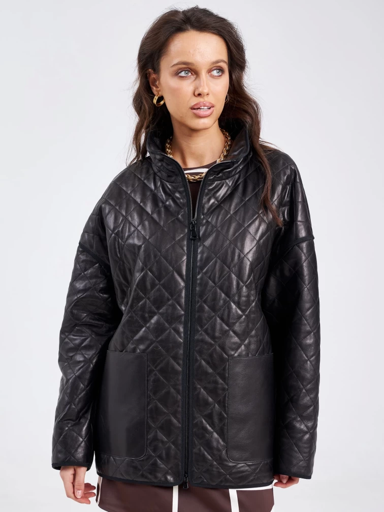 Товар кожаная женская стеганая куртка премиум класса 3043, черная, размер 52, артикул 23260 выполнен из натуральной кожи с застежкой молния. Рассчитан на сезон: весна-лето. Длина изделия 70 см, силуэт прямой.