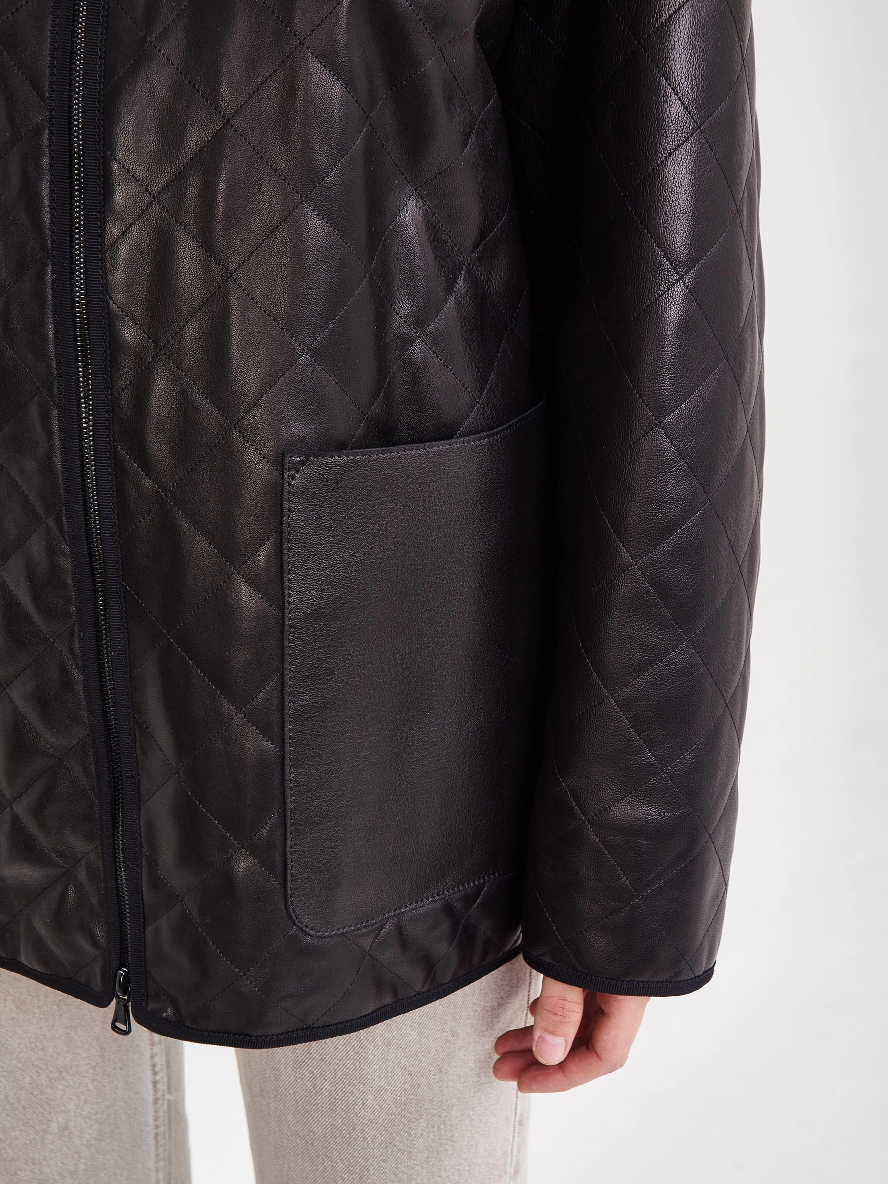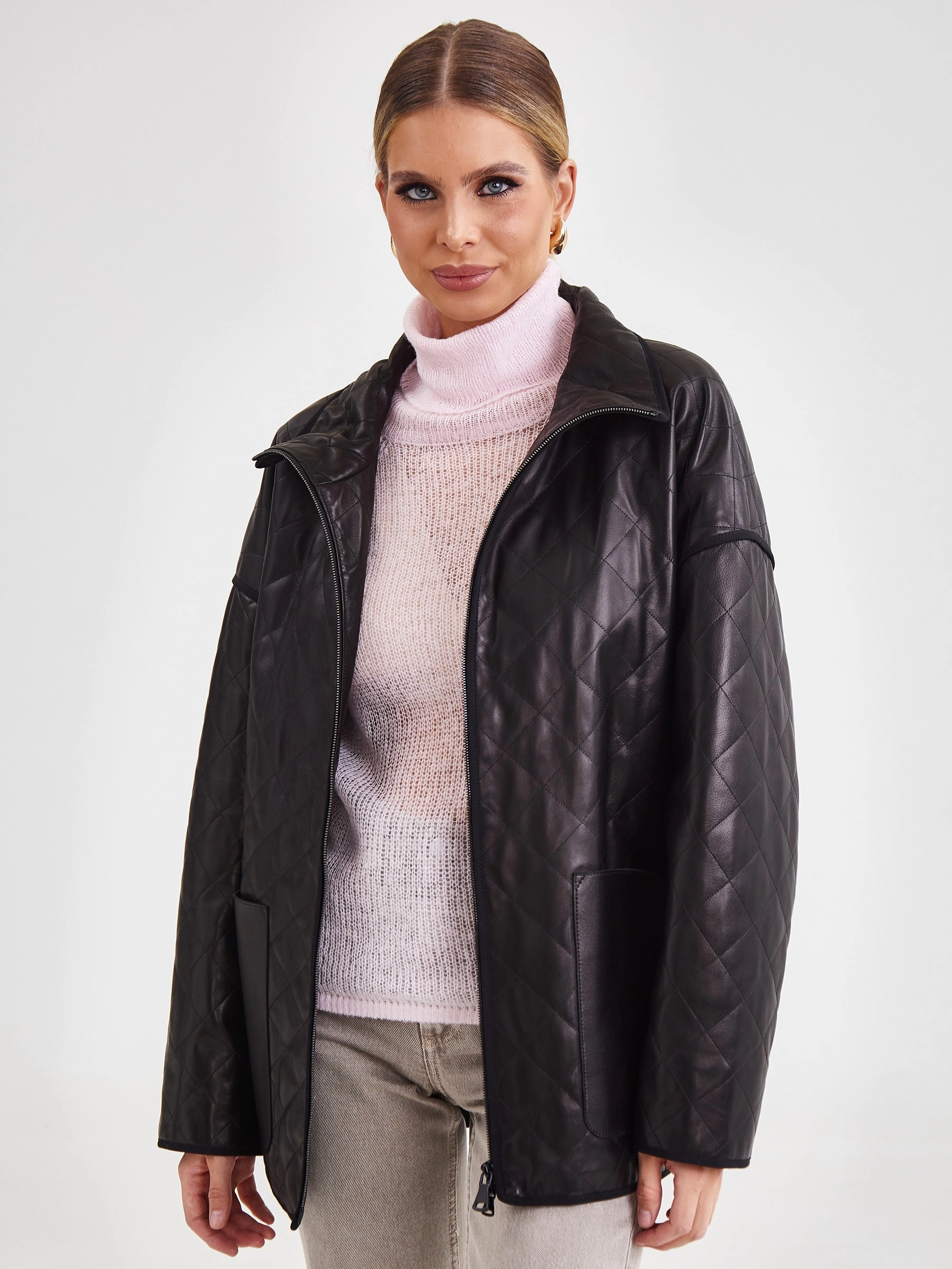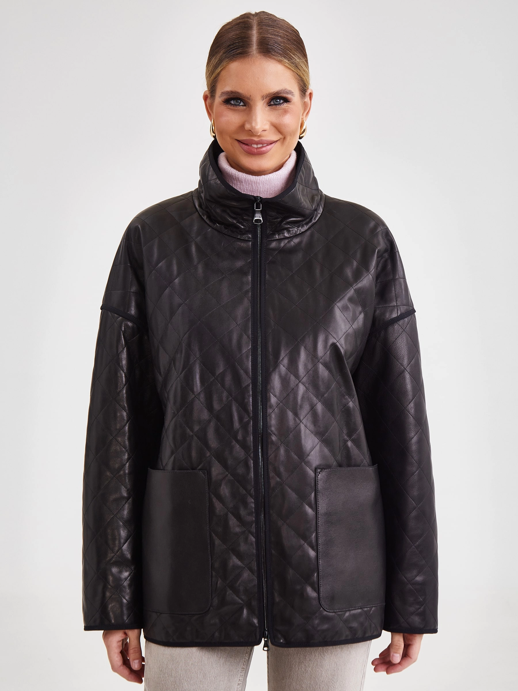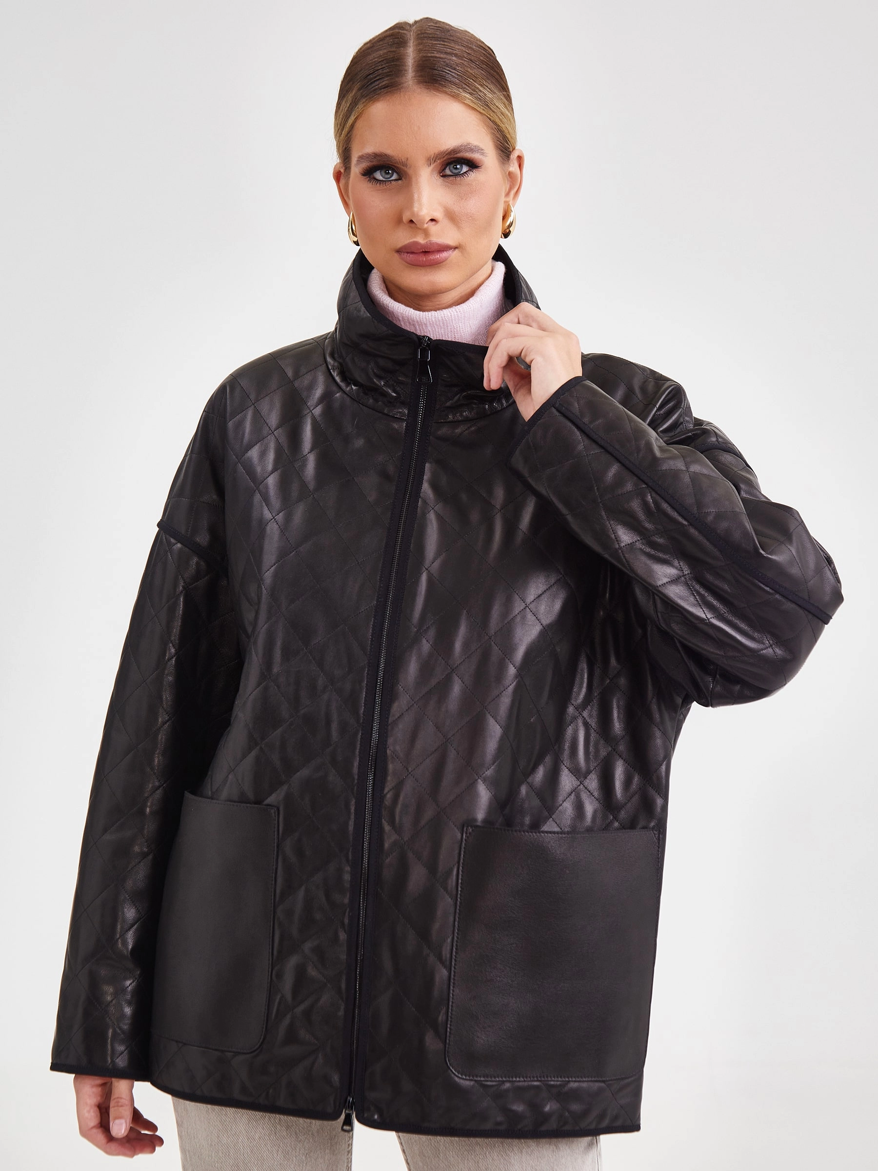 Кожаная стёганая женская куртка премиум‑класса в спортивном стиле: удачное решение для сезона весна–лето. Модель выполнена из гладкой стёганой кожи премиум‑класса, отличается прямым кроем и выглядит максимально лаконично, без капюшона и дополнительной отделки. Ключевая особенность куртки втачной рукав, который обеспечивает свободу движений, а также стойка‑воротник, придающий изделию аккуратный и завершённый вид. Практичность модели подчёркивают накладные карманы, удобный элемент для хранения мелочей. Застёжка‑молния обеспечивает лёгкость в использовании. Внутренняя подкладка выполнена из 100 %полиэстера, что добавляет изделию износостойкости и комфорта в носке. Длина изделия 70 см, силуэт свободный, подходит для разных образов. Совет стилиста: сочетайте куртку с джинсами и футболкой для кэжуал‑лука или с платьем‑комбинацией для контрастного образа, дополните образ кроссовками или ботильонами и минималистичной сумкой.