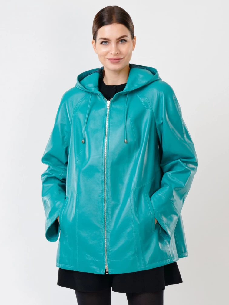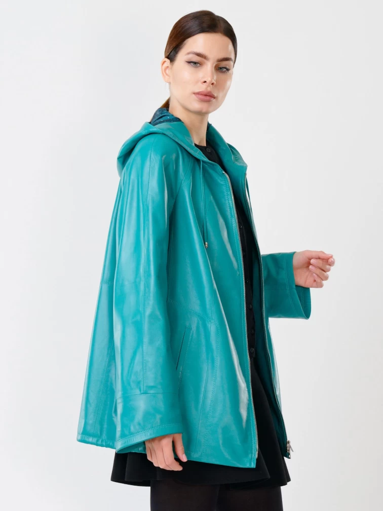 Товар кожаная женская куртка оверсайз с капюшоном 383, бирюзовая, размер 52, артикул 90740 выполнен из натуральной кожи с застежкой молния. Рассчитан на сезон: демисезон. Длина изделия 74 см, силуэт трапеция.