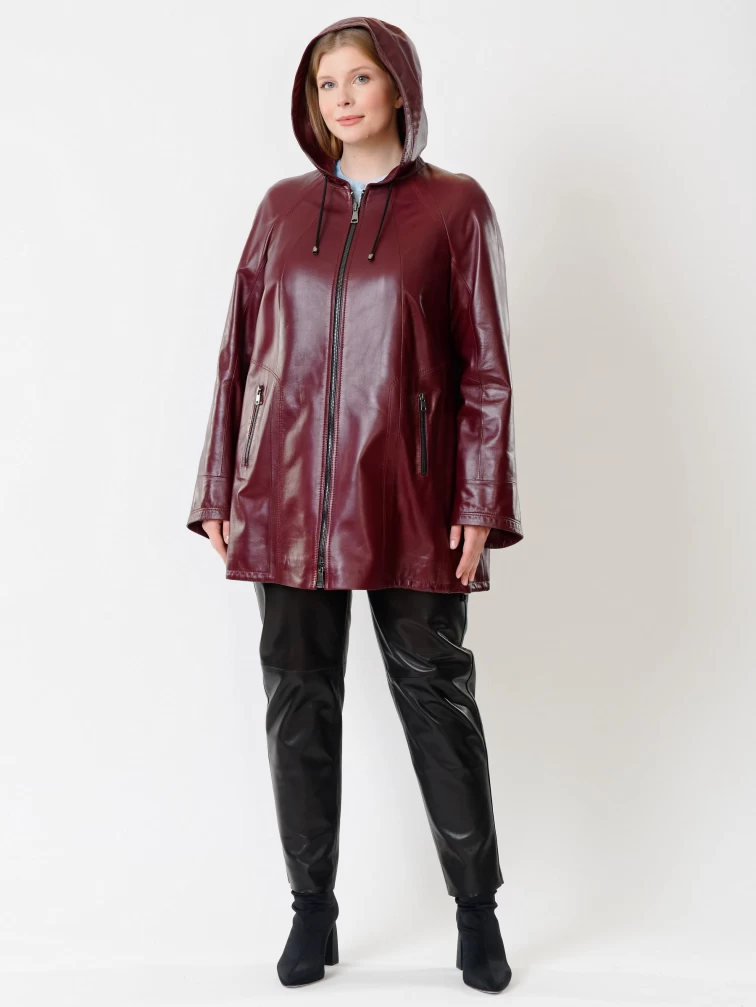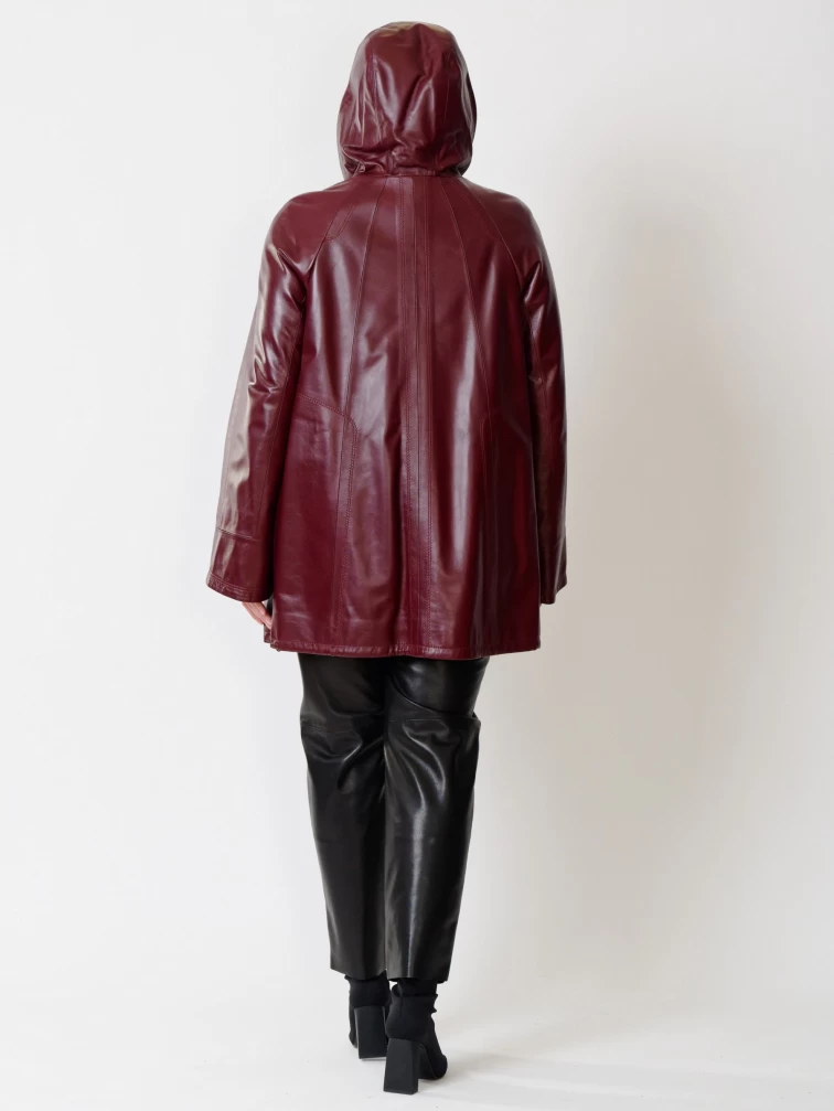 Товар кожаная женская куртка оверсайз с капюшоном 383, бордовая, размер 52, артикул 91300 выполнен из натуральной кожи с застежкой молния. Рассчитан на сезон: демисезон. Длина изделия 74 см, силуэт трапеция.