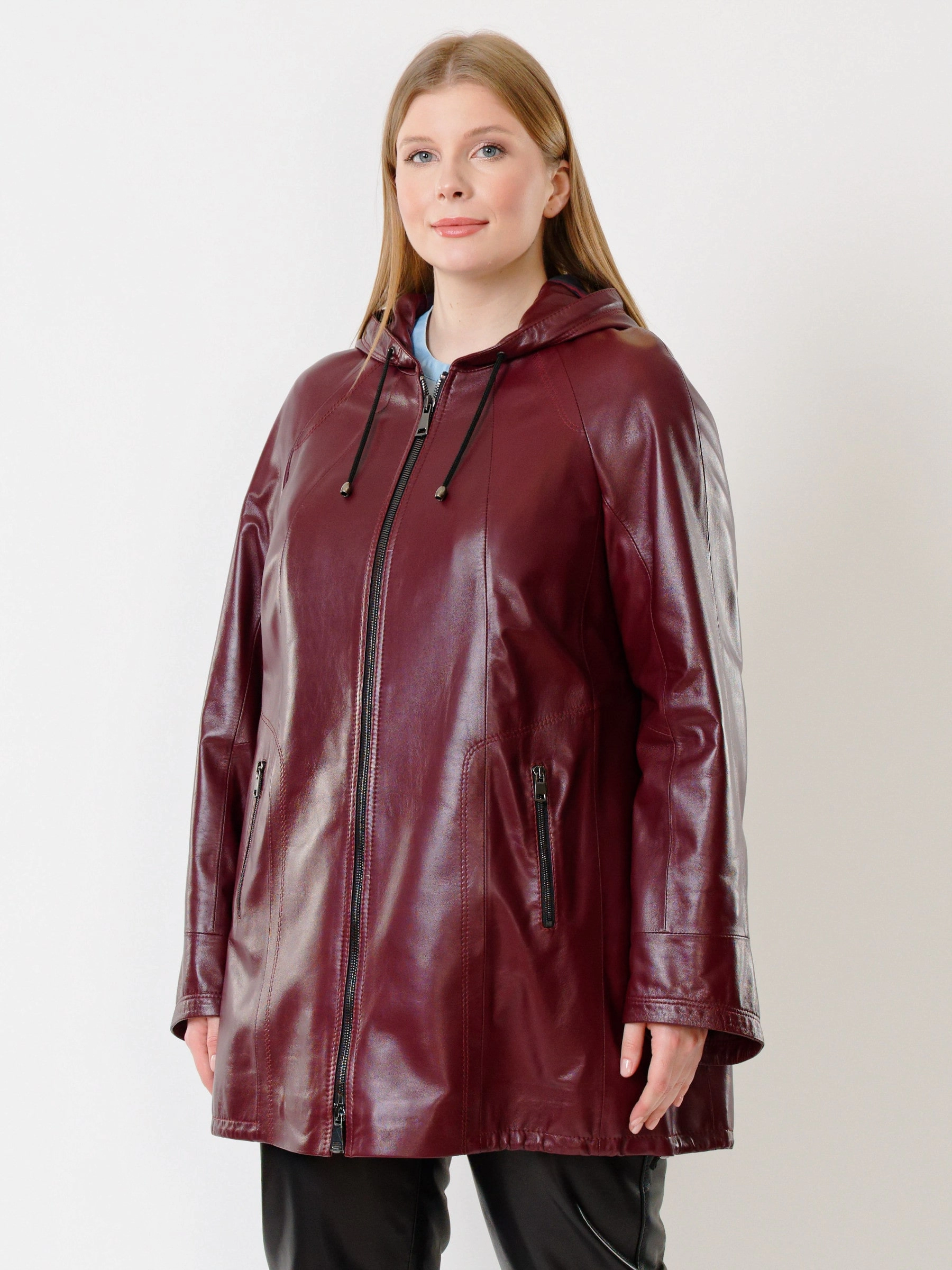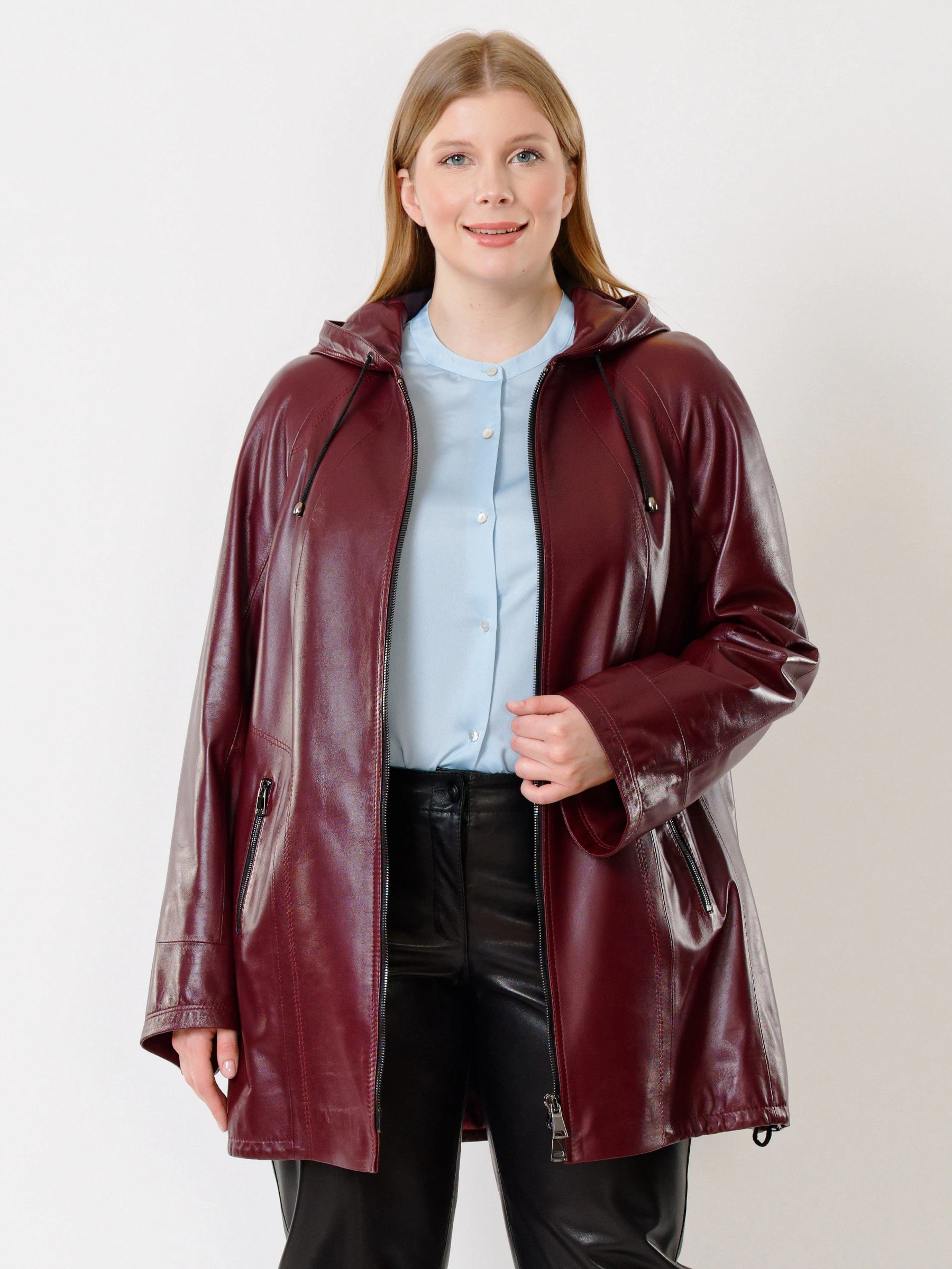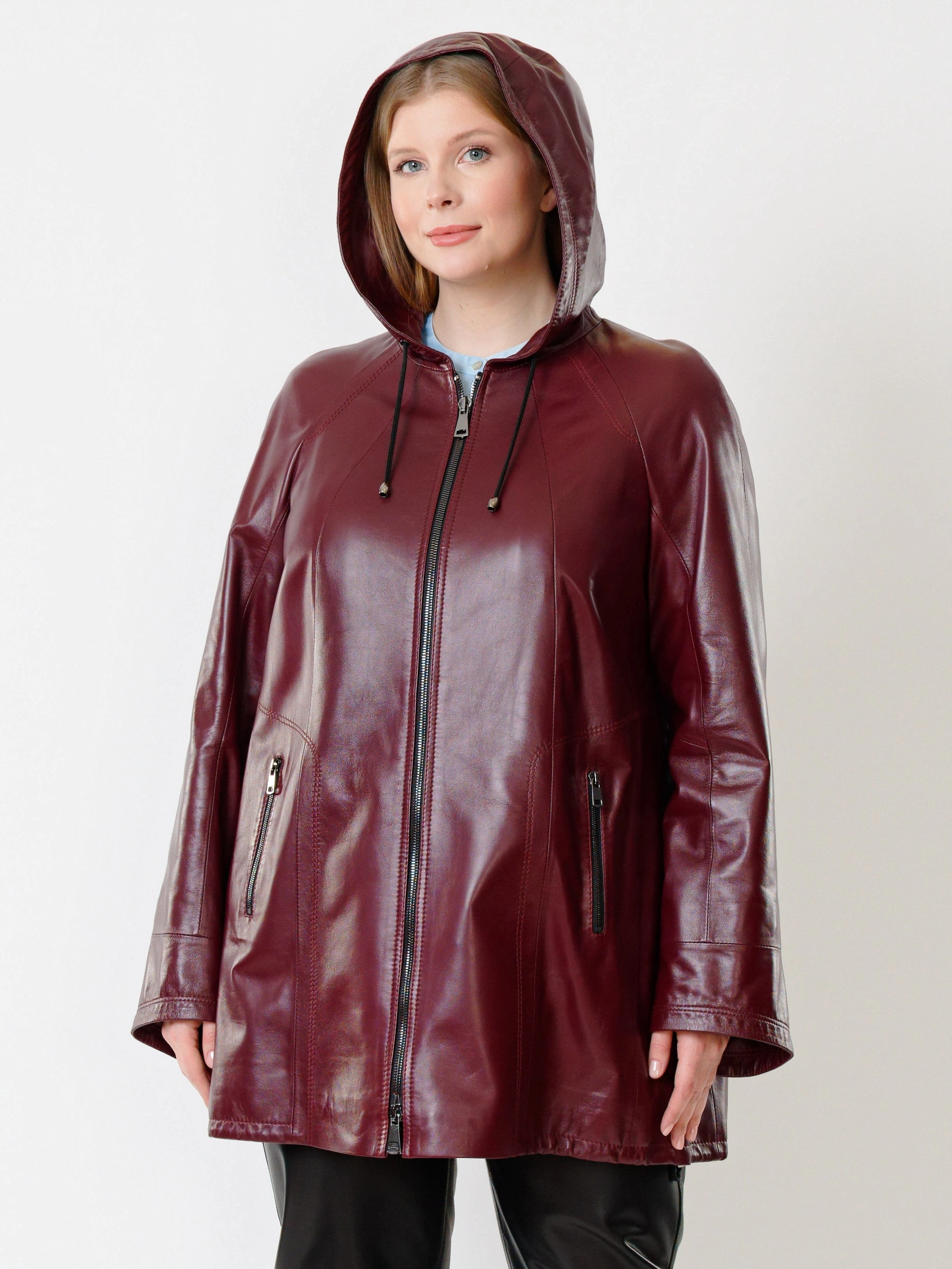 Кожаная женская куртка оверсайз с капюшоном 383, бордовая, размер 52, артикул 91300