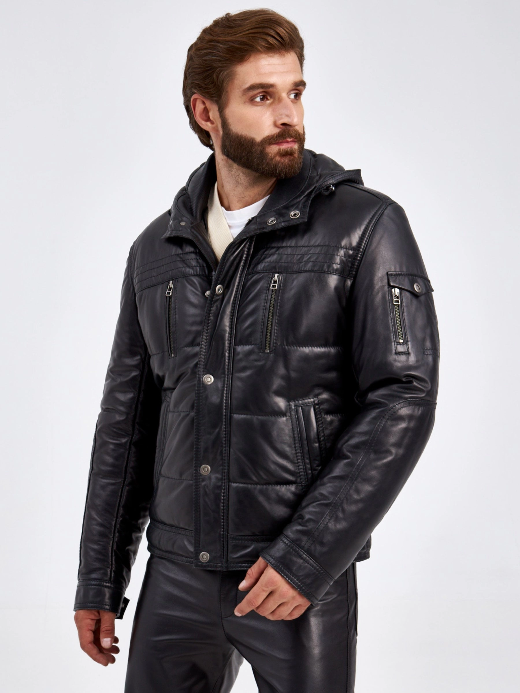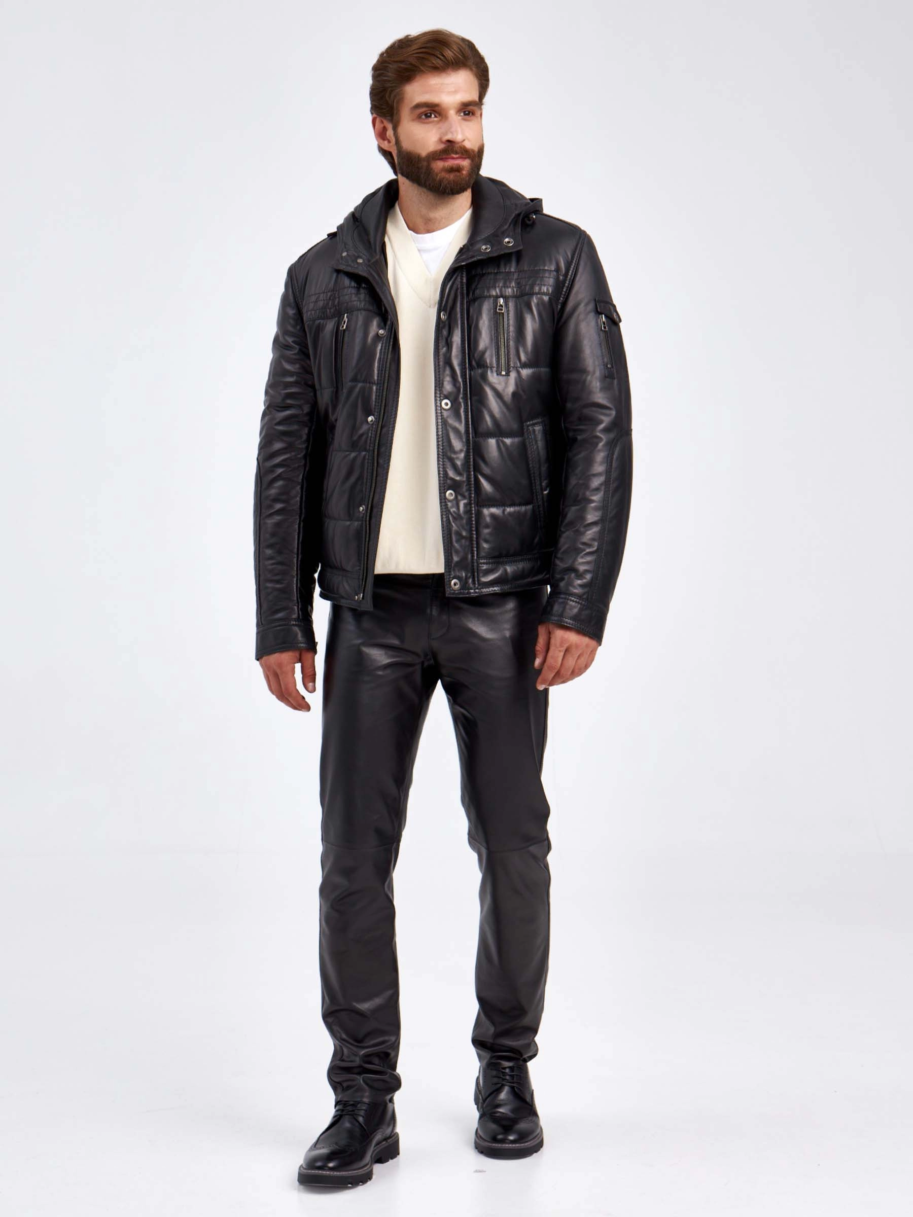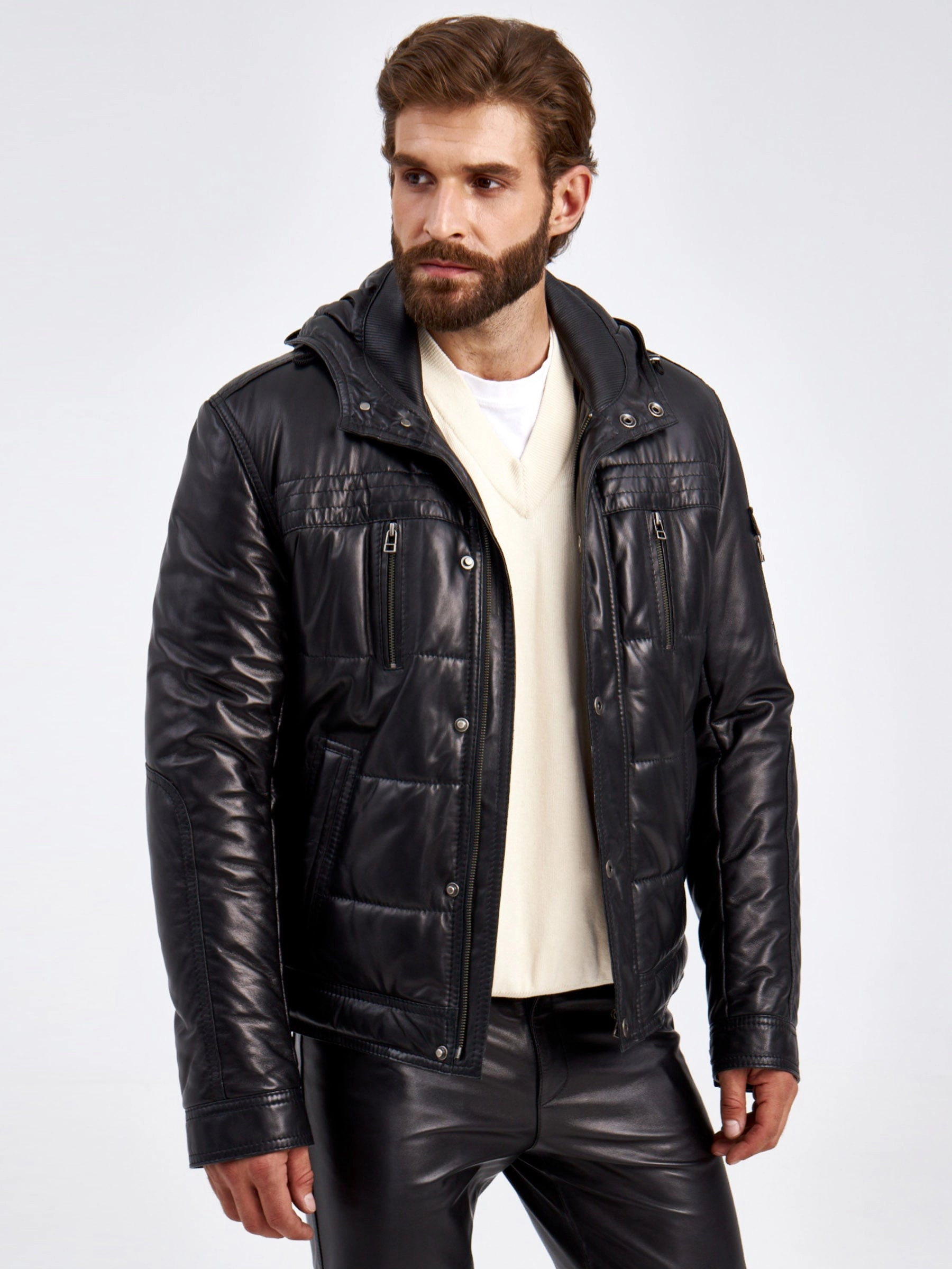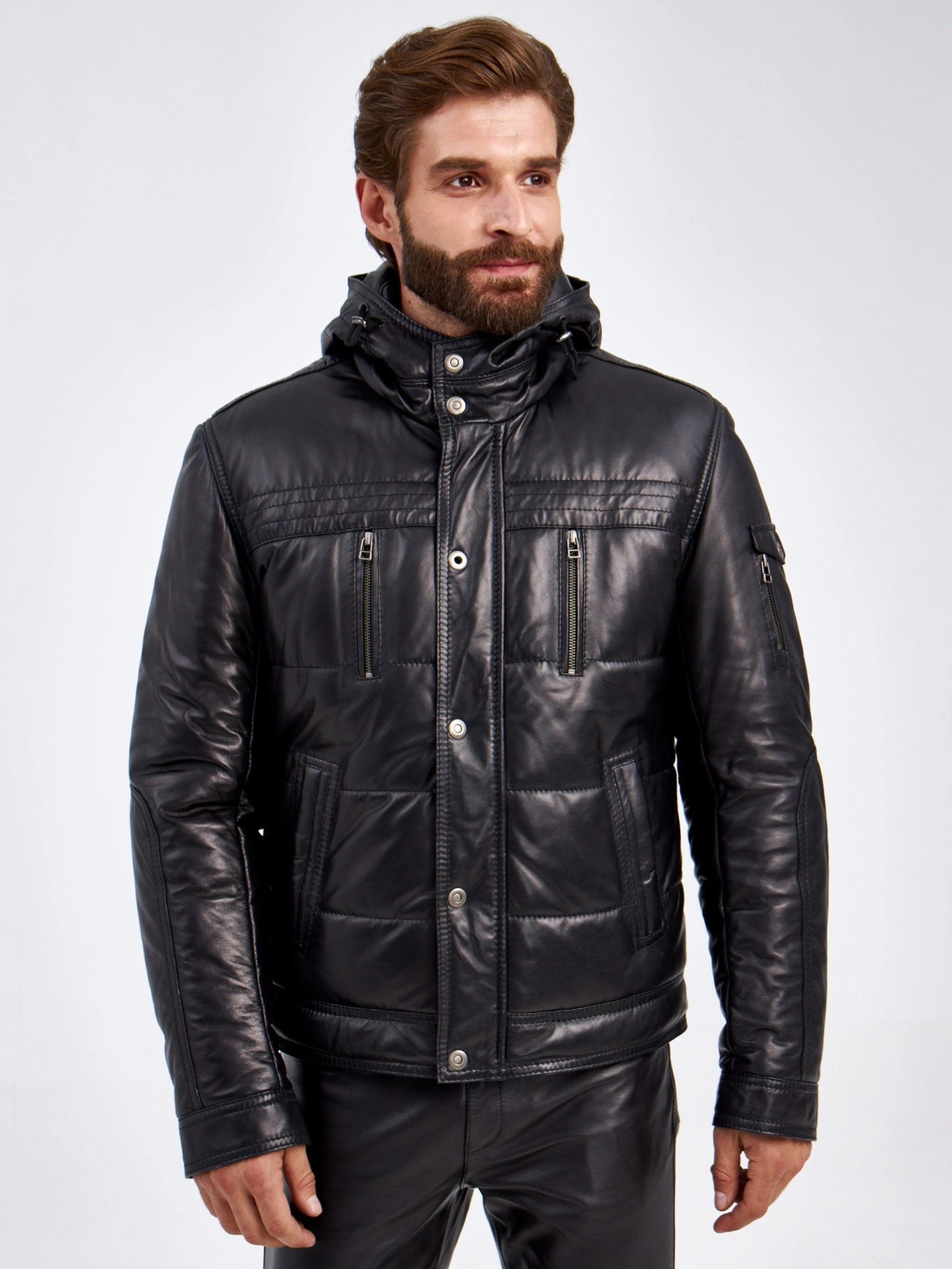 Утепленный мужской кожаный пуховик с капюшоном 2010-12, черный, размер 50, артикул 29150
