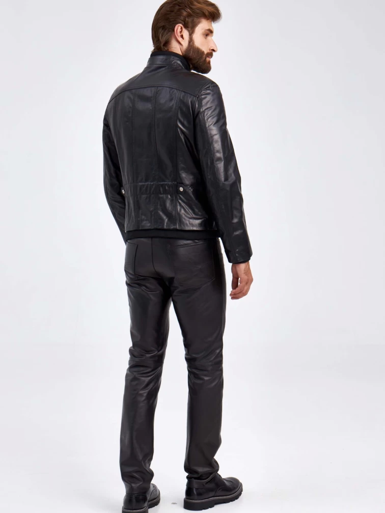 Мужская куртка в великолепной мягкой кожи-пуллап черного цвета застегивающаяся на молнию. Полуприлегающего силуэта. Двойной воротник стойка: трикотаж в тандеме с кожей. Нагрудные накладные карманы с клапанами застегивающиеся кнопками. Боковые на молниях. Пояс и манжеты модели дополнены плотной трикотажной резинкой. Идеальная посадка по фигуре.