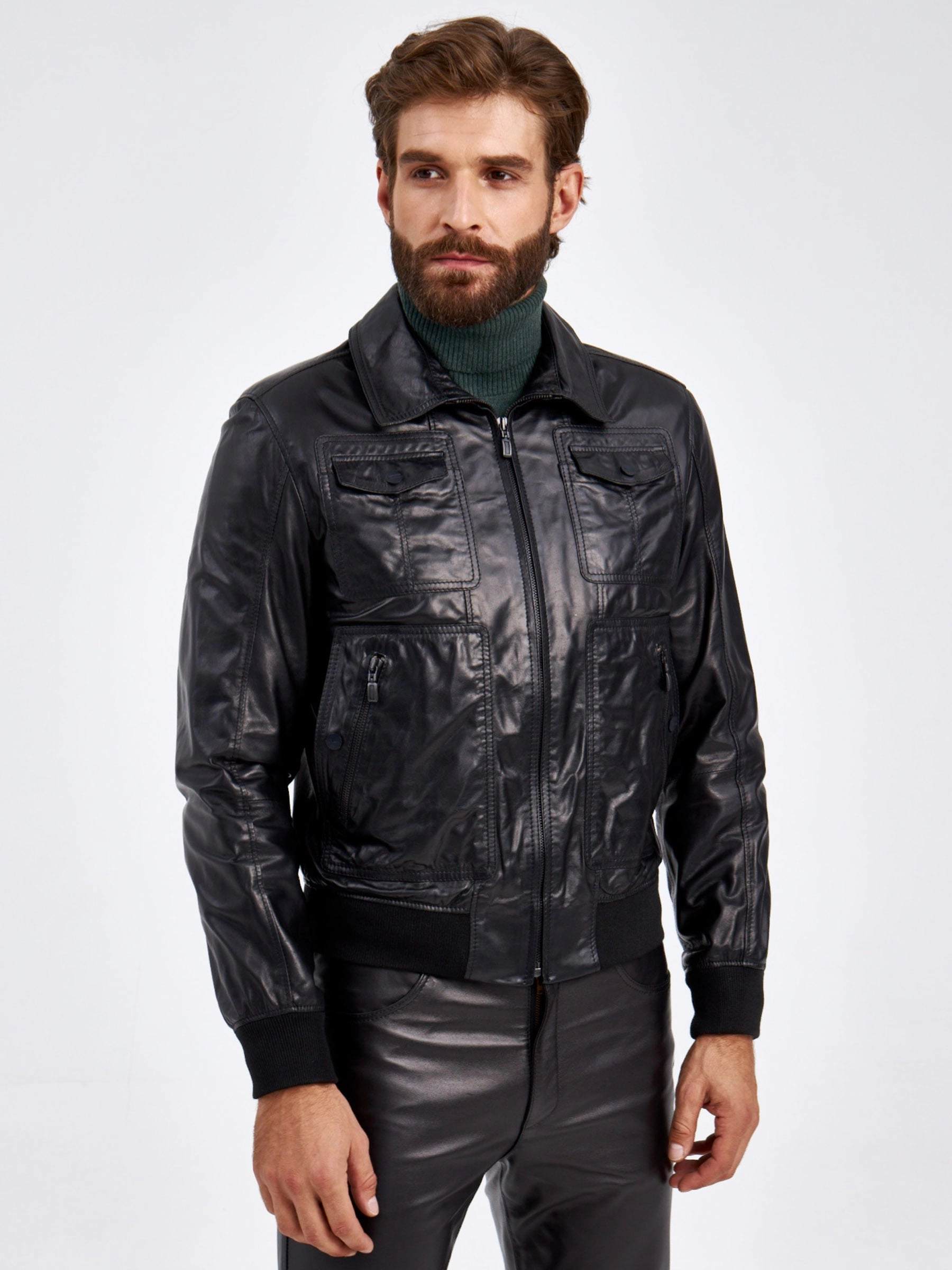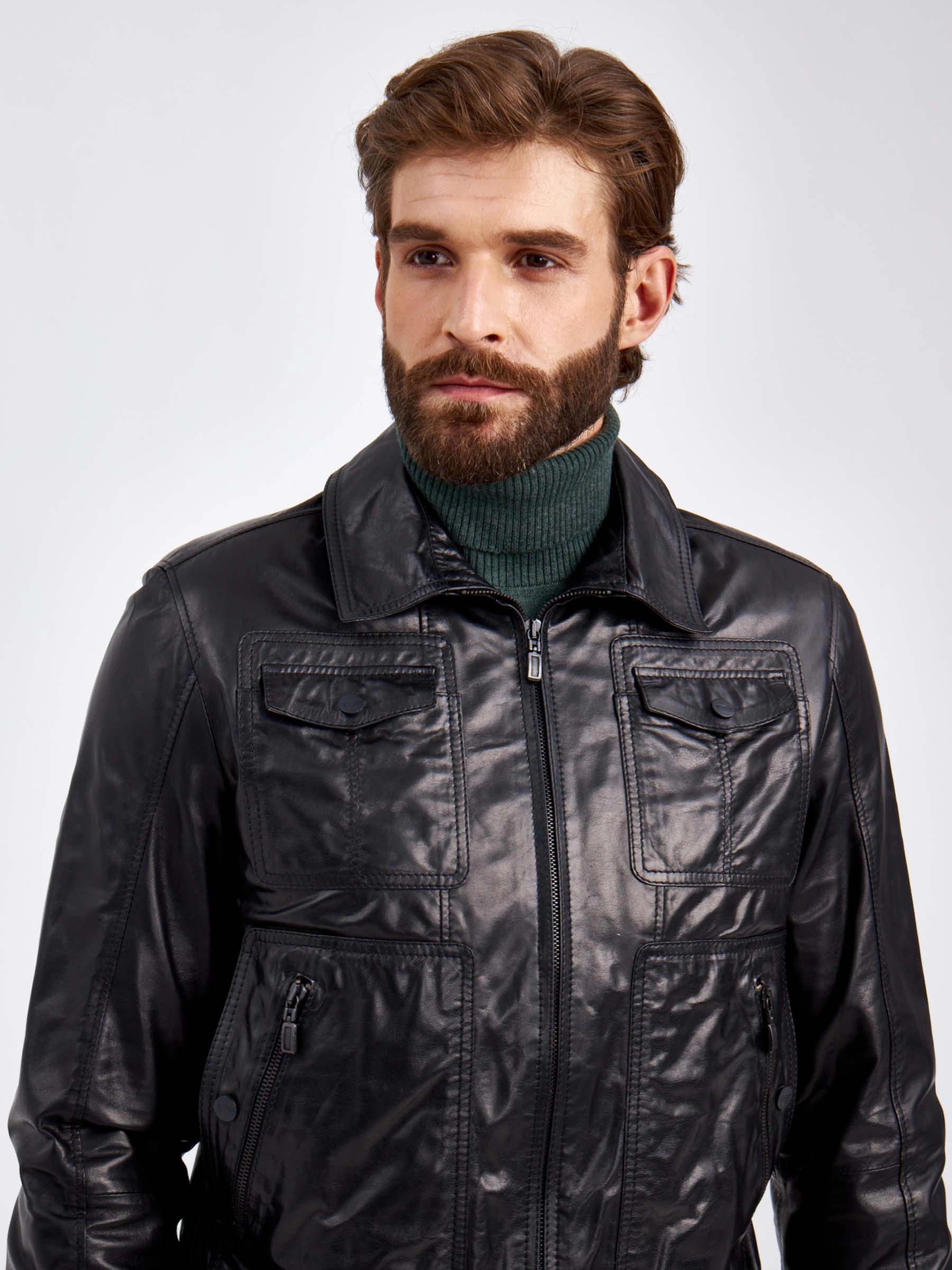 Мужская куртка в великолепной мягкой кожи-пуллап черного цвета застегивающаяся на молнию. Полуприлегающего силуэта. Воротник-отложной. Нагрудные накладные карманы с клапанами на кнопках. Боковые на молниях. Пояс и манжеты модели дополнены плотной трикотажной резинкой. Идеальная посадка по фигуре.