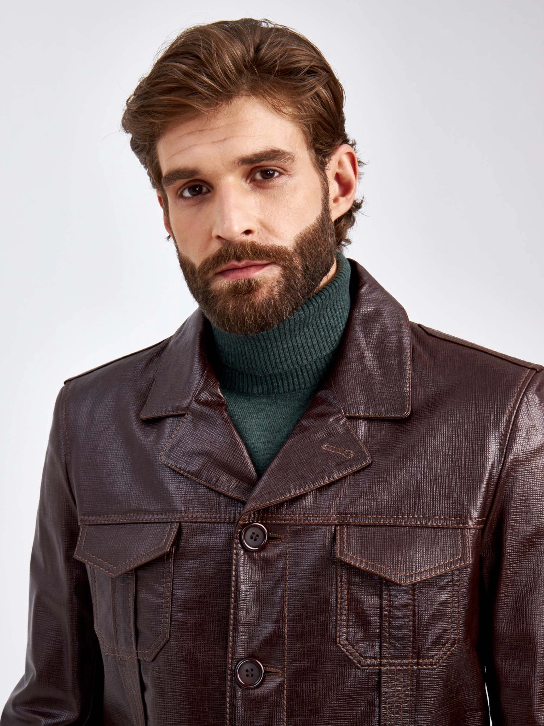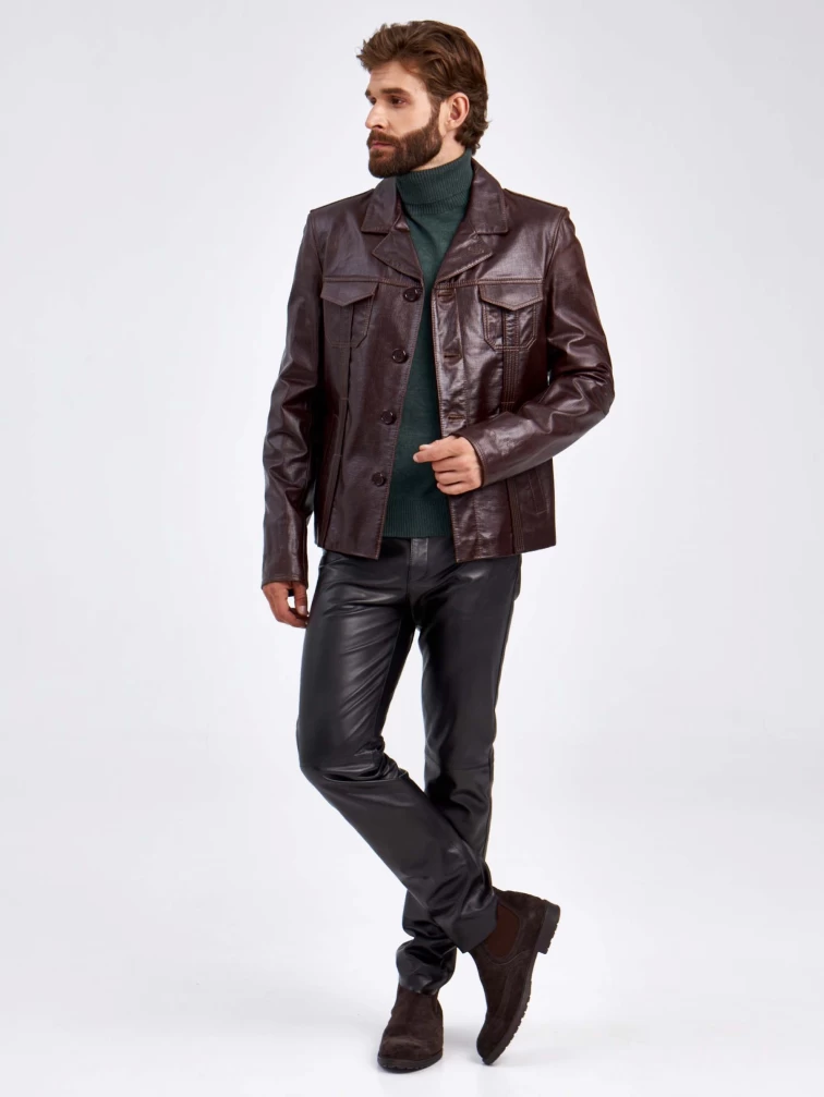 Короткий кожаный мужской пиджак 2010-7, коричневый, размер 48, артикул 29310