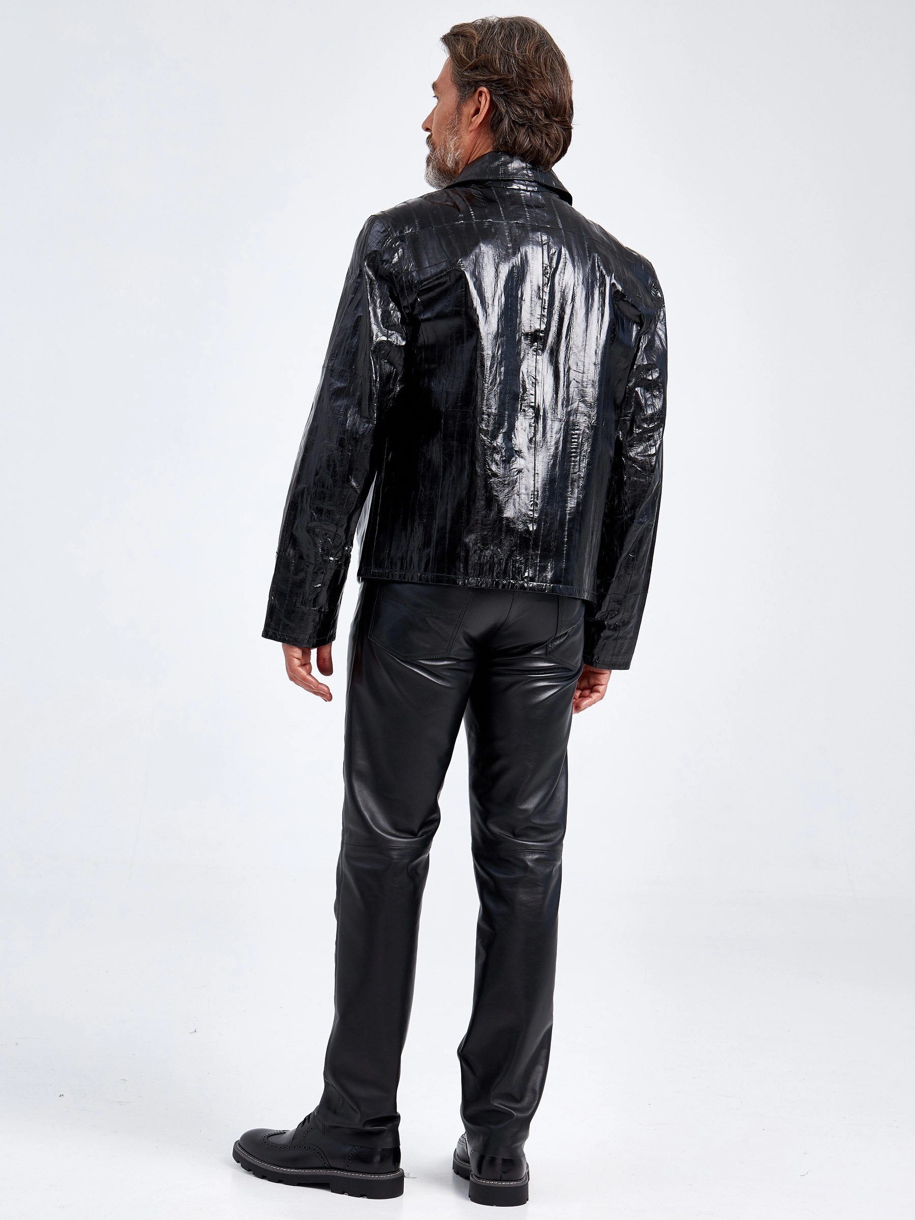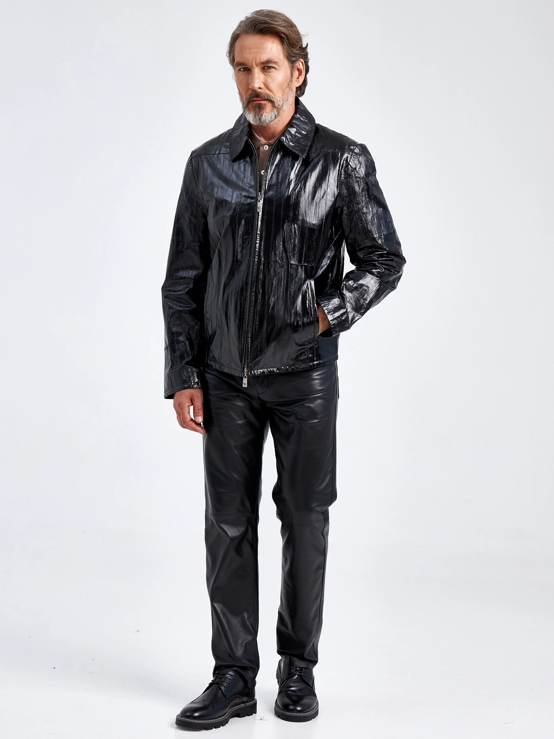 Эксклюзивная мужская куртка из кожи угря. Эта кожа соединяет в себе то, что нельзя не оценить: отличное сверхпрочное качество, необычайную нежность и мягкость. Ее особенность в том, что она имеет так называемый «полосатый» узор, который придает особую привлекательность. Каждая полоска за счет естественных неровностей имеет свою уникальную структуру. Прямой силуэт, отложной воротник и никакой лишней фурнитуры. Все максимально лаконично. Идеальное сочетание с кожаными брюками.