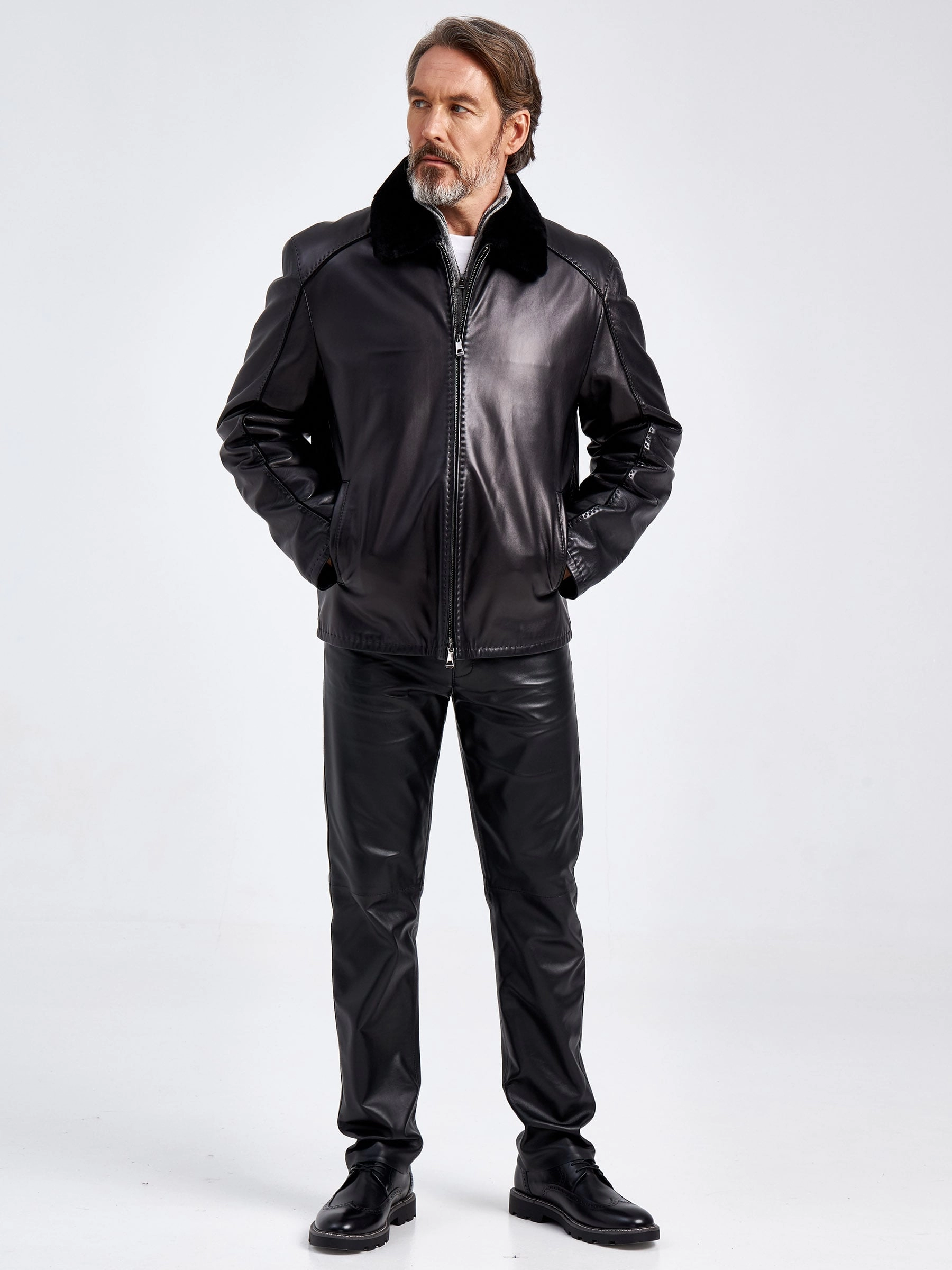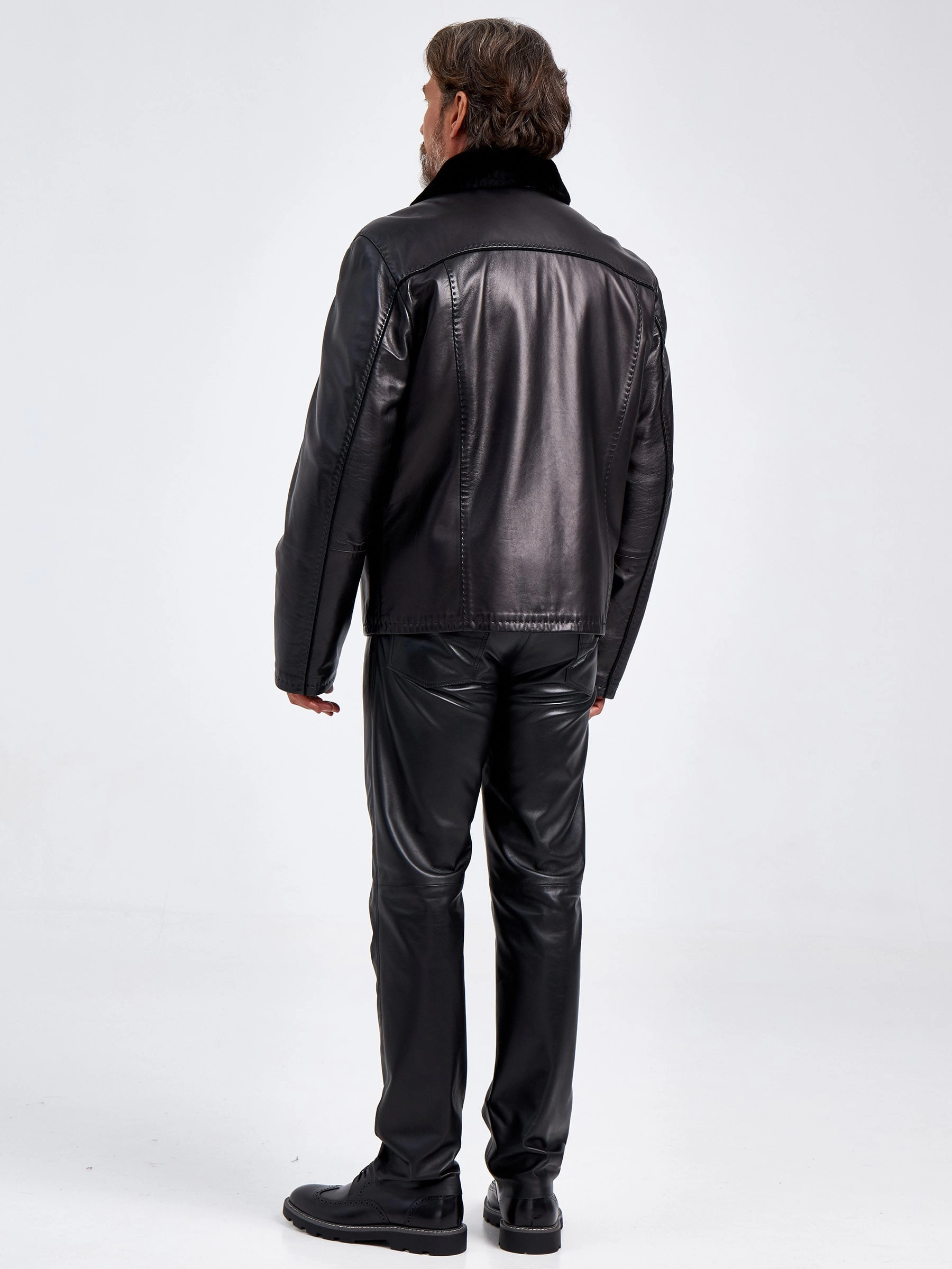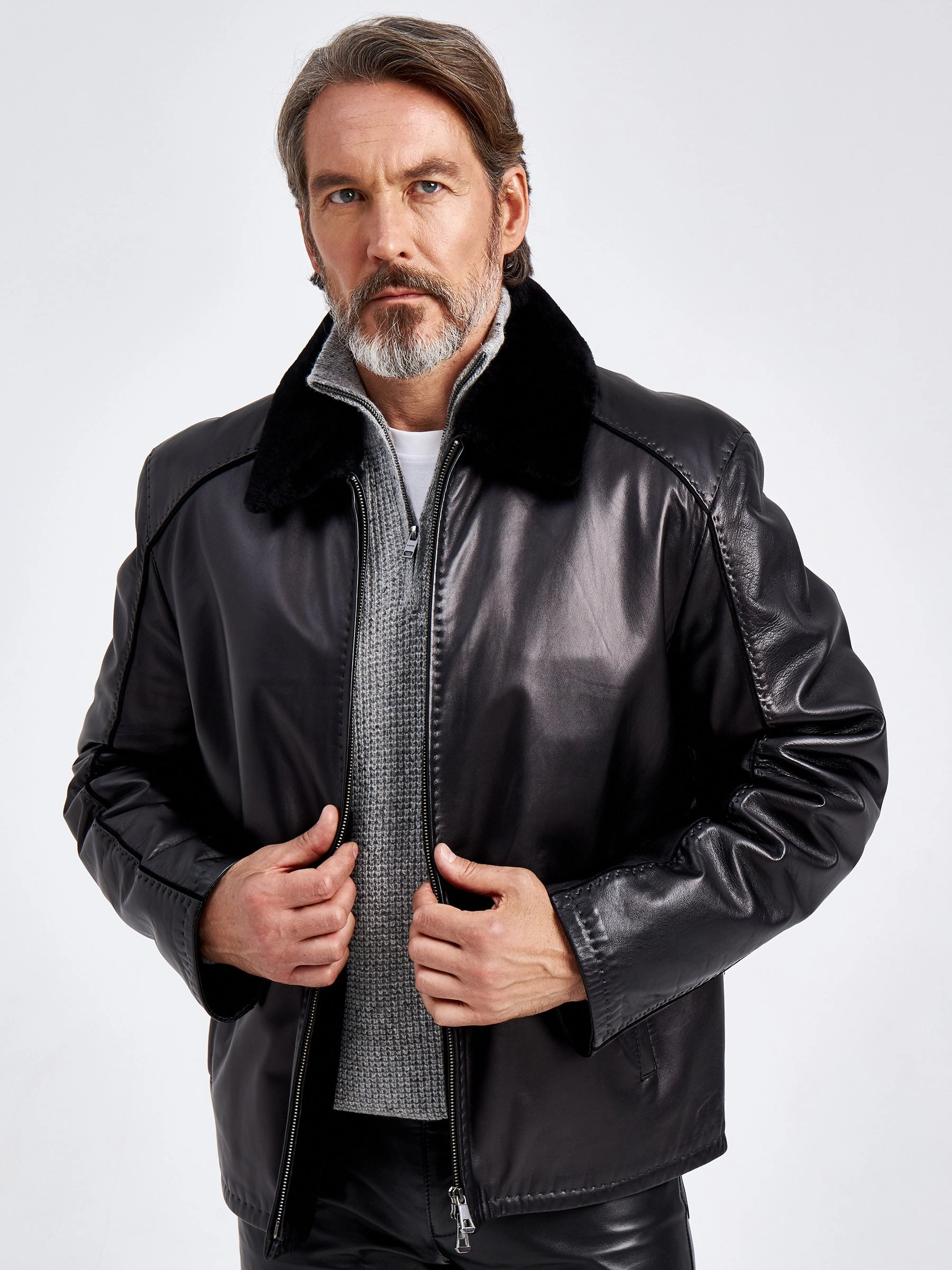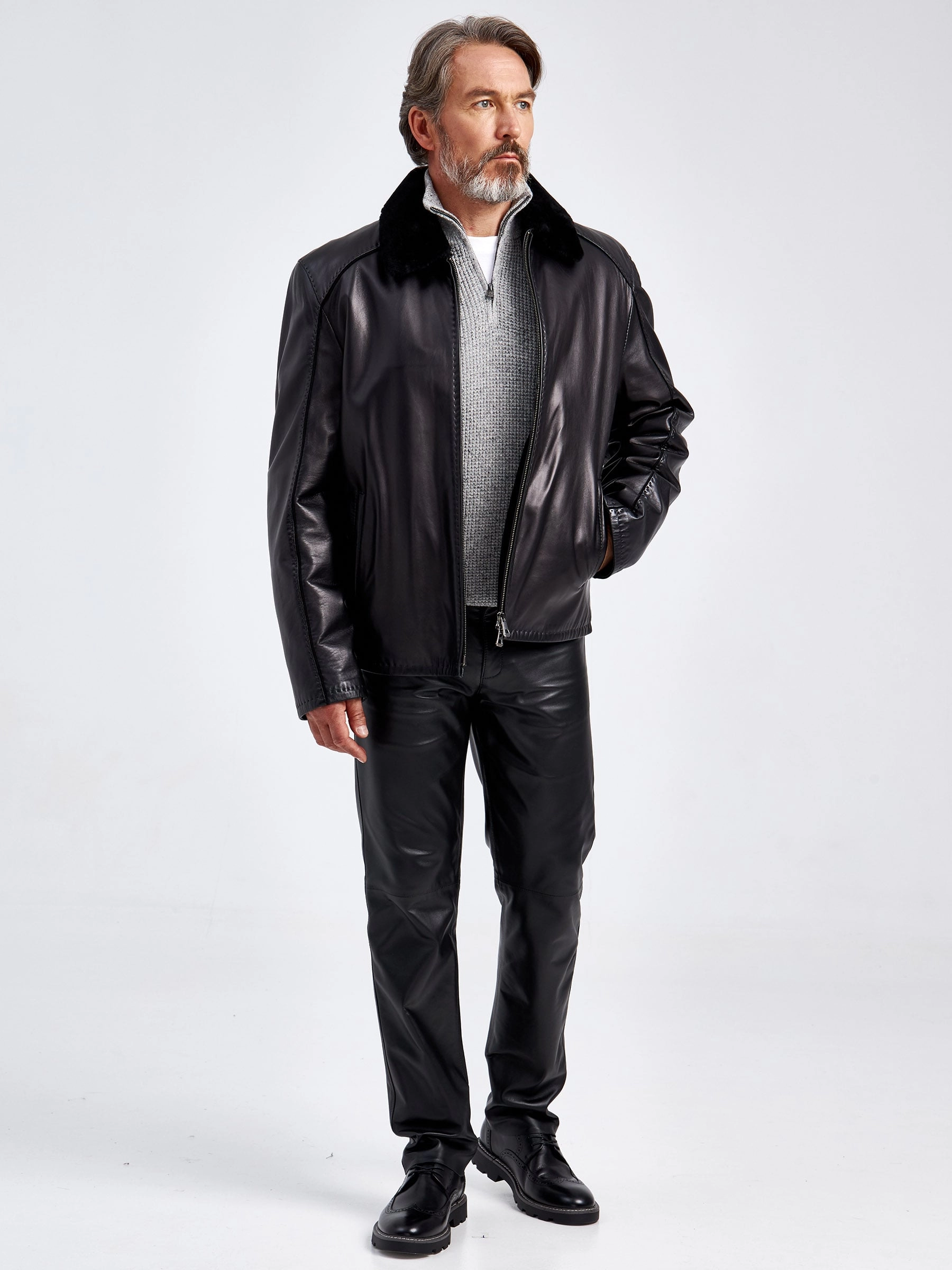 Кожаная мужская зимняя куртка на подкладке из овчины 4615, черная, размер 54, артикул 40550