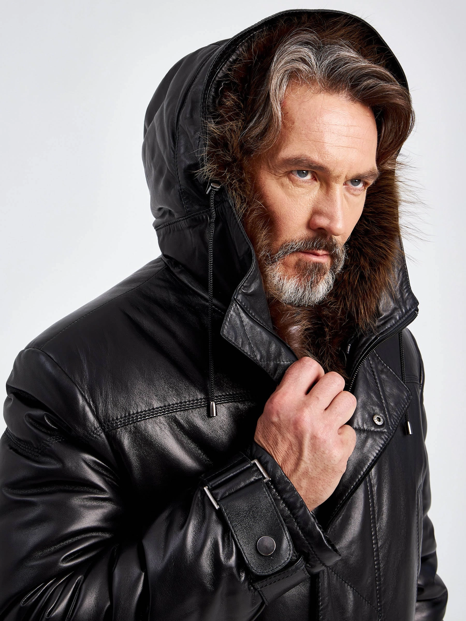 Зимняя мужская кожаная куртка с капюшоном на подкладке из меха енота 511, черная, размер 56, артикул 40730
