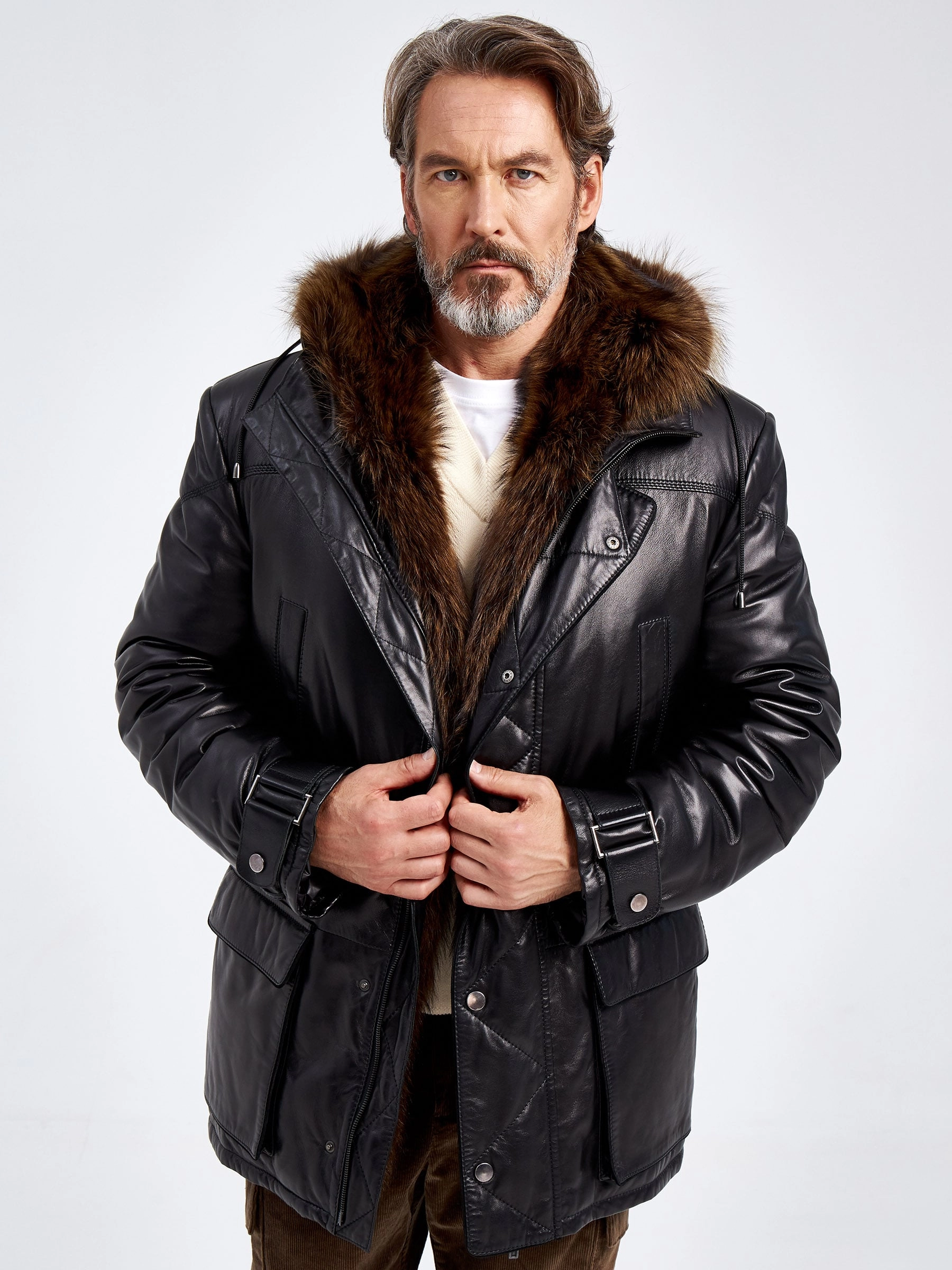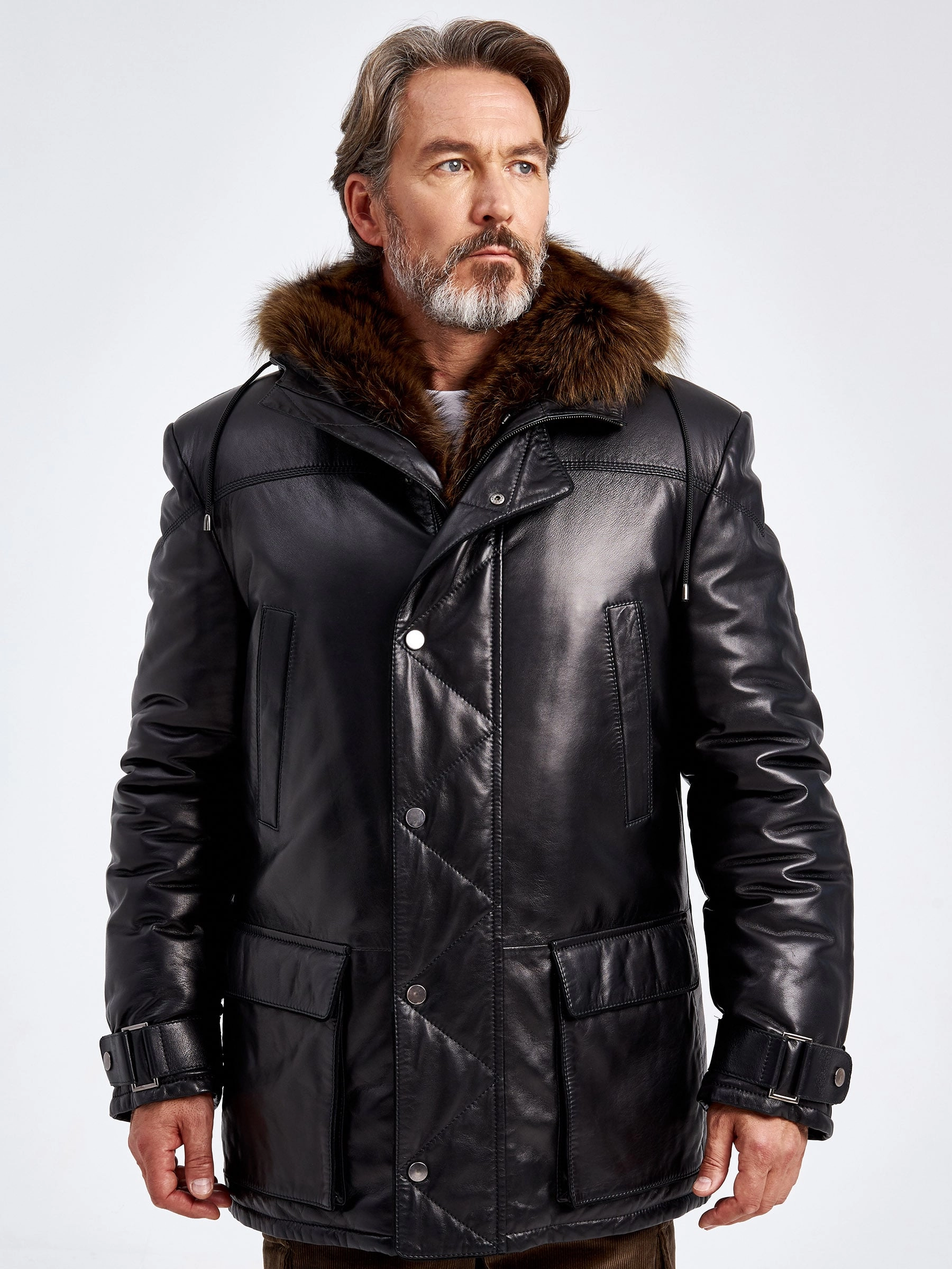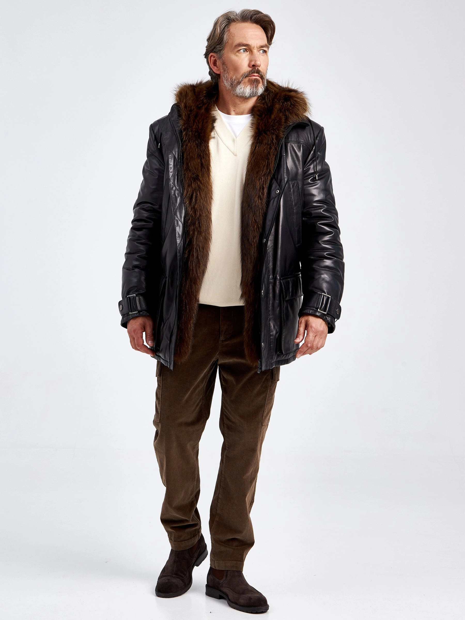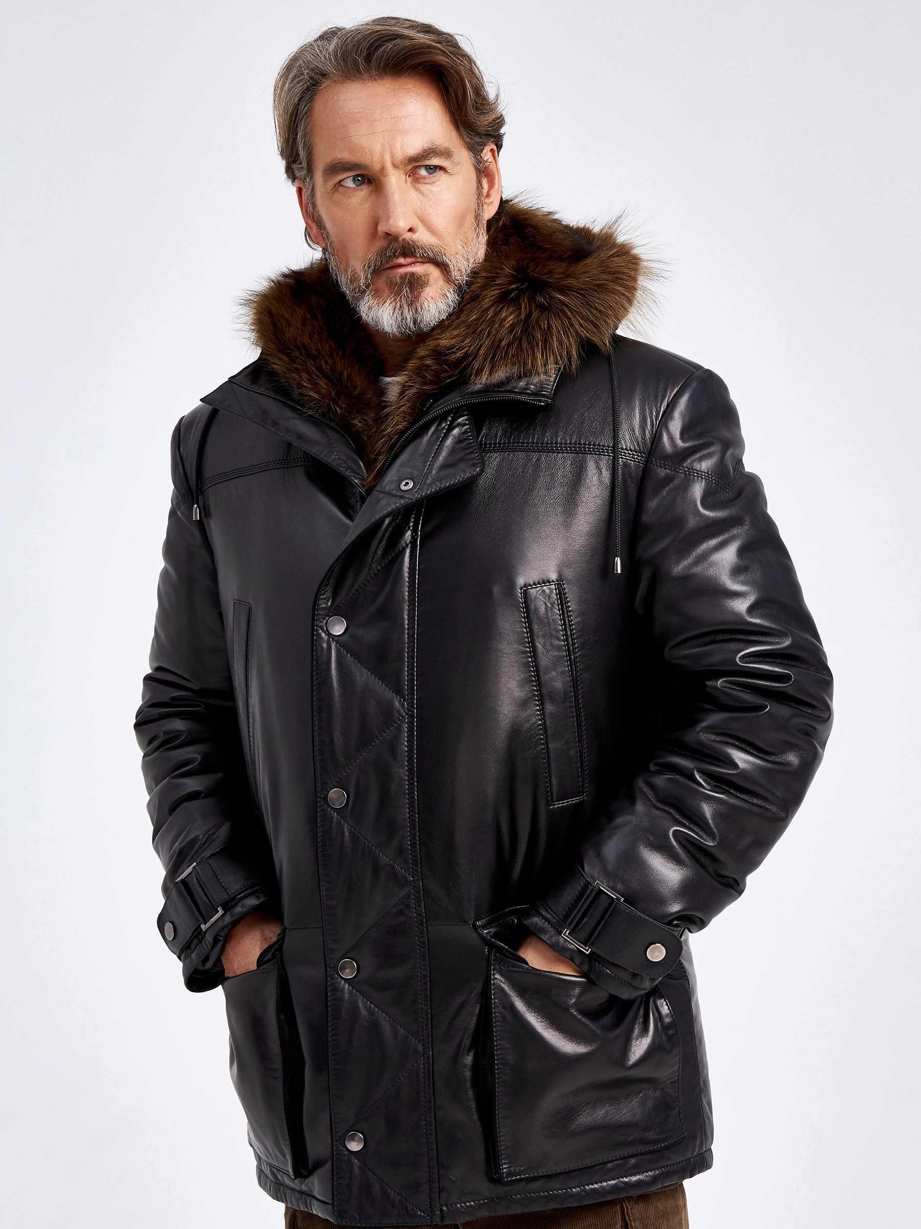 Товар зимняя мужская кожаная куртка с капюшоном на подкладке из меха енота 511, черная, размер 56, артикул 40730 выполнен из натуральной кожи с застежкой молния. Рассчитан на сезон: осень-зима. Длина изделия 75-90 см, силуэт прямой.