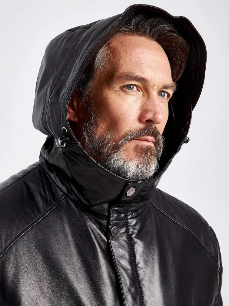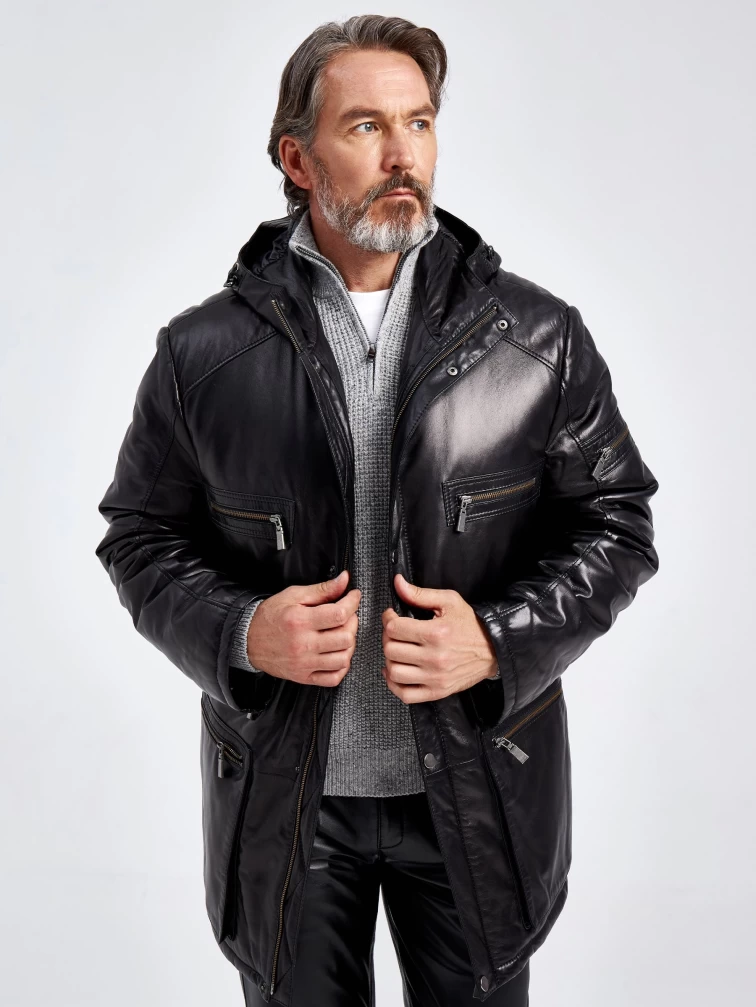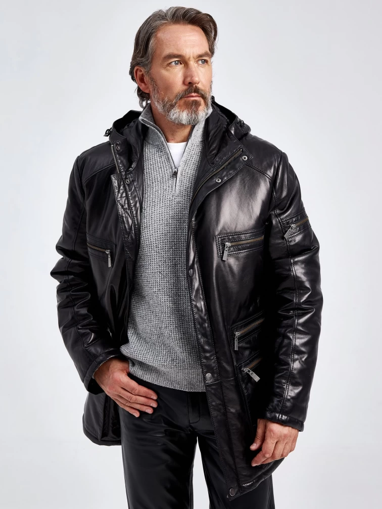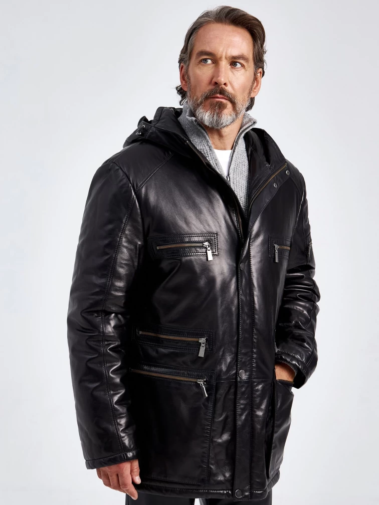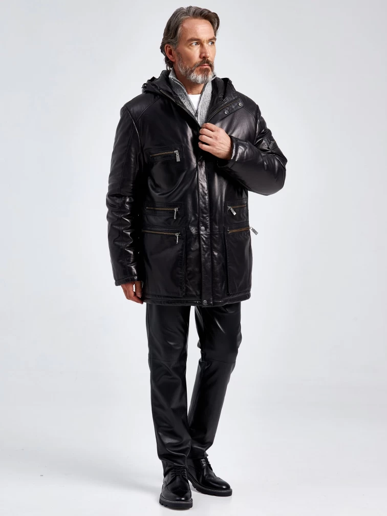 Эта куртка абсолютно беспроигрышный вариант для холодной погоды. Универсальный черный цвет, прямой силуэт, качественная кожа, множество карманов, удобный капюшон Идеальная посадка. Великолепное сочетание как с классическими брюками, так и с повседневными джинсами.
