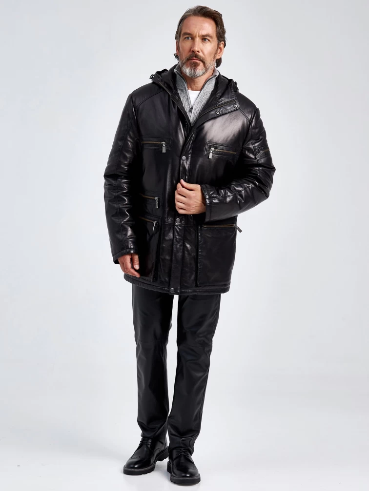 Товар утепленная мужская кожаная куртка с капюшоном 513, черная, размер 56, артикул 29100 выполнен из натуральной кожи с застежкой молния. Рассчитан на сезон: демисезон. Длина изделия 75-90 см, силуэт прямой.