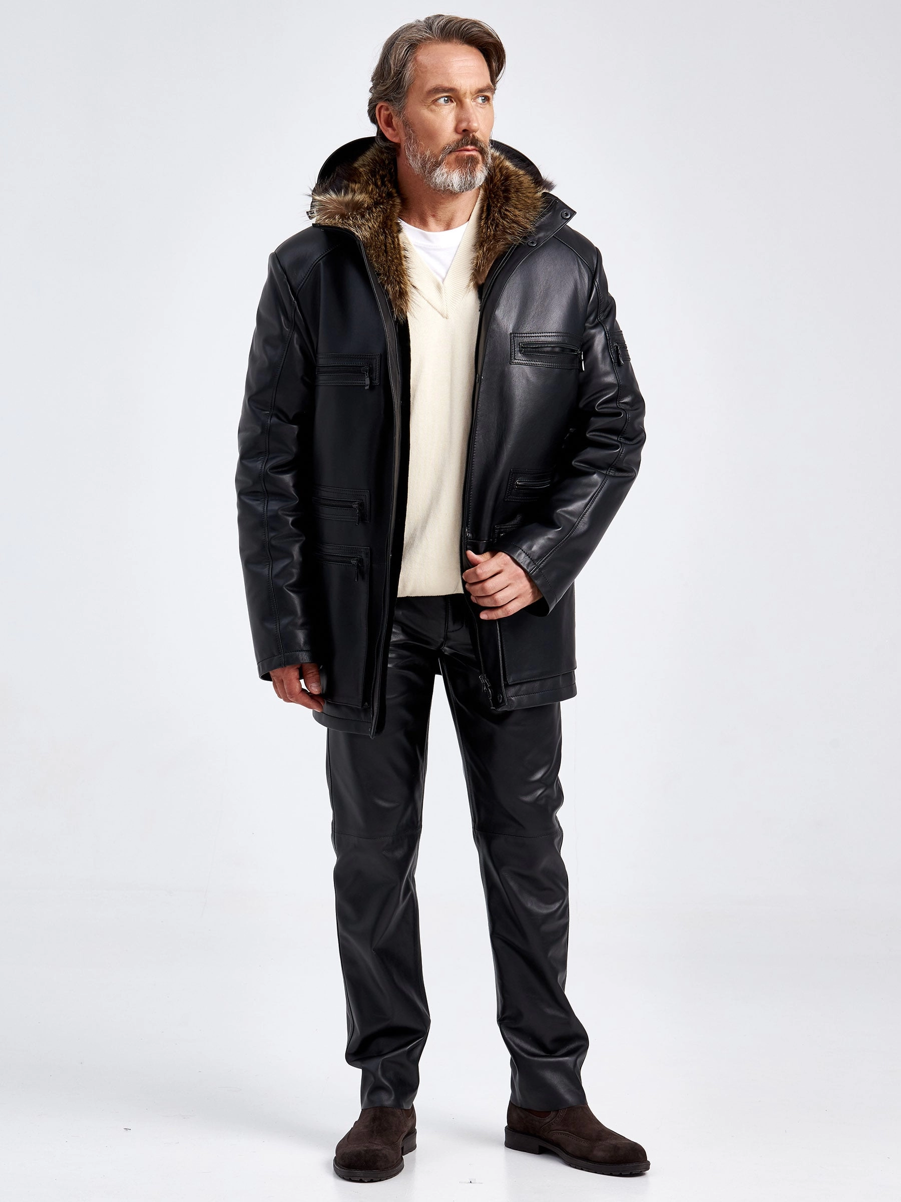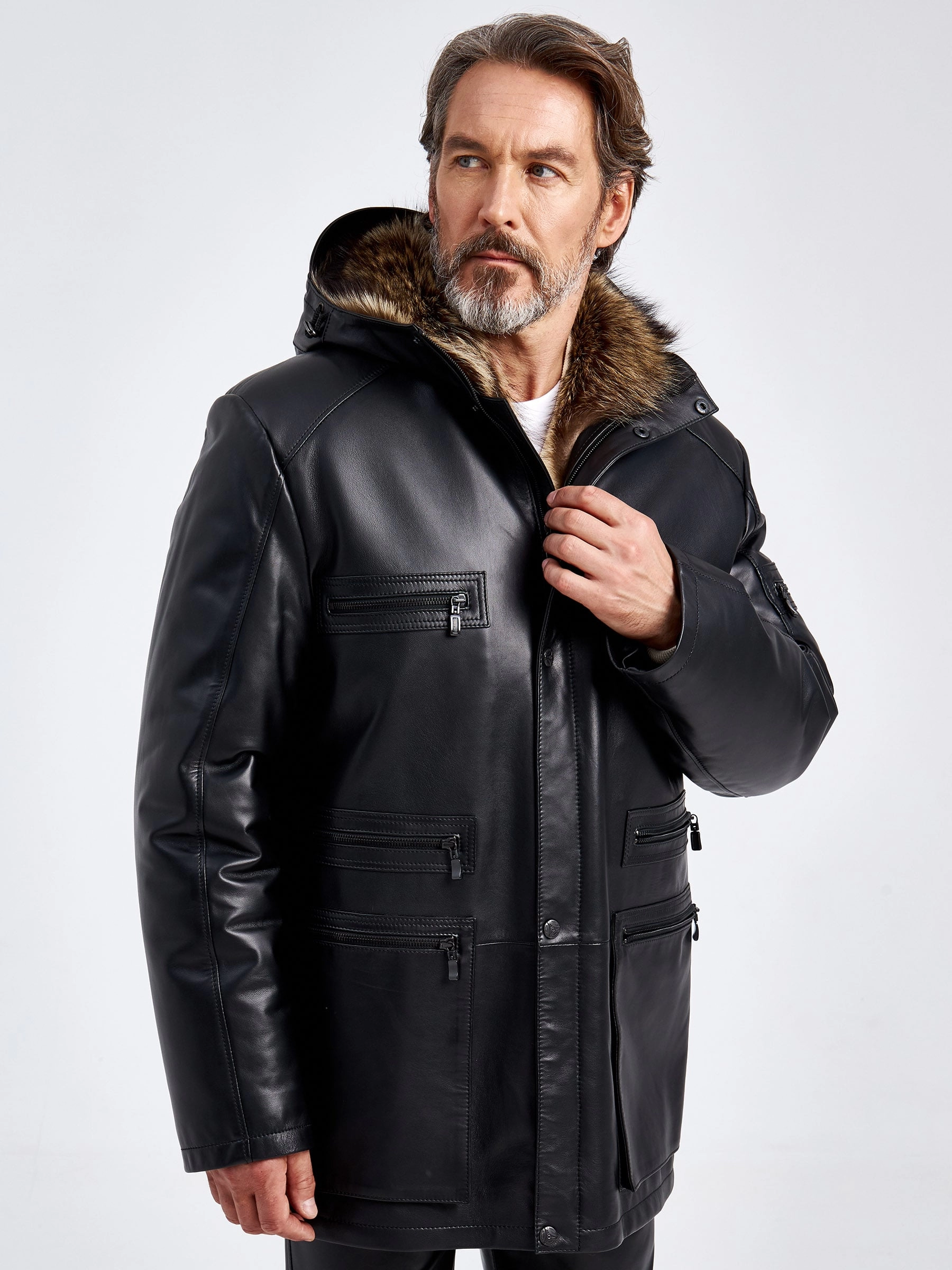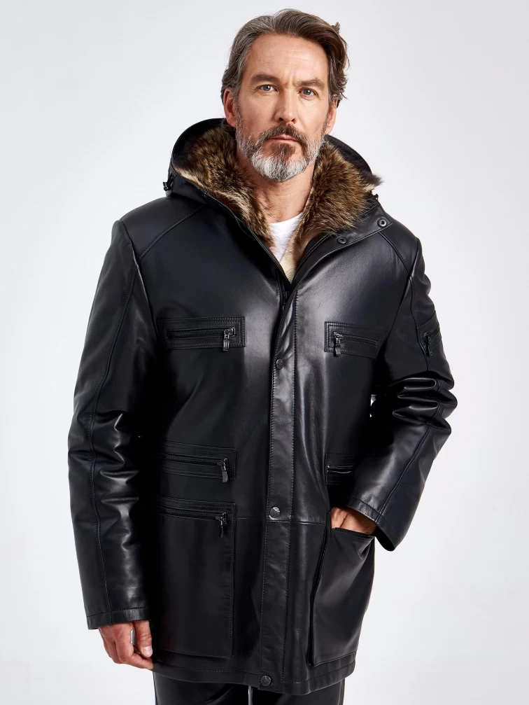 В холодное время никак не обойтись без классической куртки в универсальном черном цвете. Мастера Primo Vello использовали натуральную мягкую кожу и плотную овчину с густым ворсом, которая хорошо сохраняет тепло. Прямой силуэт, множество удобных карманов. За дополнительную защиту от ветра отвечает утепленный мехом енота капюшон с козырьком.