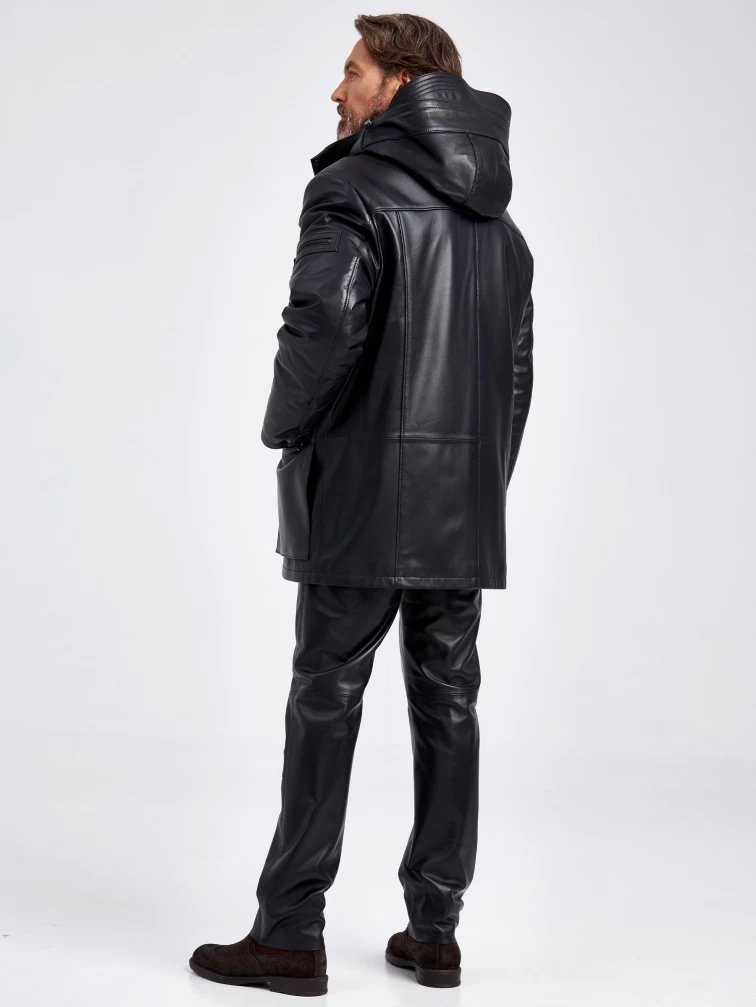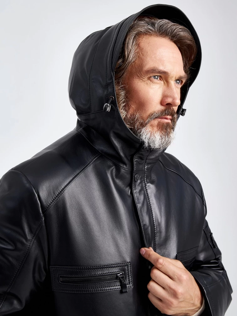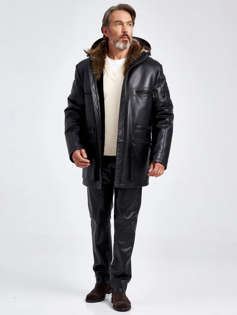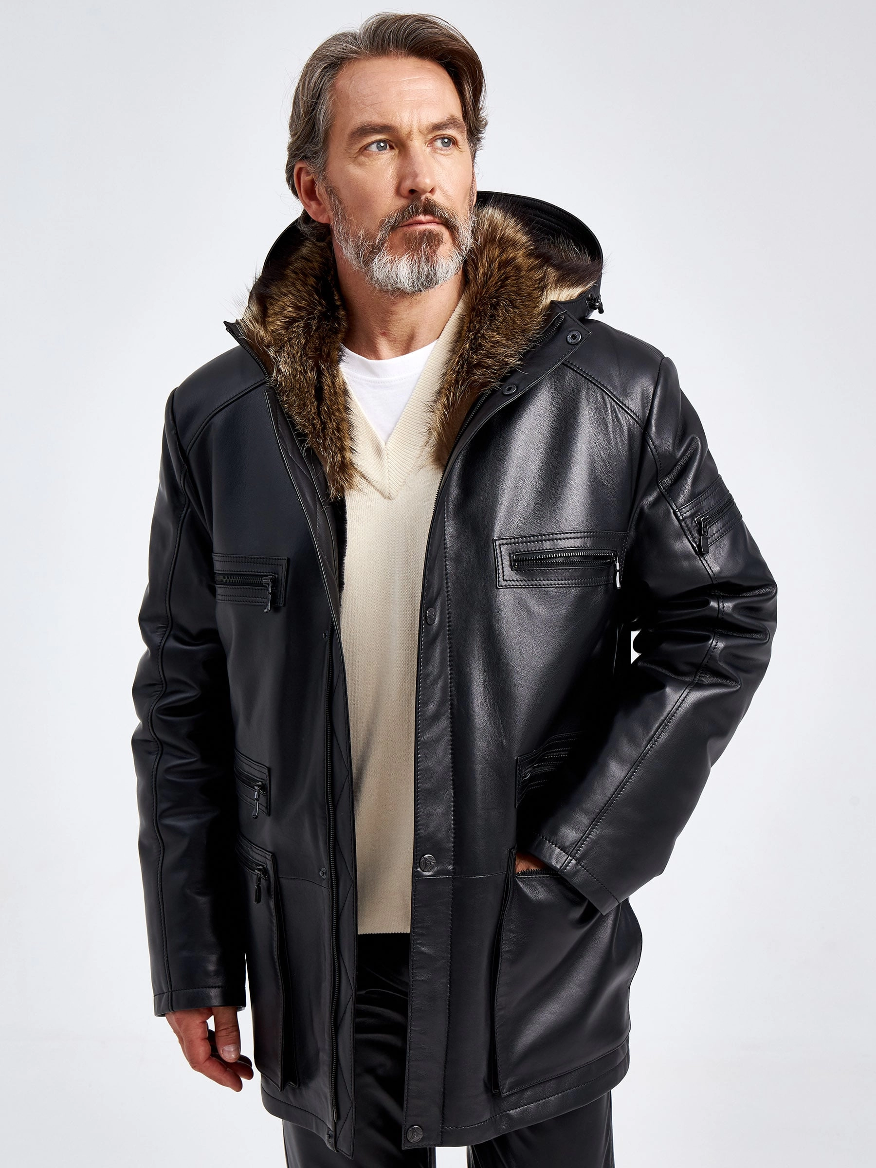 В холодное время никак не обойтись без классической куртки в универсальном черном цвете. Мастера Primo Vello использовали натуральную мягкую кожу и плотную овчину с густым ворсом, которая хорошо сохраняет тепло. Прямой силуэт, множество удобных карманов. За дополнительную защиту от ветра отвечает утепленный мехом енота капюшон с козырьком.