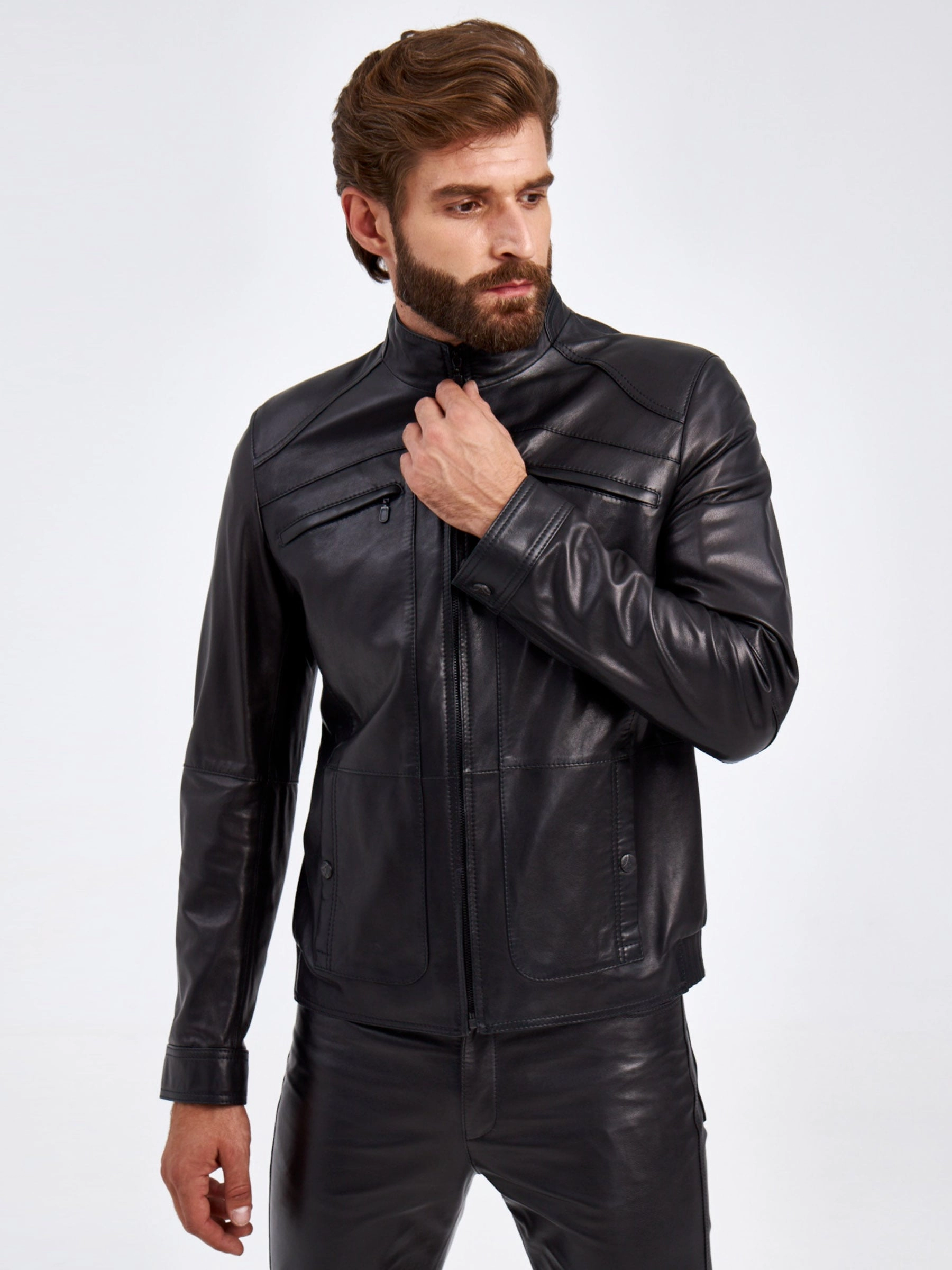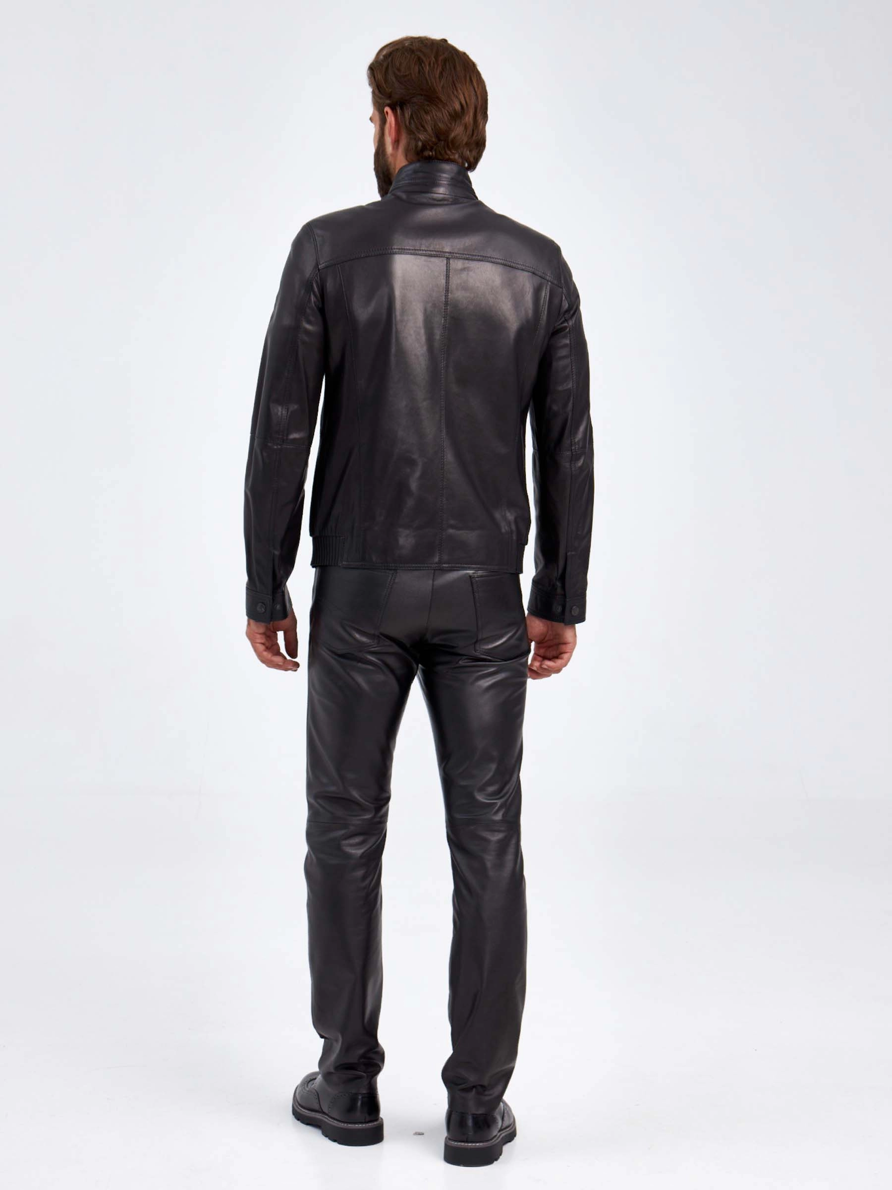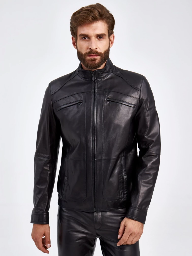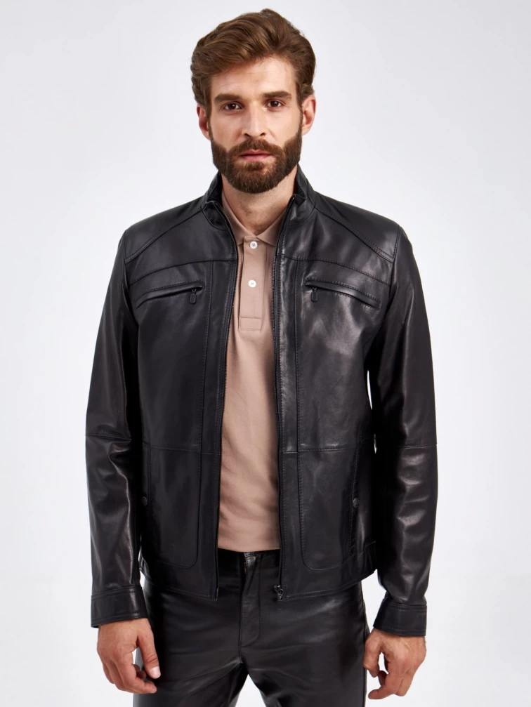 Мужская куртка в универсальном черном цвете. Кожа премиального качества. Воротник-стойка. Застёжка-молния. Рукав втачной. Нагрудные и боковые карманы на молниях. Предусмотрены удобные внутренние карманы для документов. Безупречная работа наших портных. Обеспечена идеальная посадка по фигуре и прекрасная свобода движений.