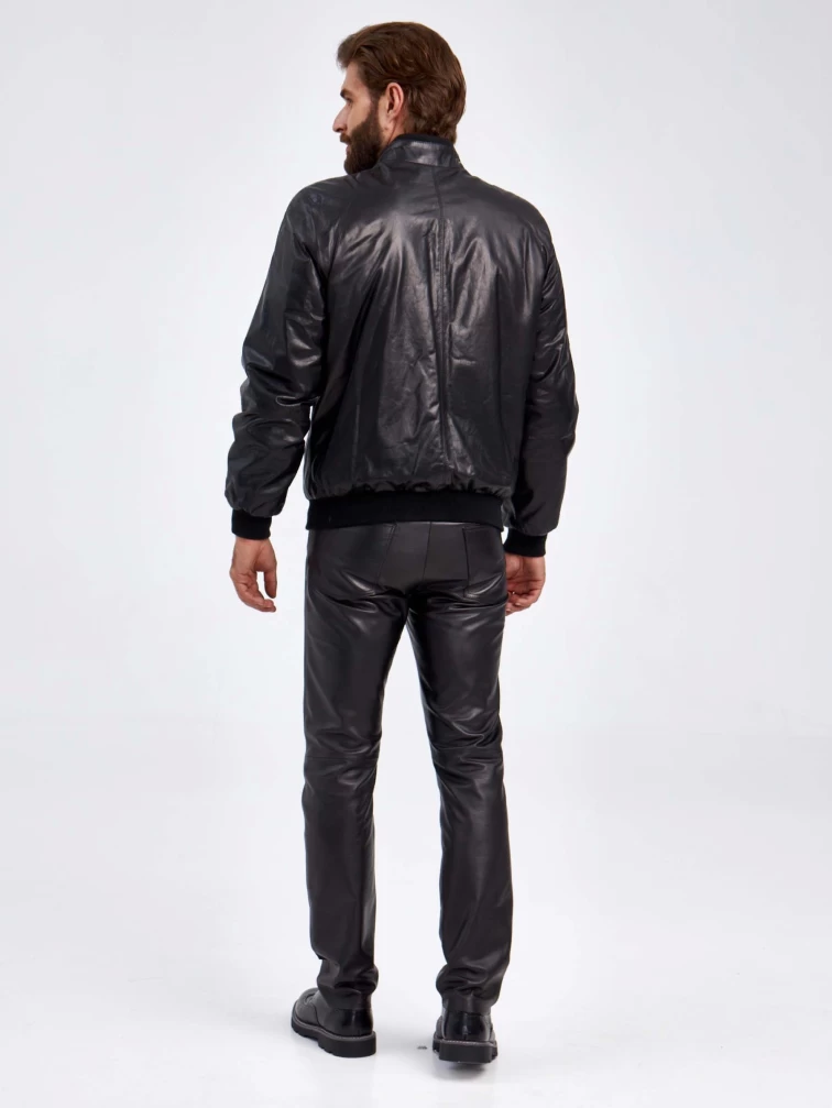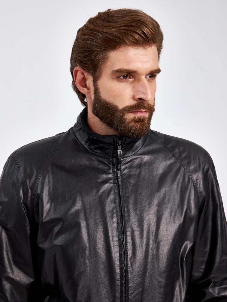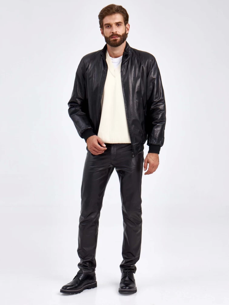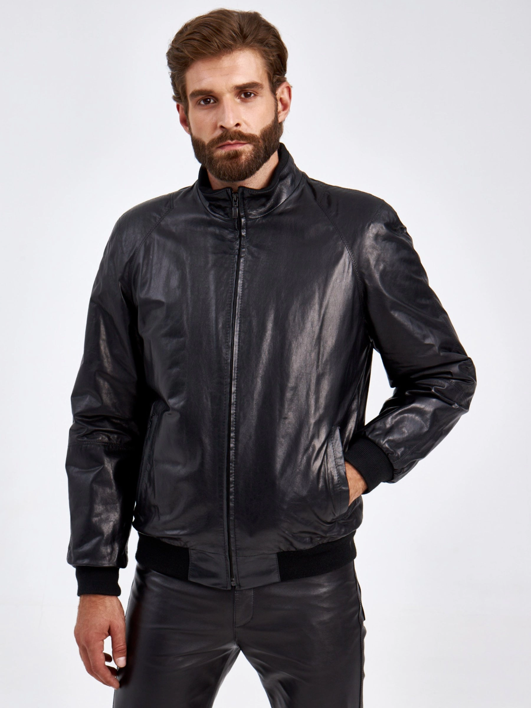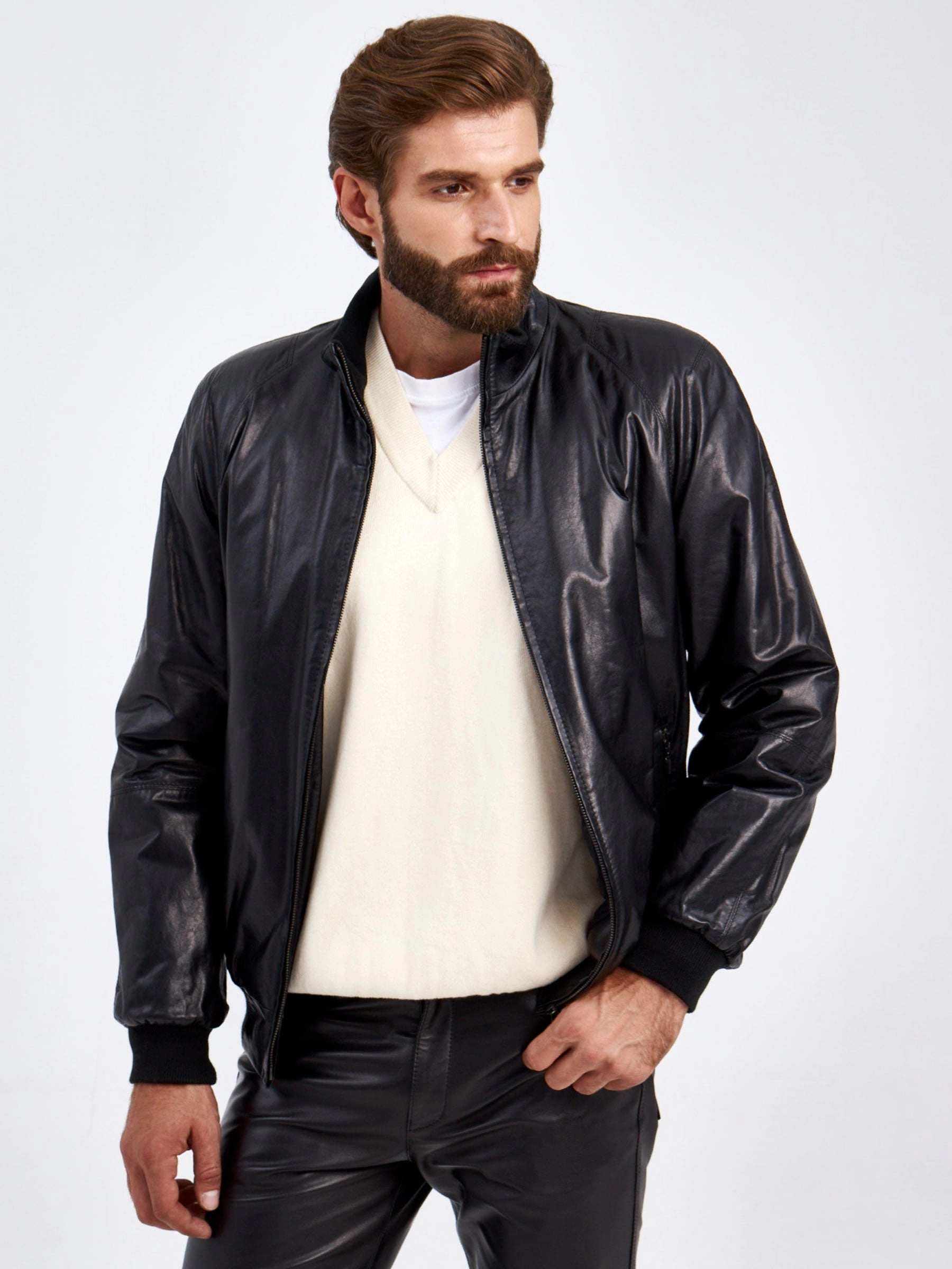 Демисезонная мужская кожаная куртка бомбер 524ш, черная, размер 52, артикул 29300