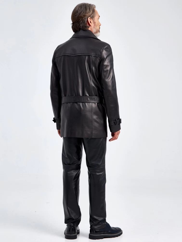 Двубортный мужской кожаный тренч на поясе 525, черный, размер 50, артикул 29060