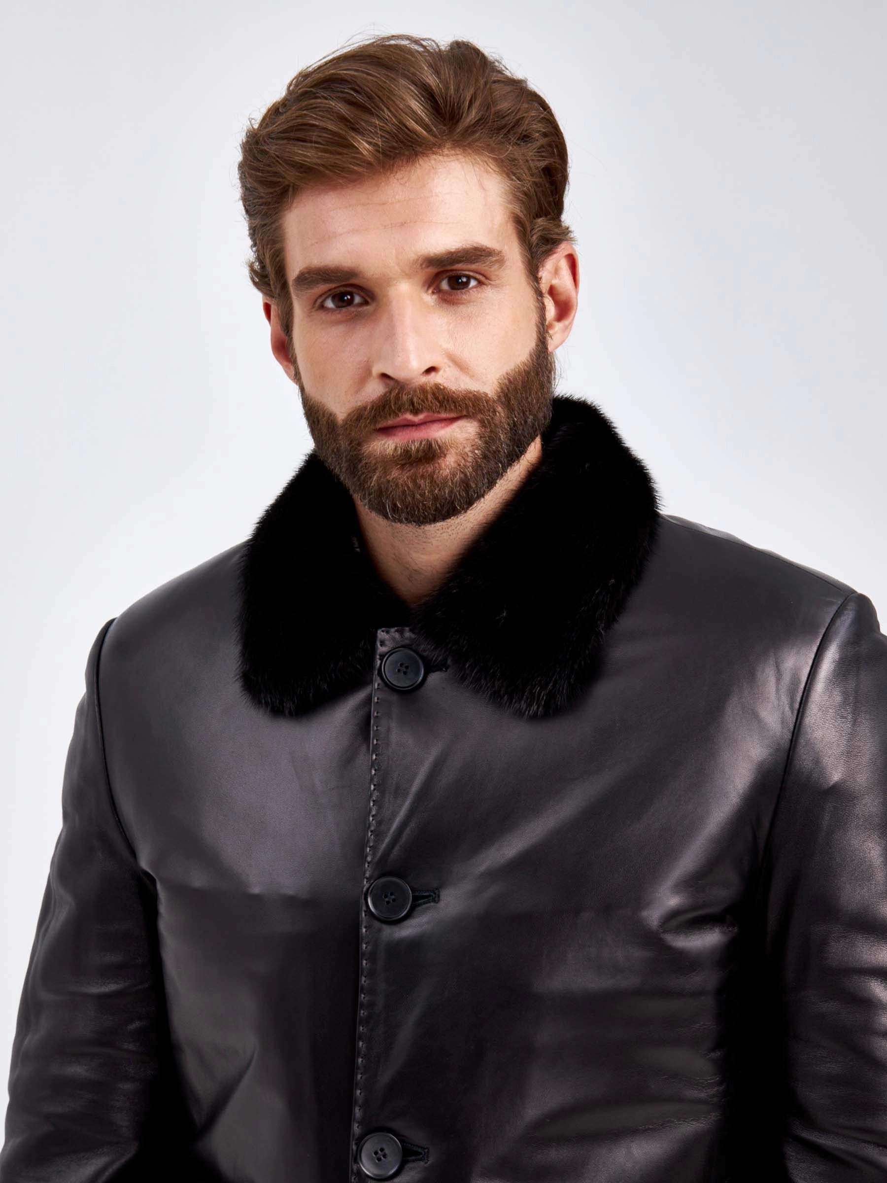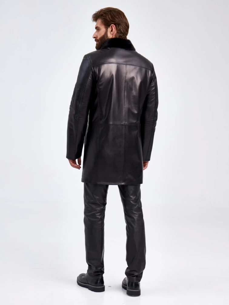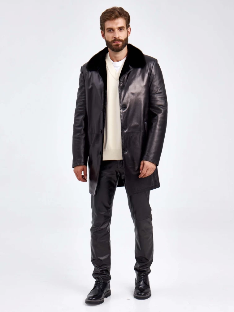 Товар кожаное мужское зимнее пальто на подкладке из овчины с норковым воротником 5365, черное, размер 46, артикул 29440 выполнен из натуральной кожи с застежкой пуговицы. Рассчитан на сезон: осень-зима. Длина изделия 90 см, силуэт прямой.