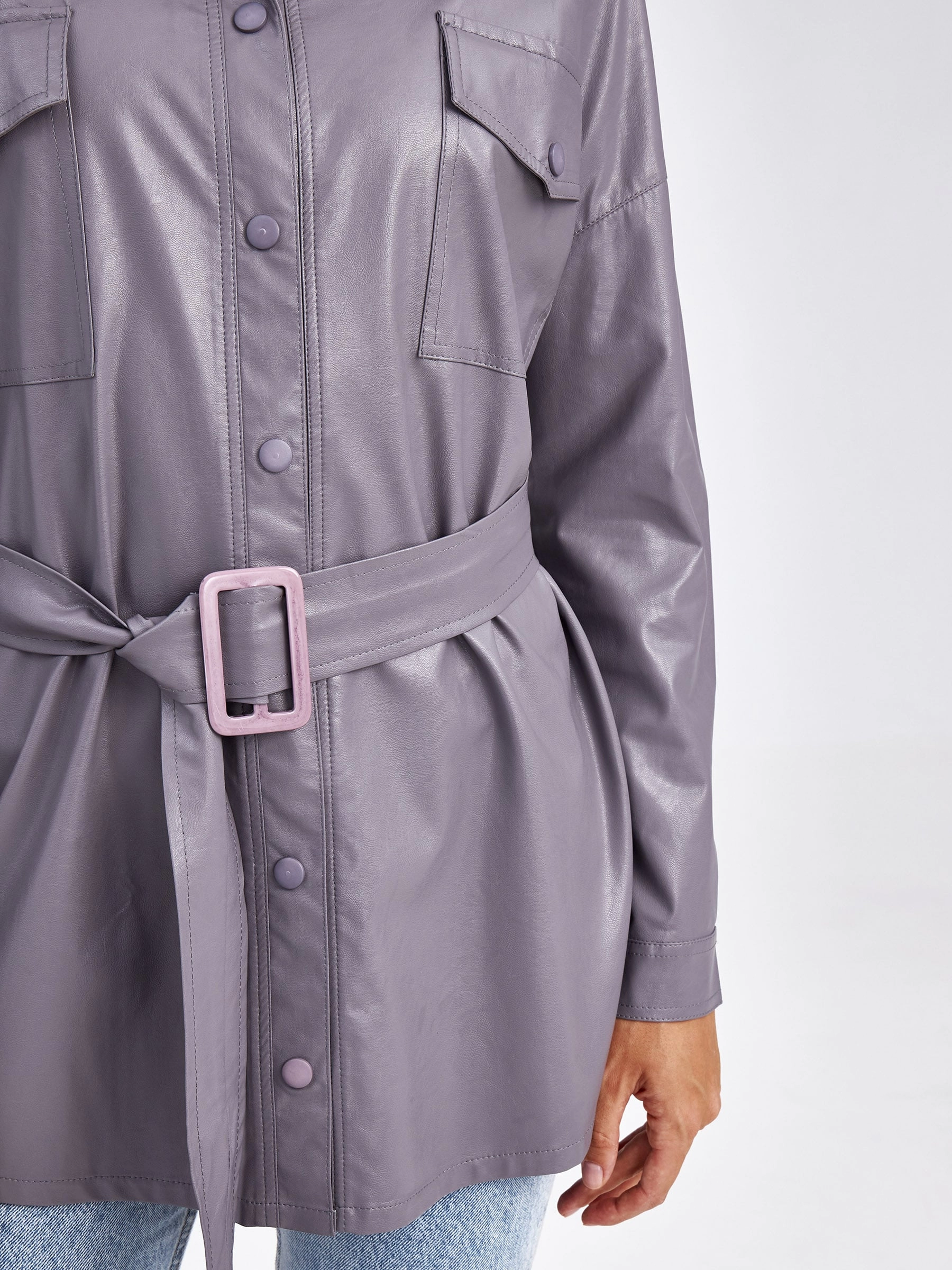 Трендовая модель из экокожи. Рубашка имеет отложной воротник, карманы на груди. Манжеты на рукавах застегиваются на кнопки. Дополнением послужит широкий пояс с пряжкой.