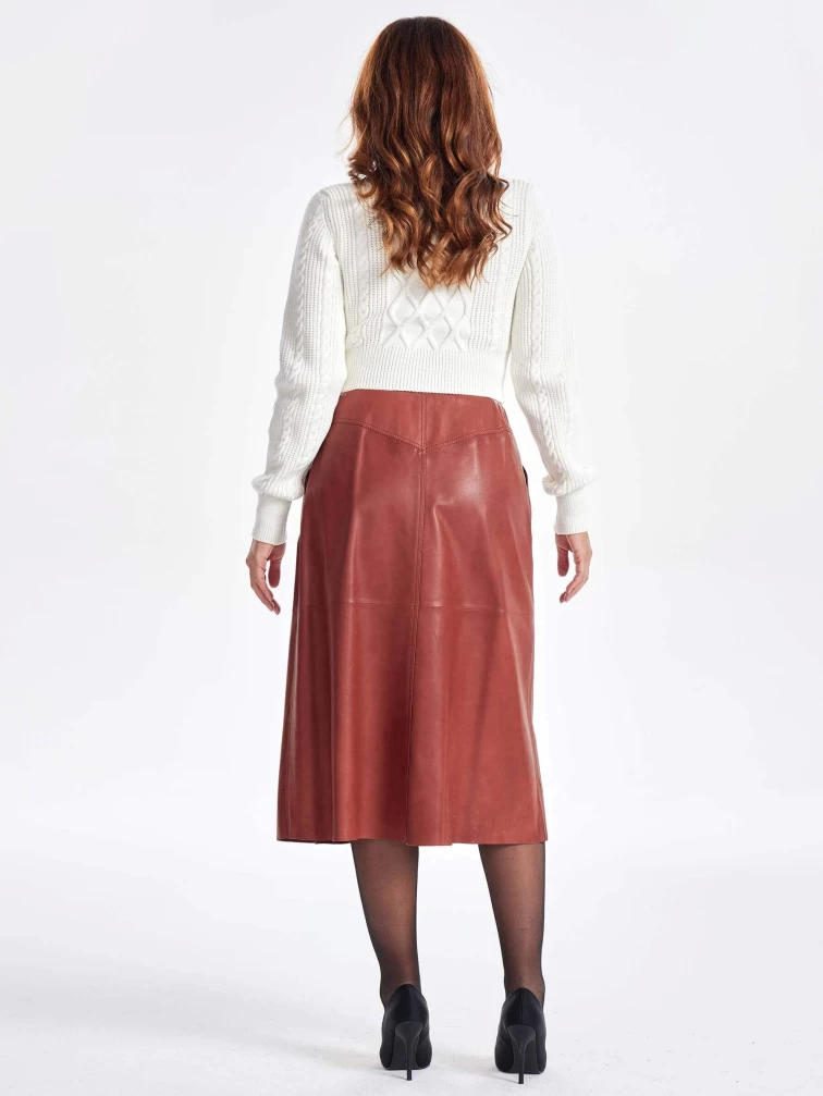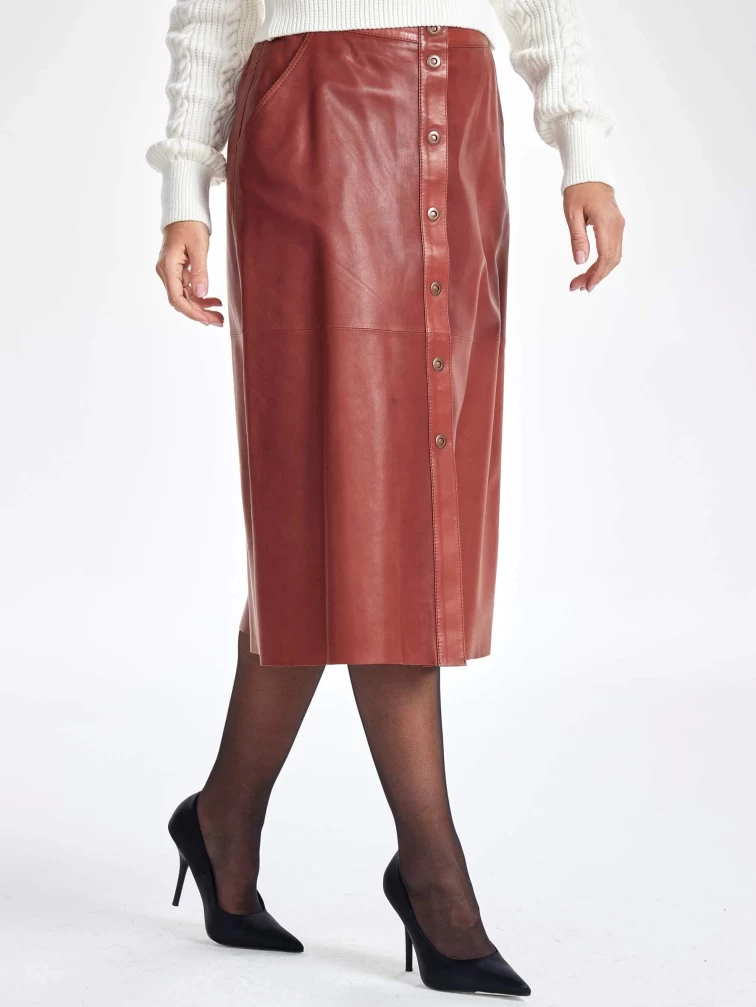 Длинная юбка из натуральной кожи на кнопках длиной 80 см с расклешённым силуэтом обеспечивает безупречную посадку. Мягкая кожа премиального качества идеально сочетается с облегающими водолазками, объёмными свитерами и кожаными косухами — дополните образ ботильонами или сапогами на каблуке, добавьте тонкие металлические аксессуары, чтобы создать стильный лук на любой случай. Эта универсальная модель одинаково хороша для элегантных, уютных и дерзких образов, подчёркивая индивидуальность и чувство стиля.