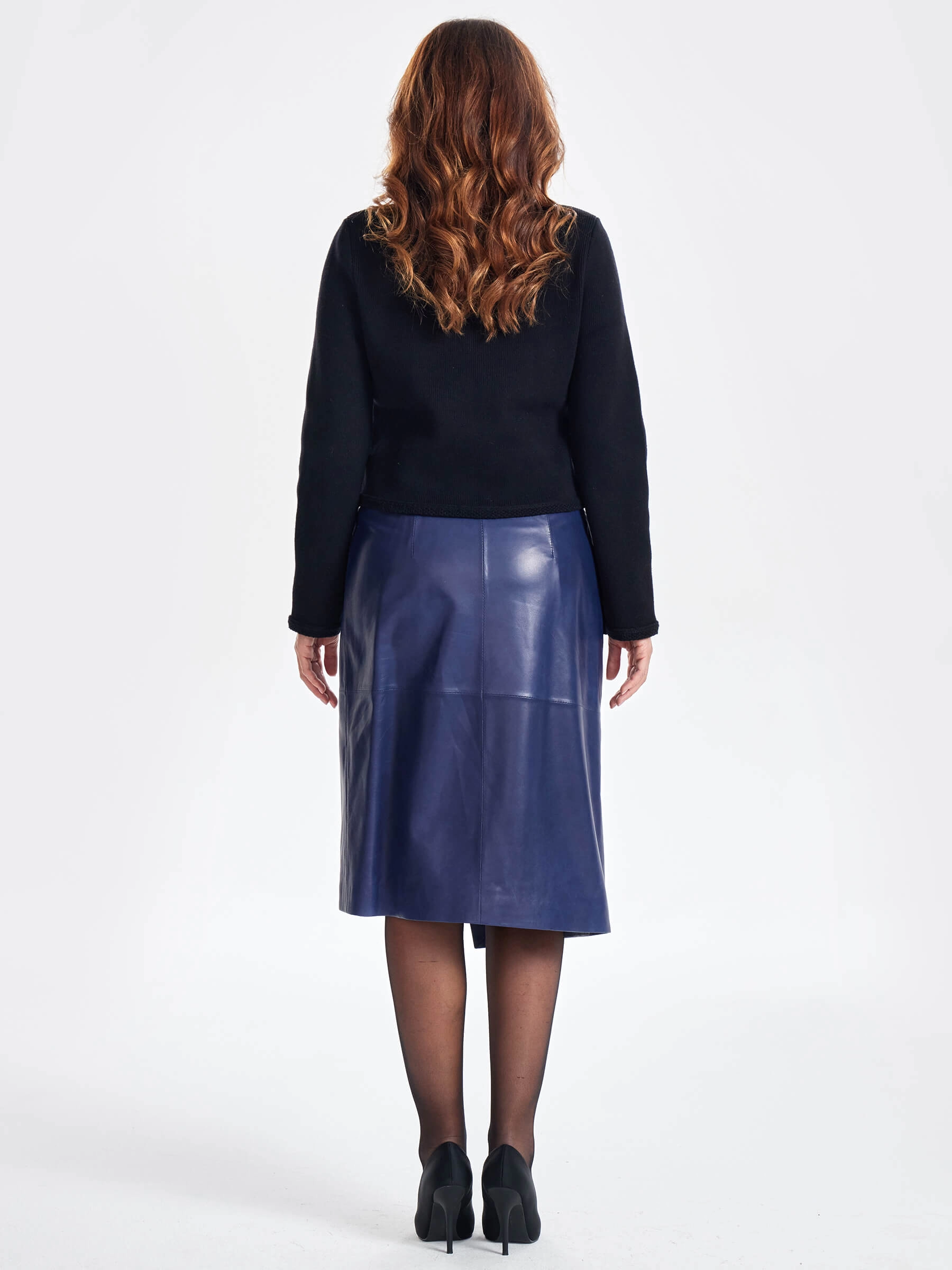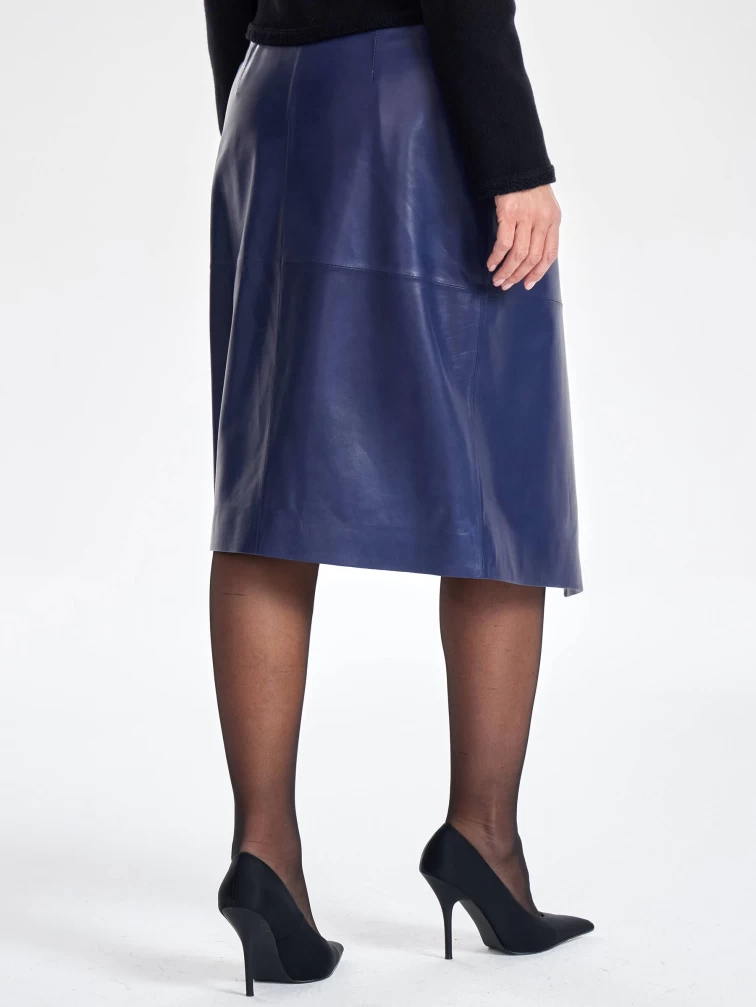 Товар кожаная юбка миди с запахом 07, синяя, размер 48, артикул 85371 выполнен из натуральной кожи с застежкой молния. Рассчитан на сезон: демисезон. Длина изделия 65 см, силуэт прямой.