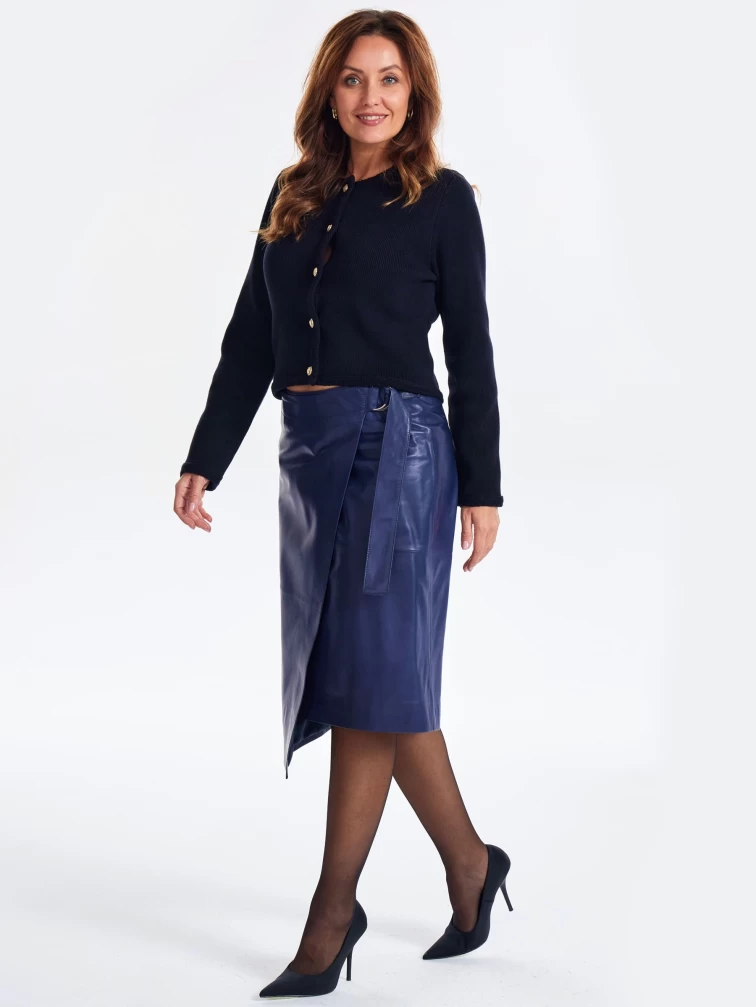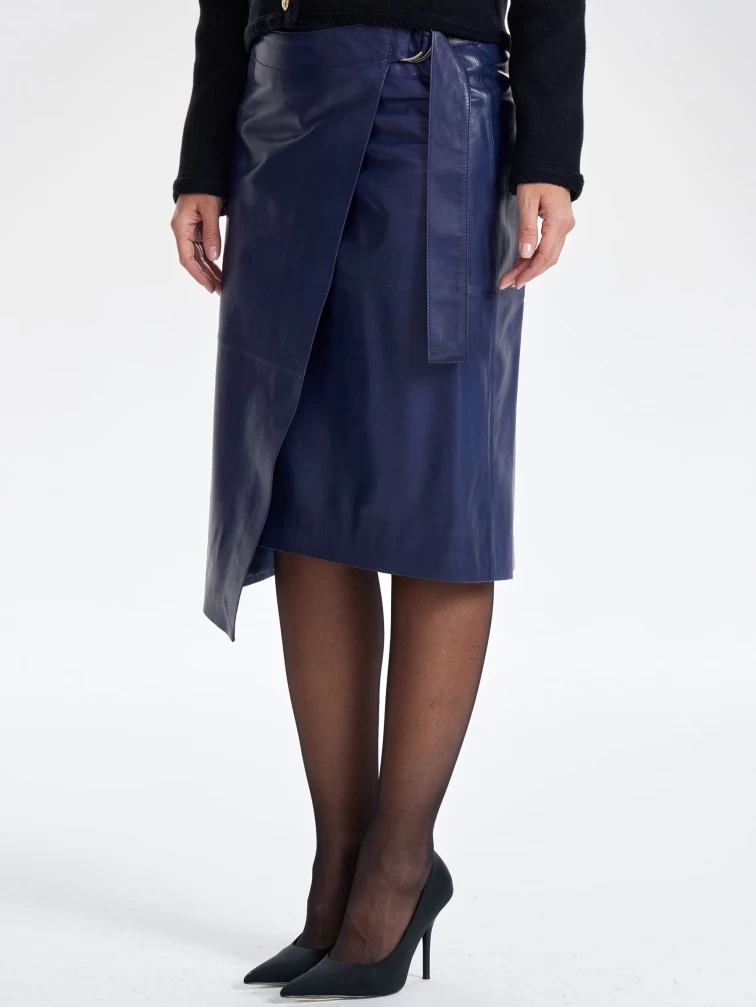 Кожаная юбка-миди с запахом, сшитая из натуральной кожи — это воплощение женственности и элегантности. Прямой силуэт от бедер с эффектным запахом создает соблазнительный образ, а широкий регулируемый пояс подчеркивает талию. Натуральная кожа премиального качества обеспечивает комфорт и безупречный внешний вид. Сочетайте с шелковыми блузами для вечера, водолазками для офиса или объемными свитерами для повседневных образов — эта юбка станет универсальной основой вашего гардероба.