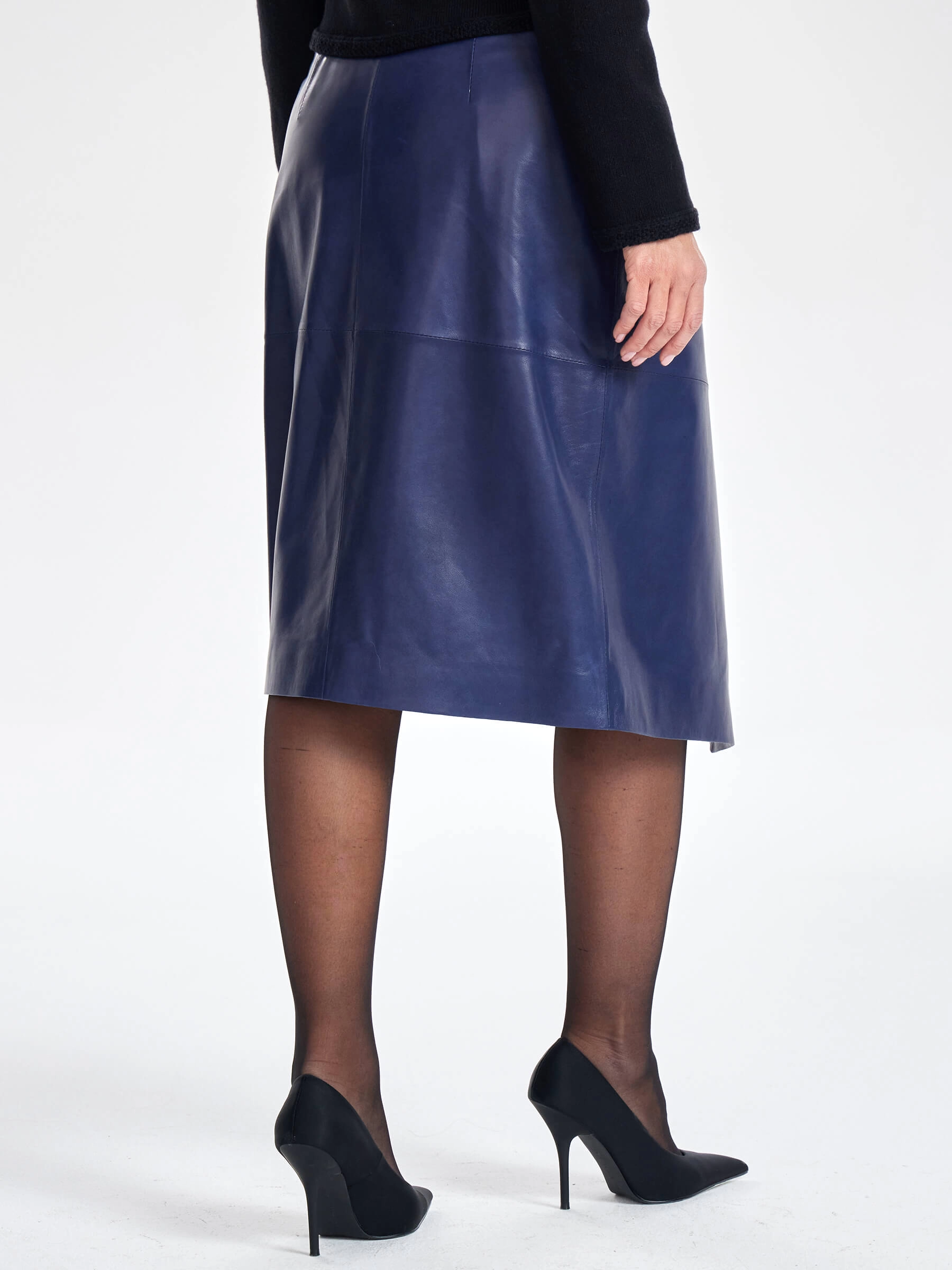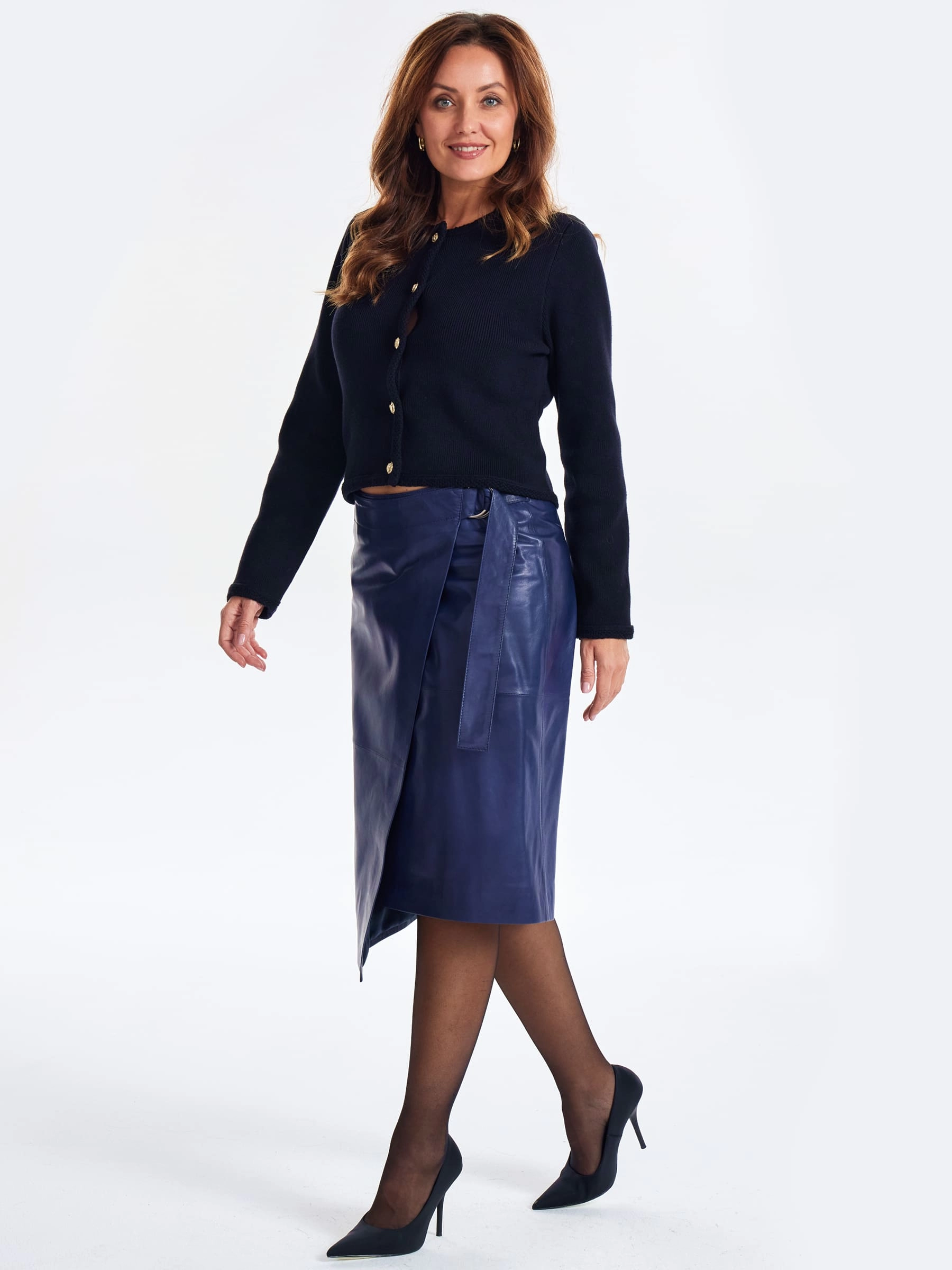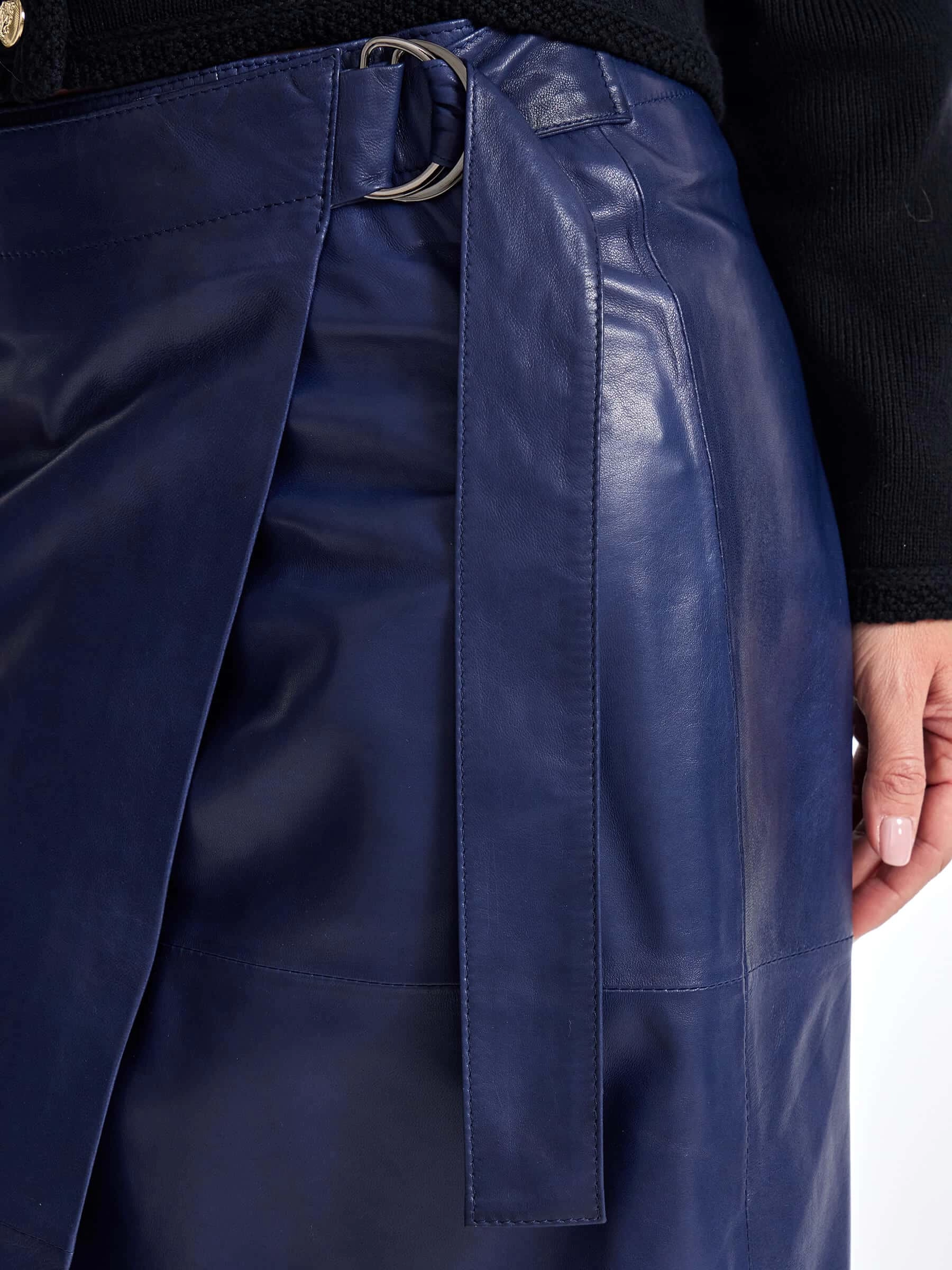 Кожаная юбка миди с запахом 07, синяя, размер 48, артикул 85371