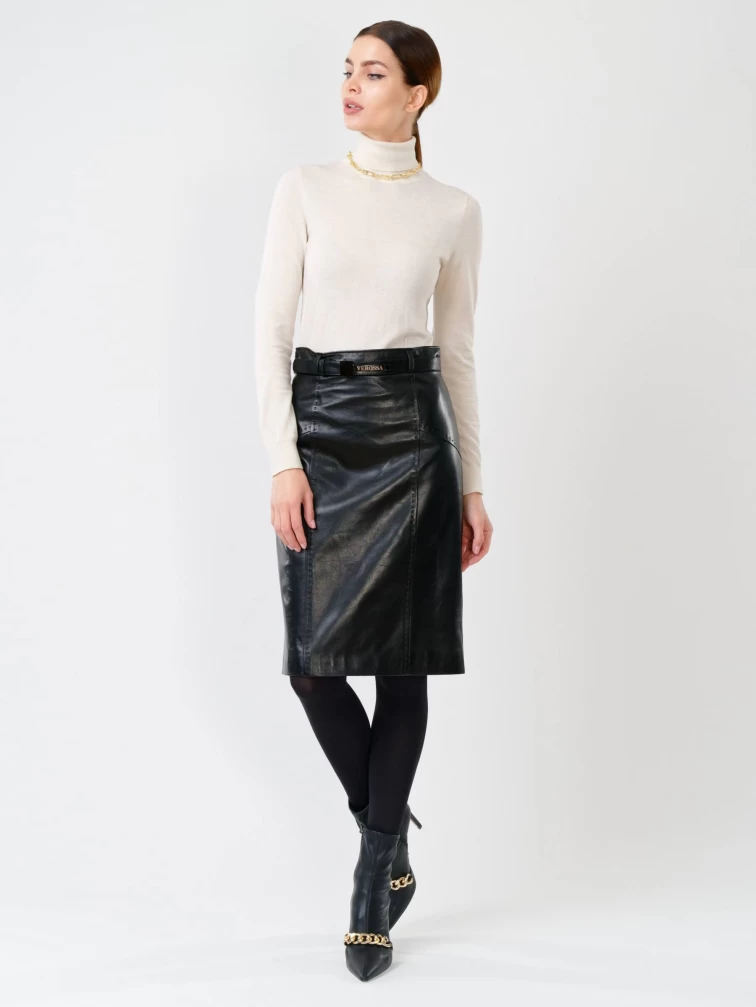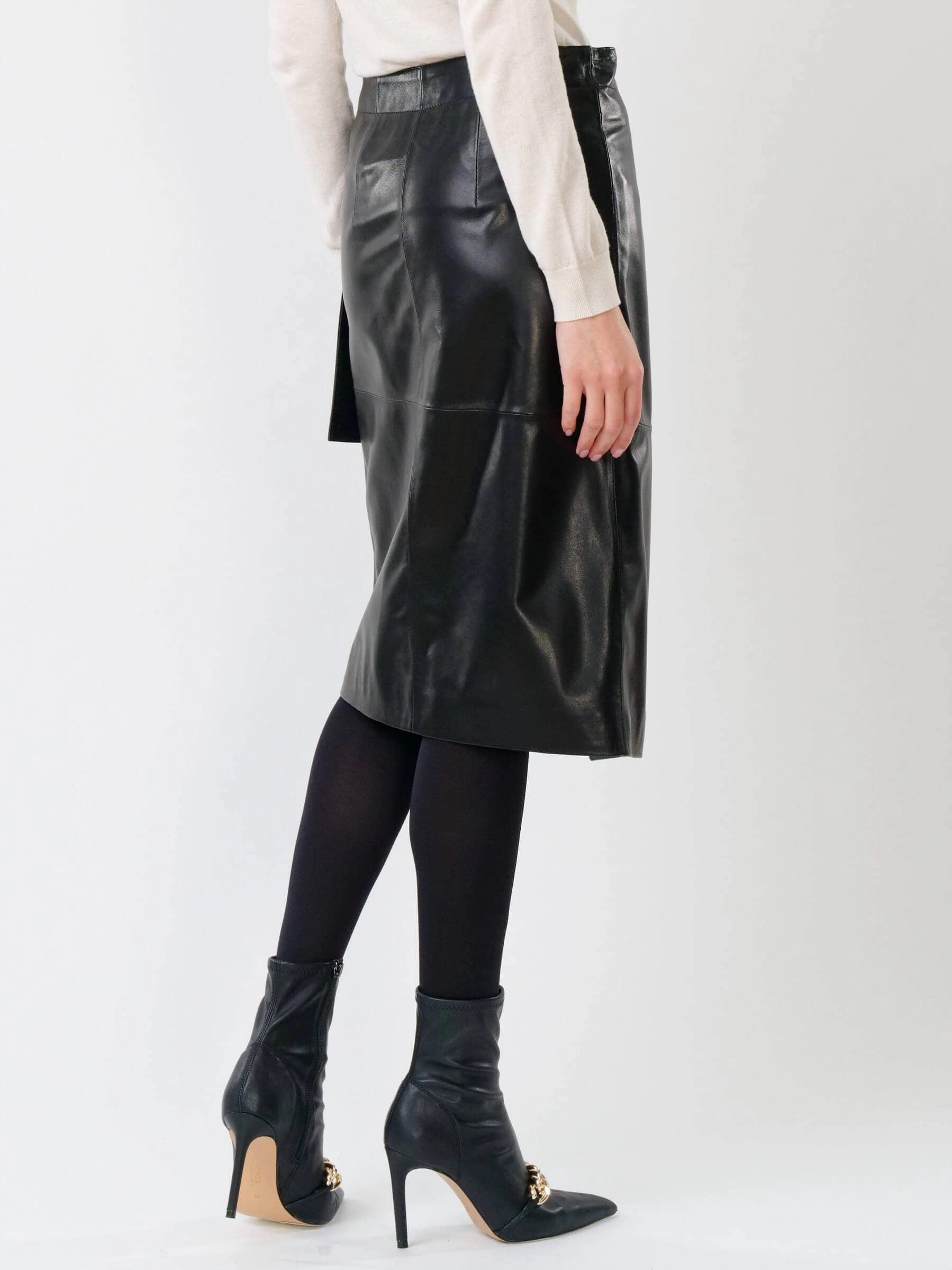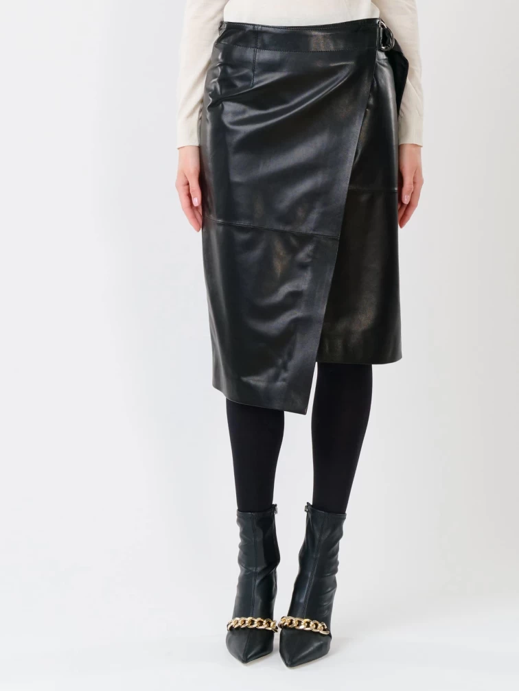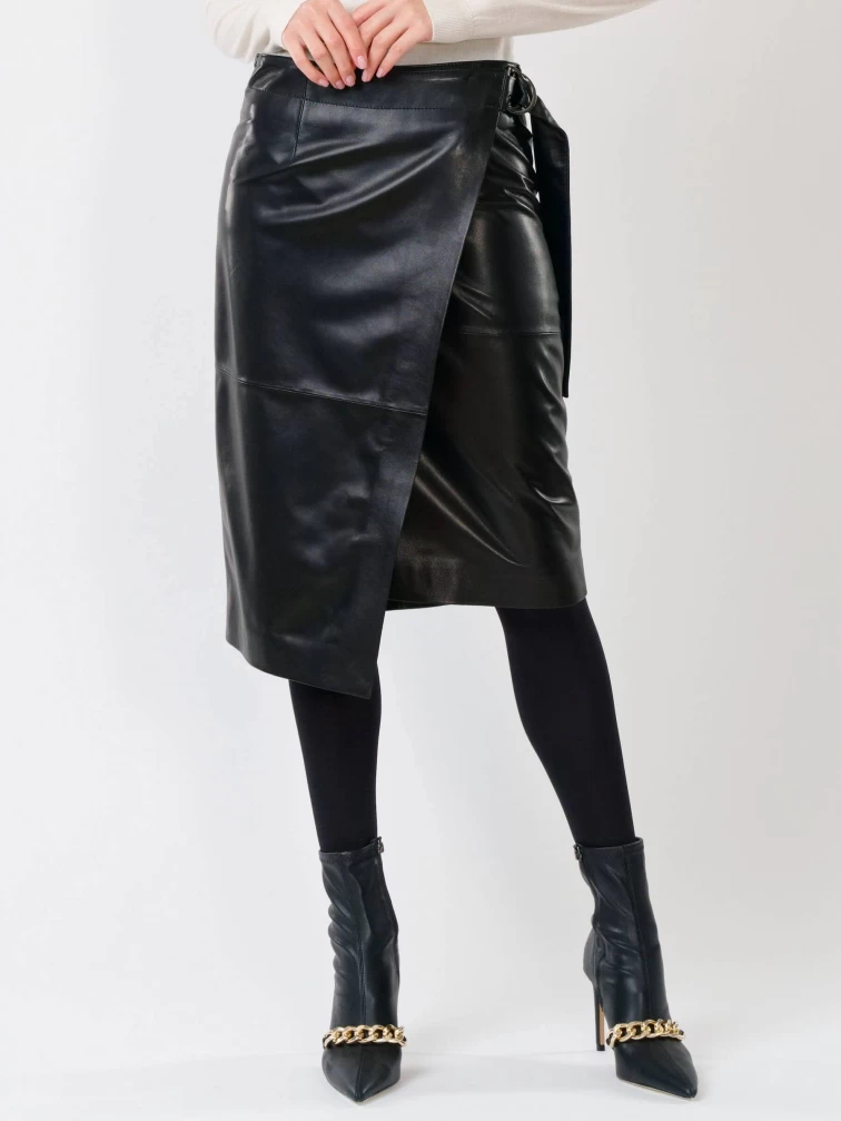 Кожаная юбка-миди с запахом, сшитая из натуральной кожи — это воплощение женственности и элегантности. Прямой силуэт от бедер с эффектным запахом создает соблазнительный образ, а широкий регулируемый пояс подчеркивает талию. Натуральная кожа премиального качества обеспечивает комфорт и безупречный внешний вид. Сочетайте с шелковыми блузами для вечера, водолазками для офиса или объемными свитерами для повседневных образов — эта юбка станет универсальной основой вашего гардероба.