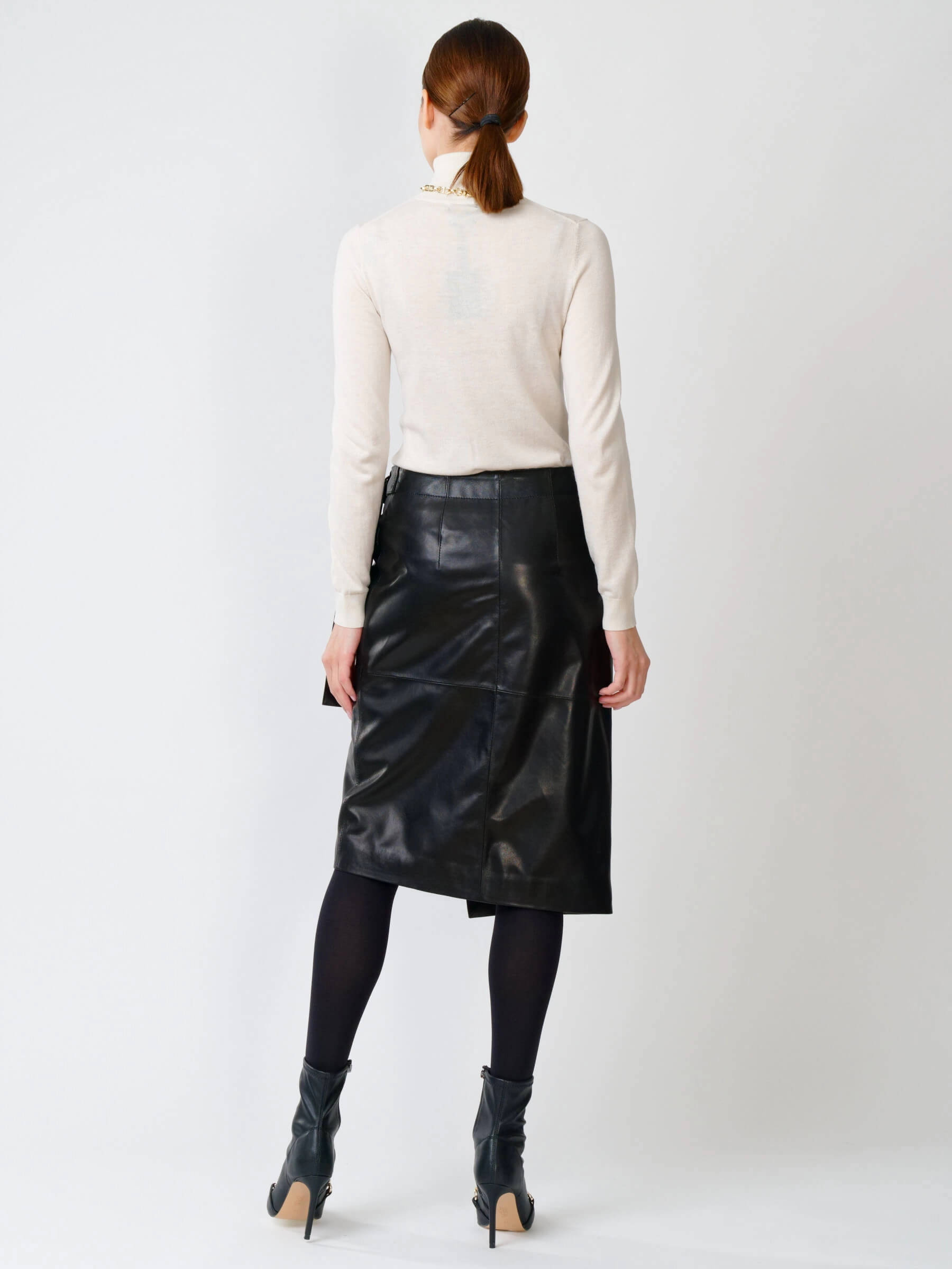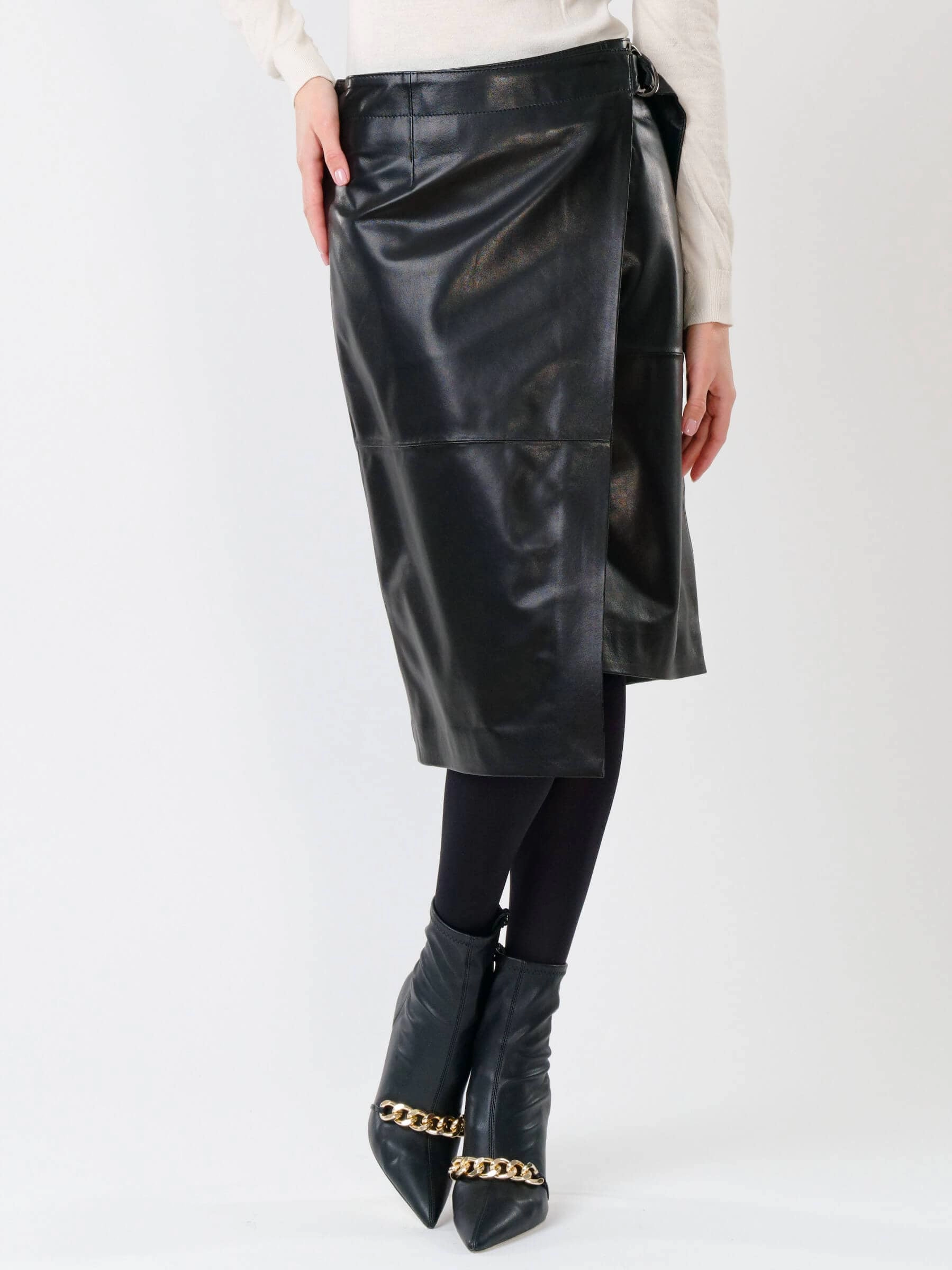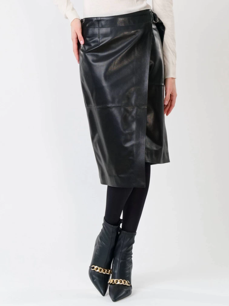 Кожаная юбка миди с запахом 07, черная, размер 44, артикул 85301