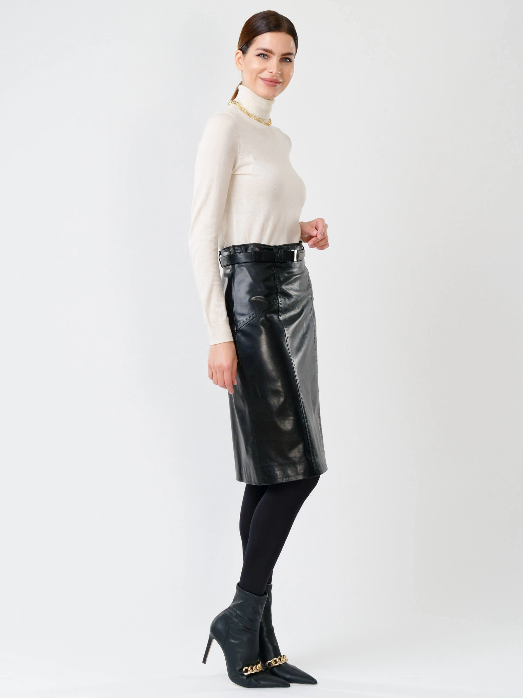 Товар кожаная юбка миди с запахом 07, черная, размер 44, артикул 85301 выполнен из натуральной кожи с застежкой молния. Рассчитан на сезон: демисезон. Длина изделия 65 см, силуэт прямой.