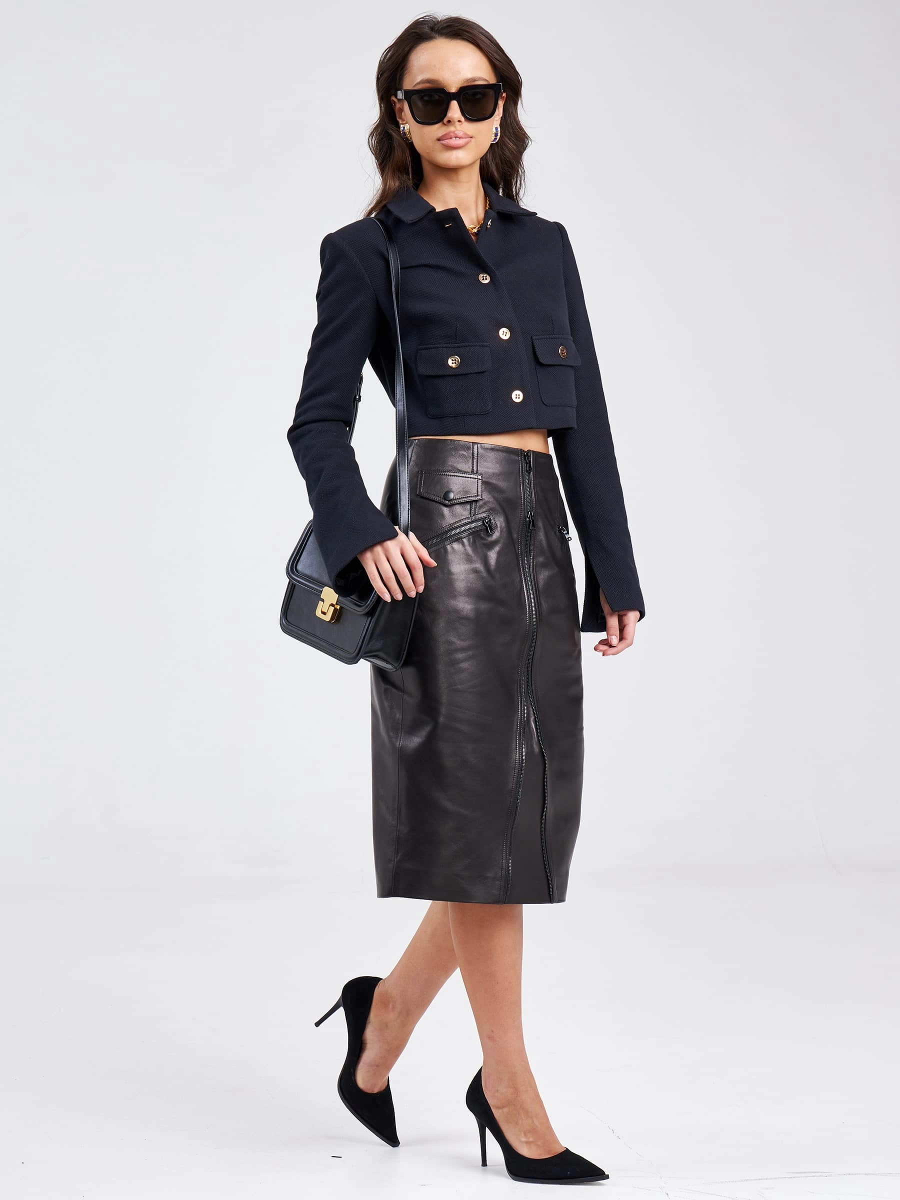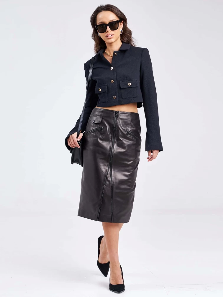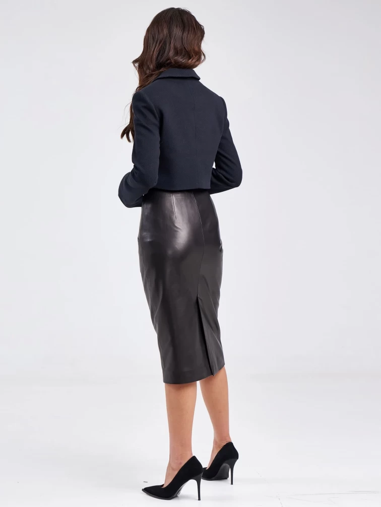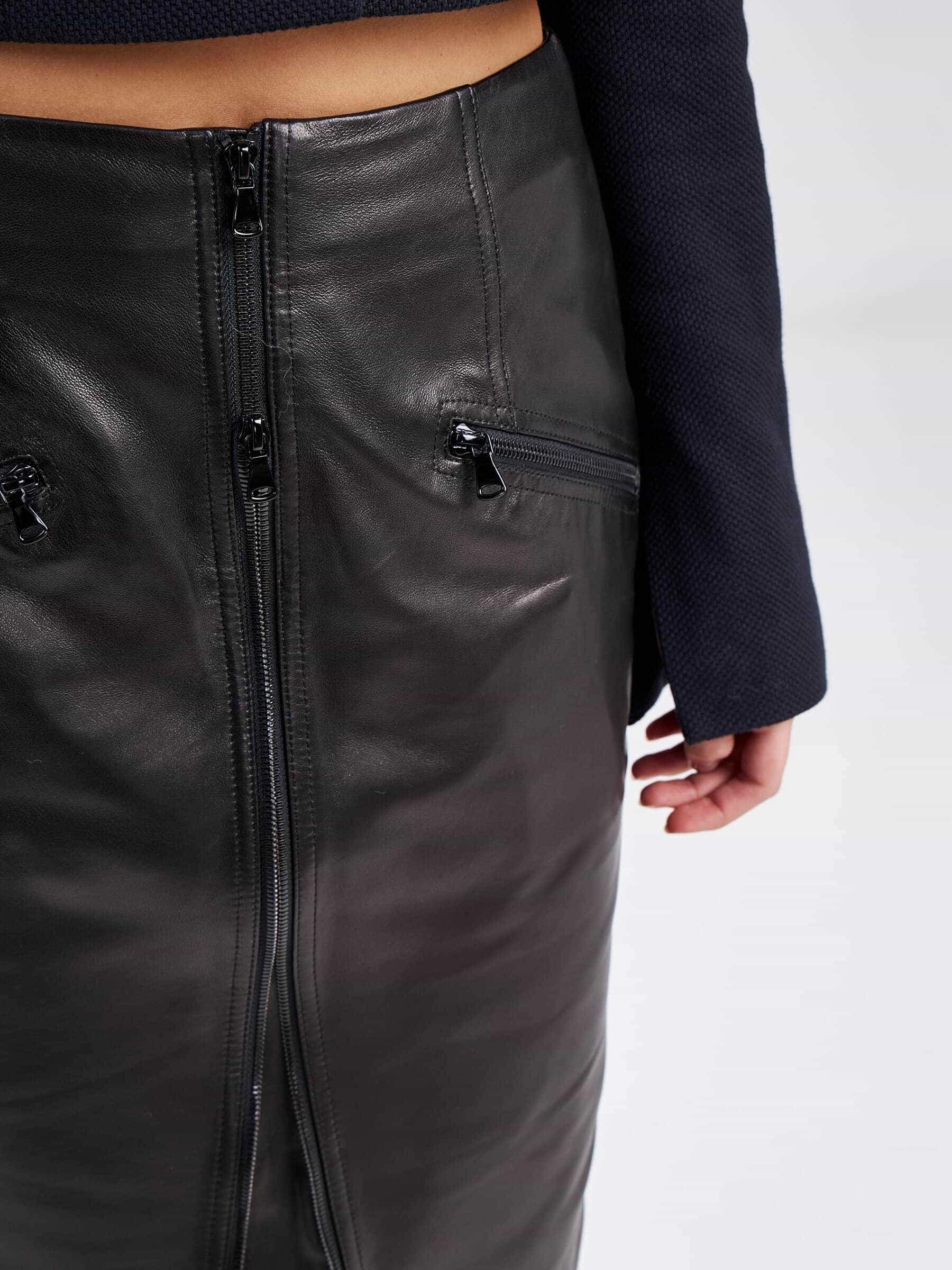 Товар модная женская кожаная юбка 13, черная, размер 44, артикул 85930 выполнен из натуральной кожи с застежкой молния. Рассчитан на сезон: весна-лето. Длина изделия 75 см, силуэт прямой.