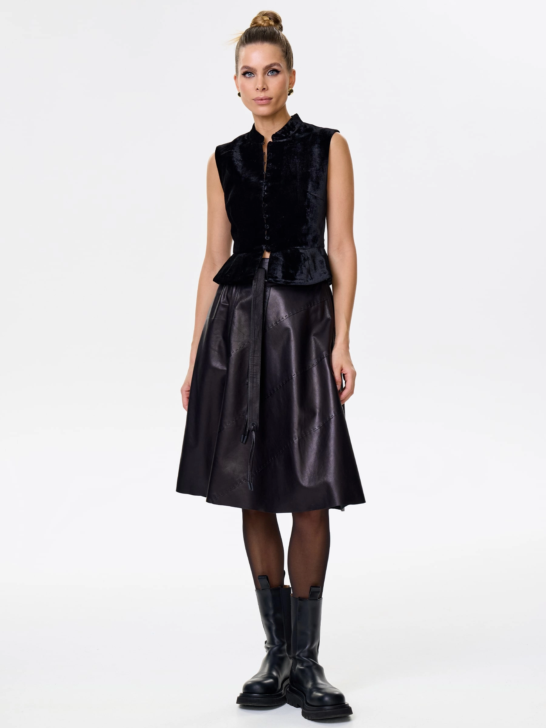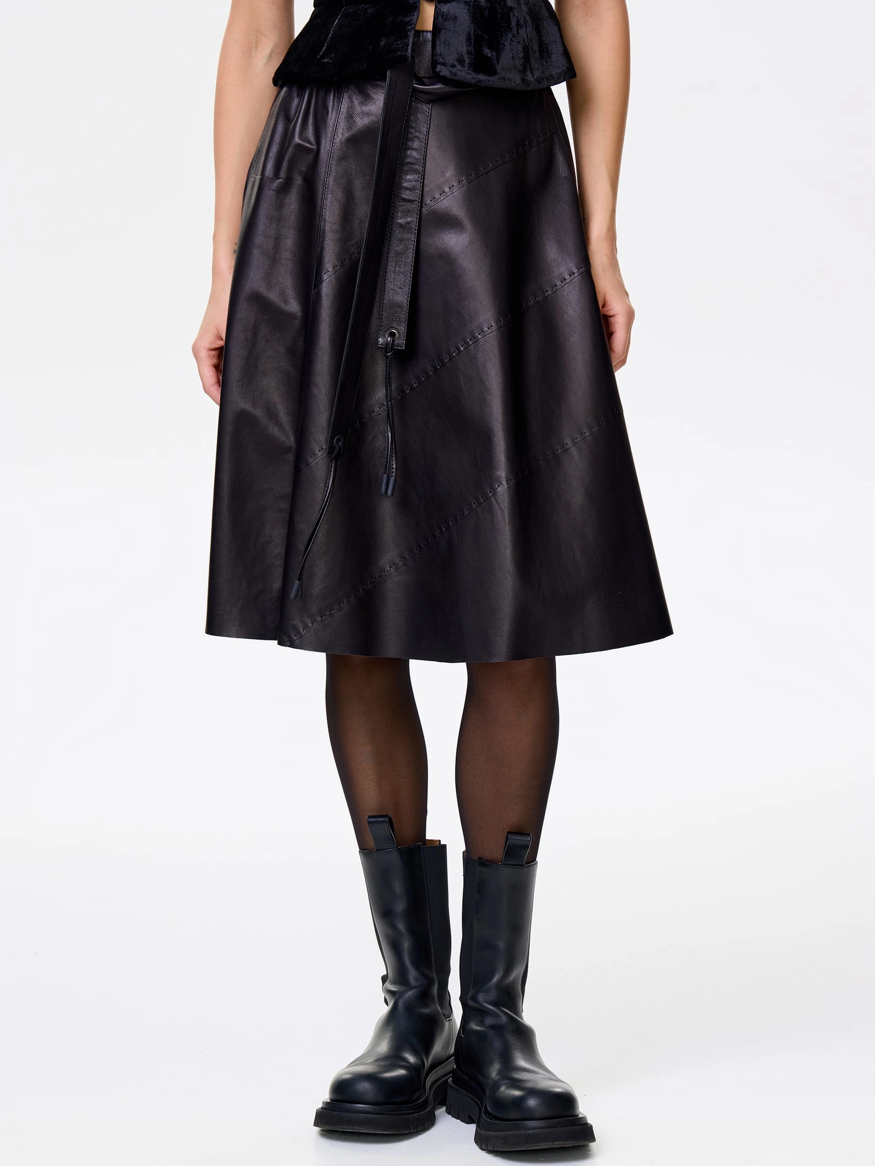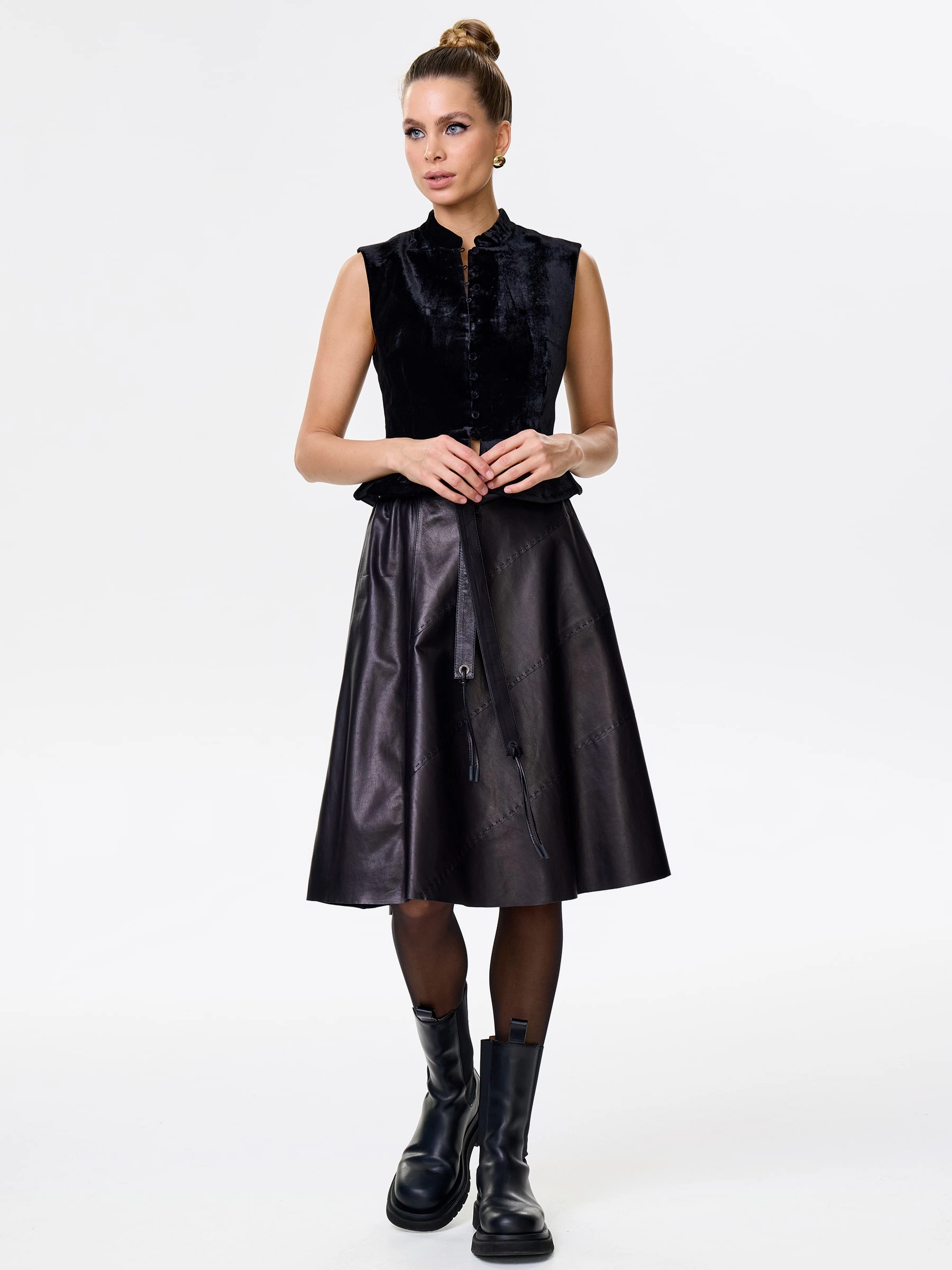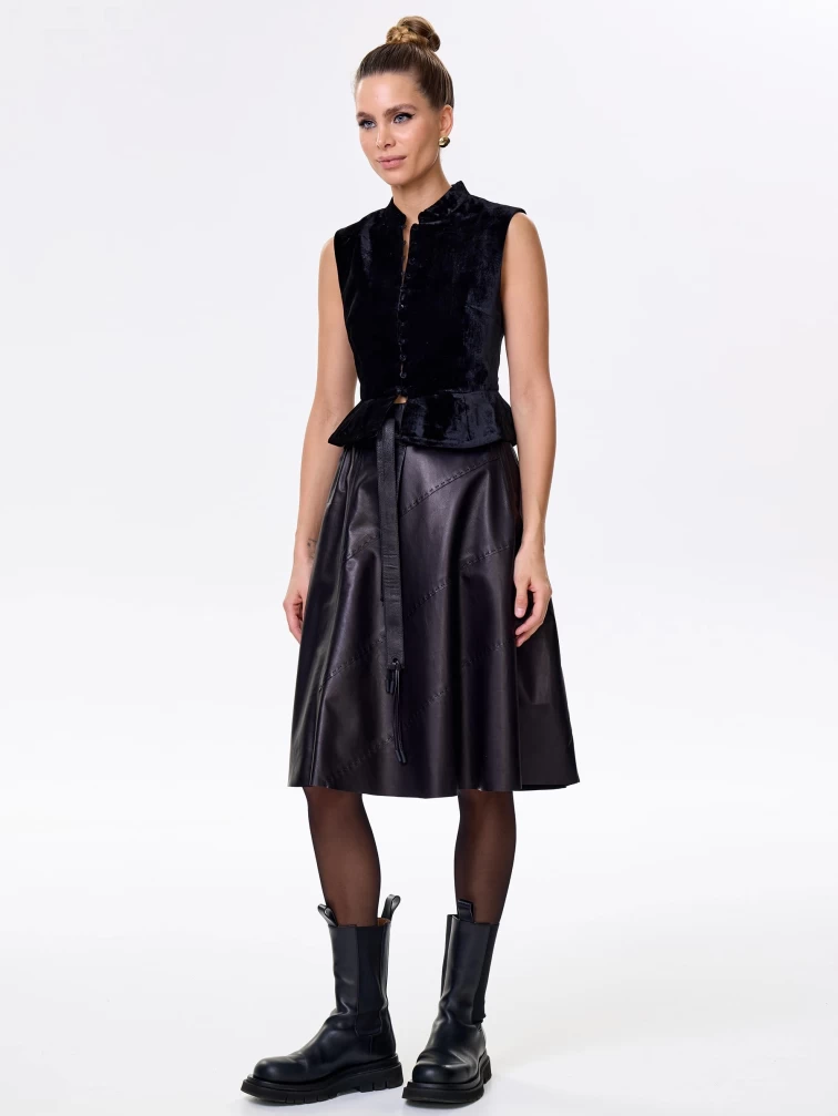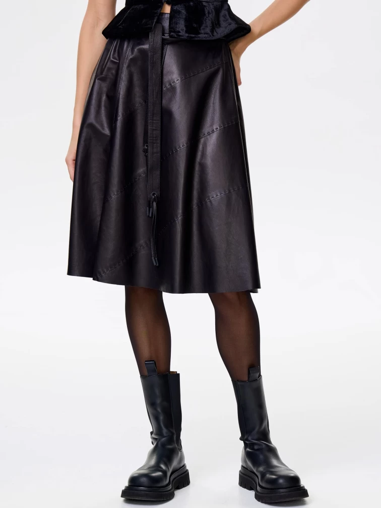 Облегающая расклешённая юбка из натуральной мягкой кожи с благородным блеском сочетает комфорт и долговечность. Летящий крой визуально стройнит фигуру, добавляя образу лёгкость и динамику, а эксклюзивная отделка ручной строчкой подчёркивает премиальное качество. Длинный пояс служит стильным акцентом, а потайная застёжка-молния сзади обеспечивает идеальную посадку и чистоту линий. Универсальная модель легко впишется в любой гардероб - от офиса до вечернего выхода.