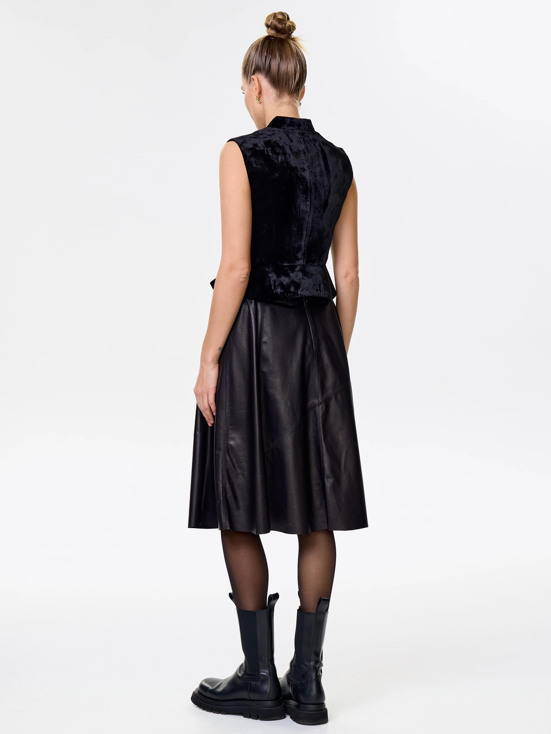 Товар кожаная расклешенная юбка из натуральной кожи 01рс, черная, размер 44, артикул 85460 выполнен из натуральной кожи с застежкой молния. Рассчитан на сезон: демисезон. Длина изделия 70 см, силуэт расклешенный.
