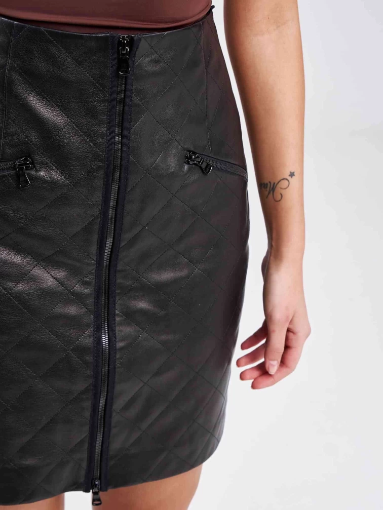 Короткая стеганая юбка не выглядит просто за счет мягкой гладкой кожи премиум класс. Прямой крой, средняя посадка по фигуре.Два асиметричных кармана. Спереди- разрез, высоту которого можно регулировать молнией.