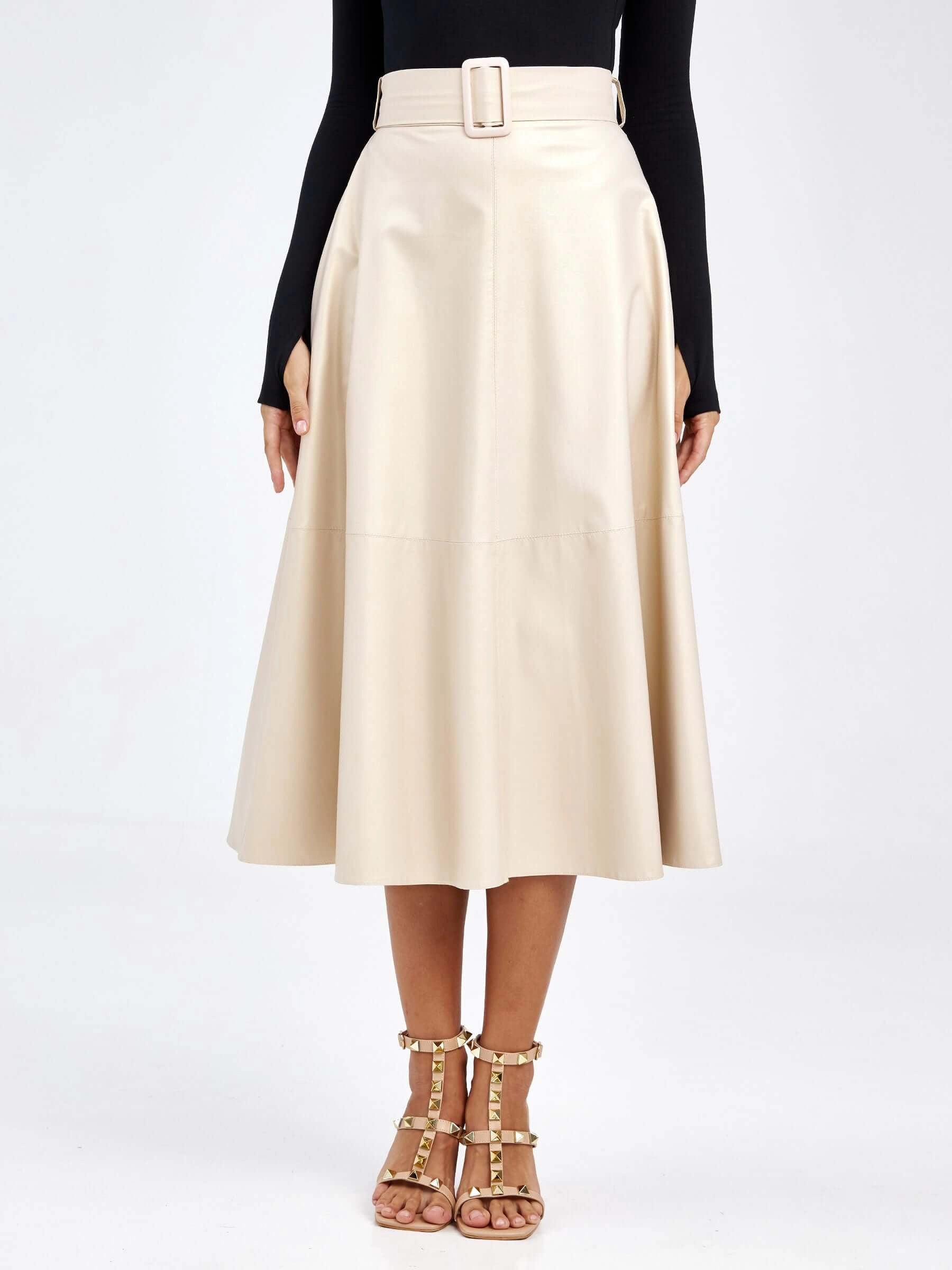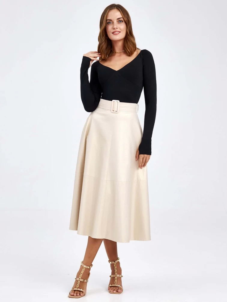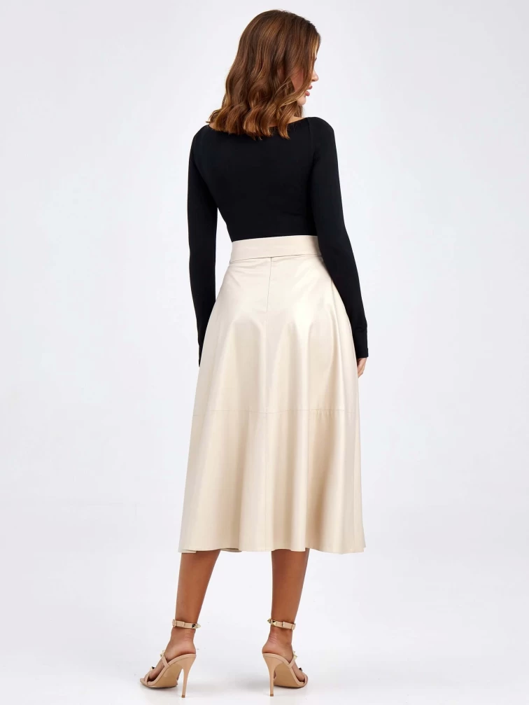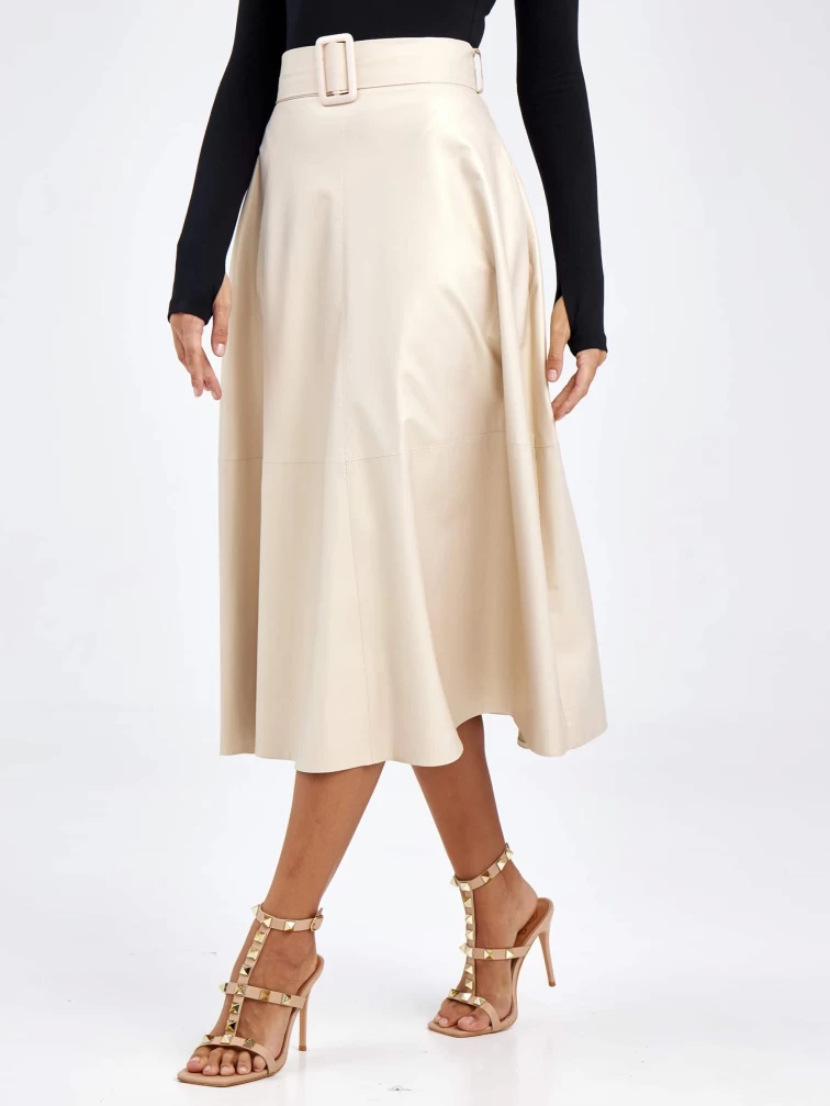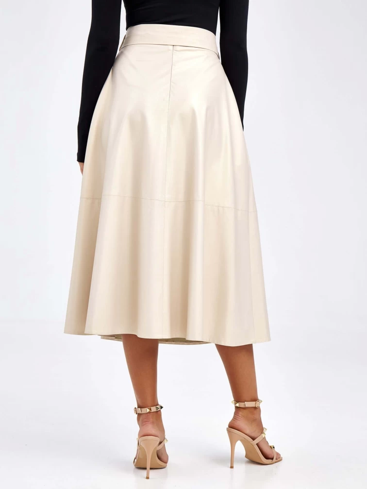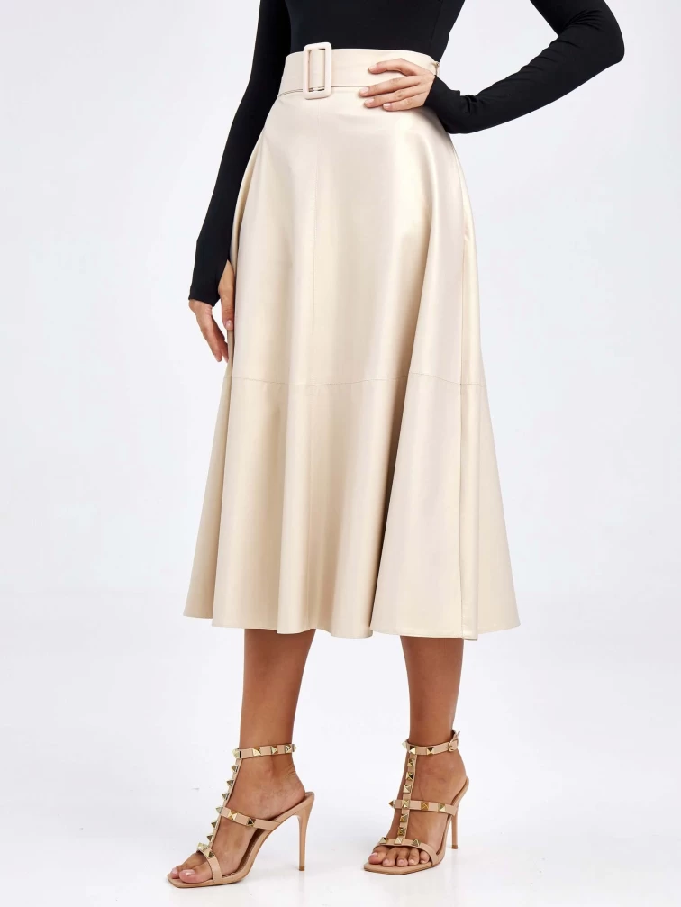 Товар женские кожаная юбка из экокожи 4878427, жемчужная, размер 46, артикул 85780 выполнен из экокожи с застежкой молния. Рассчитан на сезон: демисезон. Длина изделия 75-90 см, силуэт расклешенный.