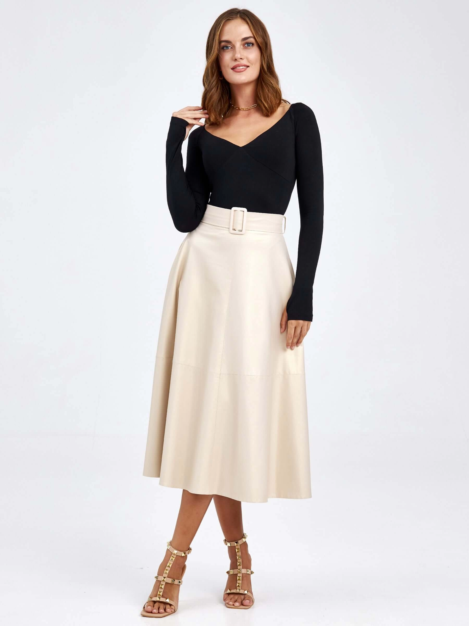 Расклешенная юбка в длине миди- виртуозно справится с любой задачей, будь то блуза, боди или пиджак. Юбка сшита из мягкого материала –Экокожа. Удобные карманы в боковых швах. Не требовательна в уходе. Идеальную посадку по фигуре обеспечит широкий пояс в тон.