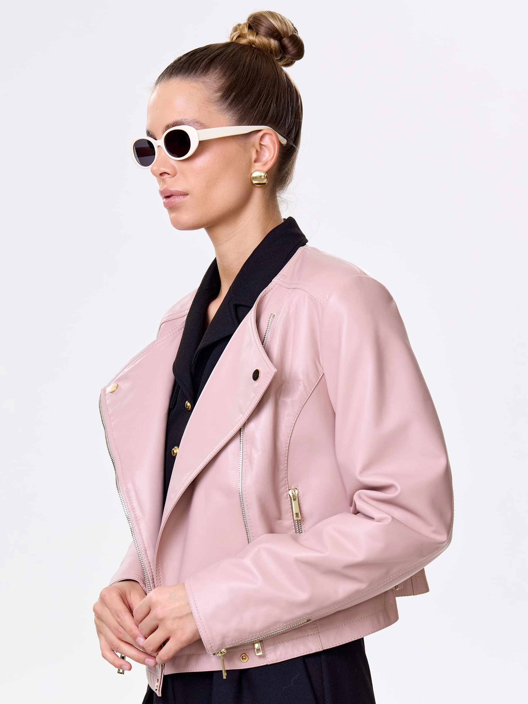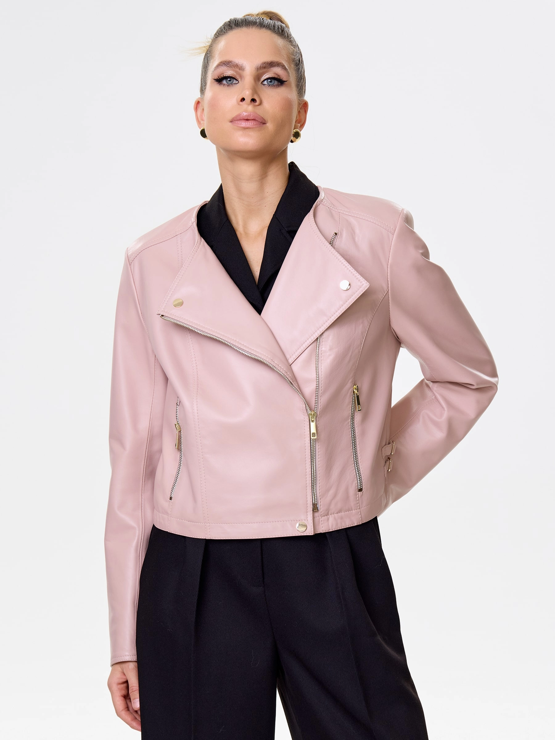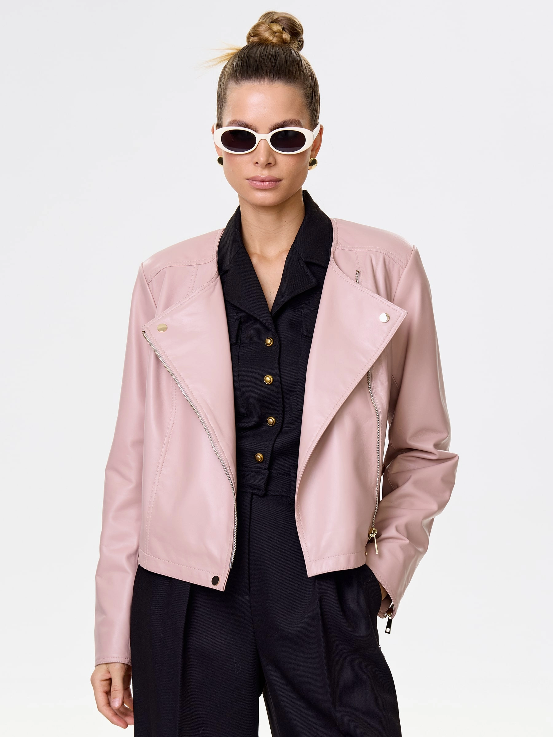 Короткая женская косуха из мягчайшей натуральной кожи нежного пудрового оттенка: полуприлегающий силуэт на молнии без воротника излучает утонченный спортивный шик. Регулируемые боковые паты обеспечивают идеальную посадку, подчеркивая фигуру, а втачные рукава и врезные карманы на молниях гарантируют комфорт и функциональность. Этот нежный must-have легко сочетается с романтичными и бунтарскими образами — наденьте с воздушным платьем-миди из шифона и кедами для нежной дерзости или с черным кружевным топом, кожаными шортами и грубыми ботинками для смелого контраста.