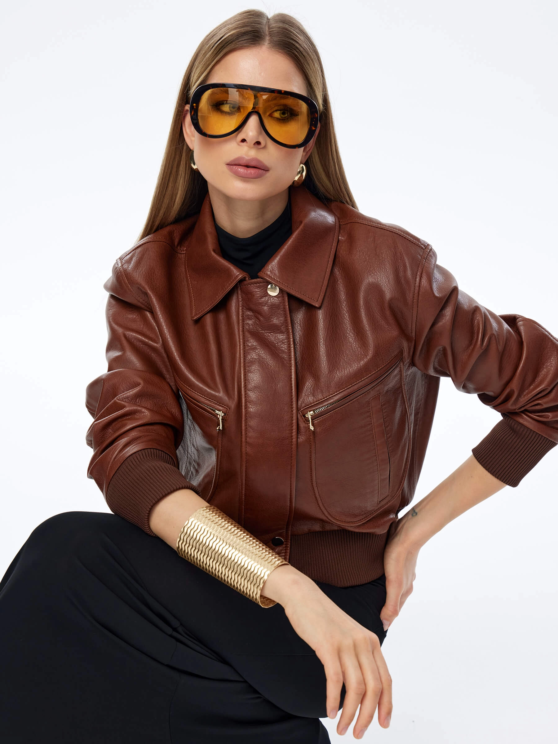 Для пошива короткой куртки-бомбер с отложным воротником и четырьмя карманами, использовали мелкозернистую кожу премиум класса. Бережная выделка сделала материал более мягким и пластичным. Модель свободного кроя со спущенной линией плеча комфортно садится по фигуре, не ограничивает движение. Изделие застегивается встречной молнией с широкой планкой. Манжеты и пояс дополнили трикотажной резинкой.