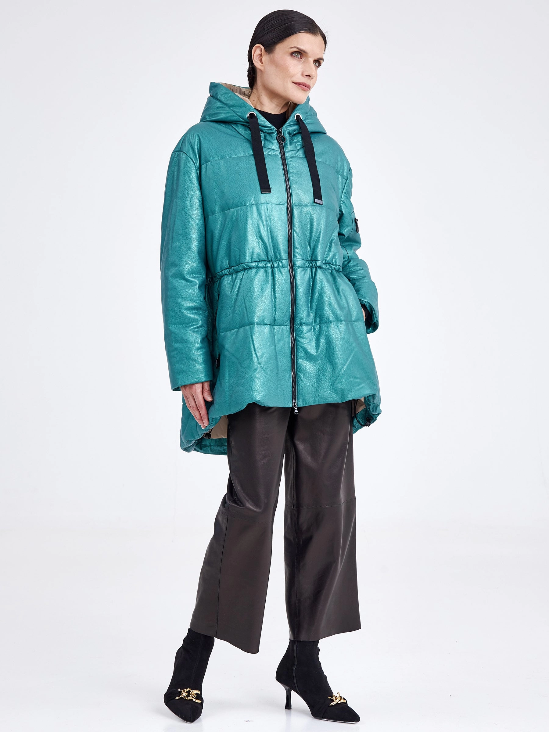 Товар кожаная женская куртка оверсайз с капюшоном премиум класса 3021, зеленая, размер 48, артикул 25470 выполнен из натуральной кожи с застежкой молния. Рассчитан на сезон: демисезон. Длина изделия 75-90 см, силуэт свободный.