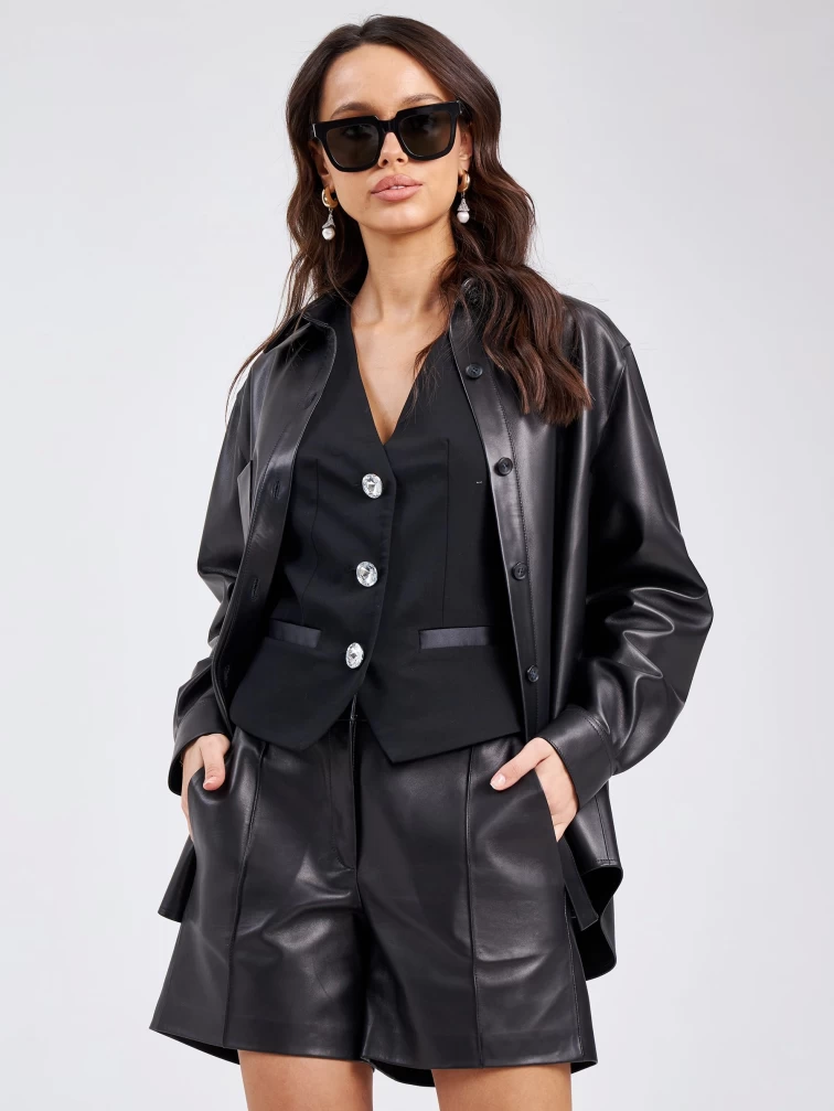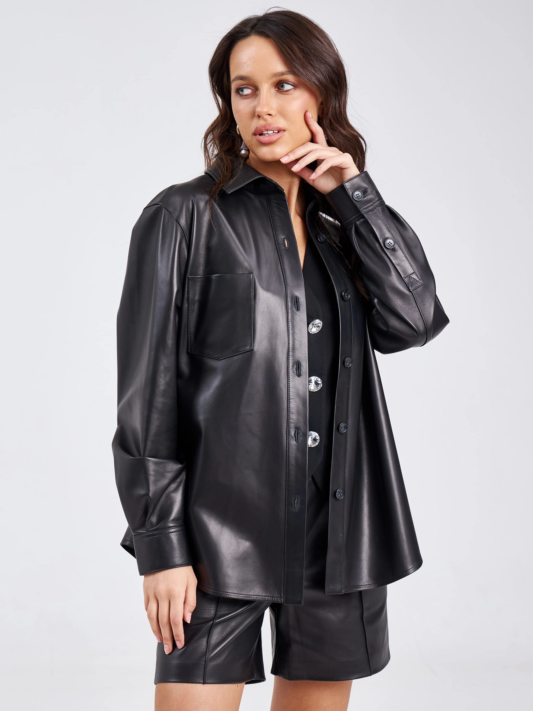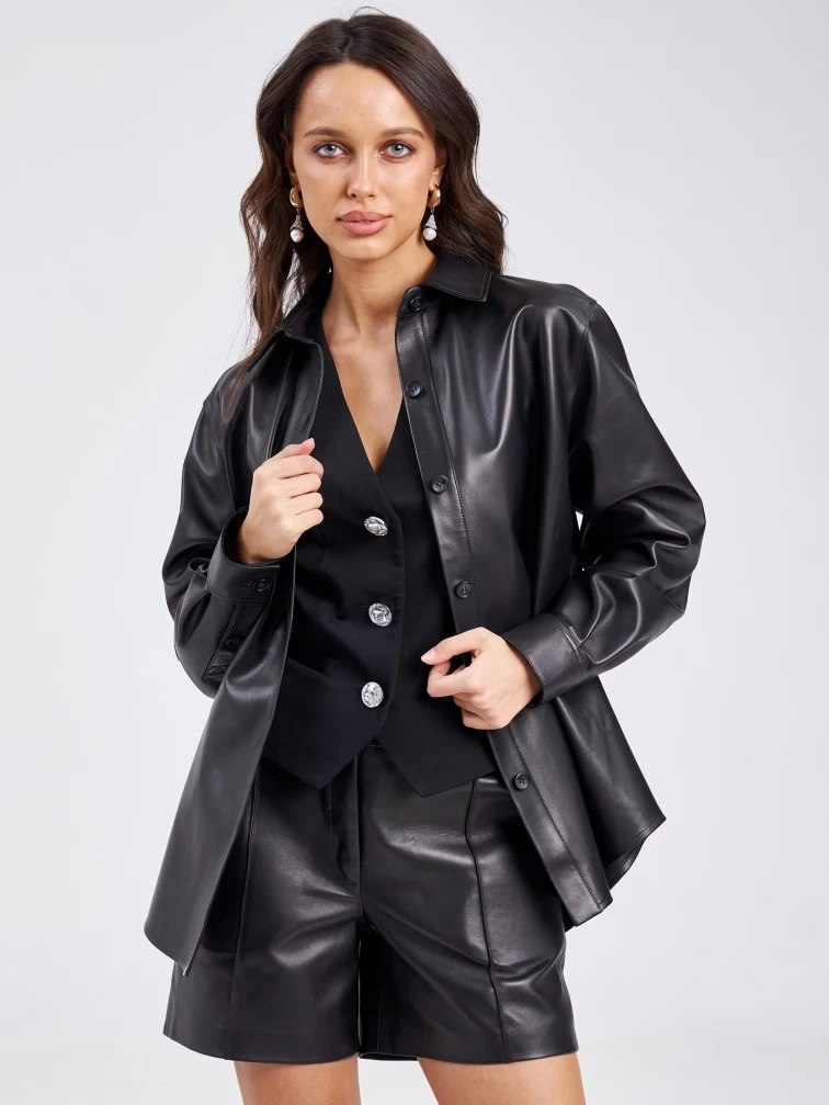 Женская куртка прямого кроя, с длинными рукавами и отложным воротником - отличное решение в прохладные дни. Для пошива модели мастера выбрали мягкую кожу премиум класса. Изменить силуэт поможет тонкий кожаный ремень.