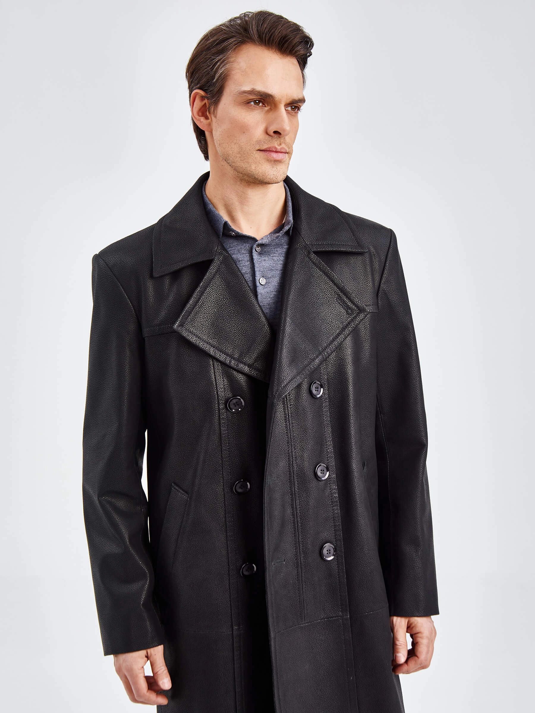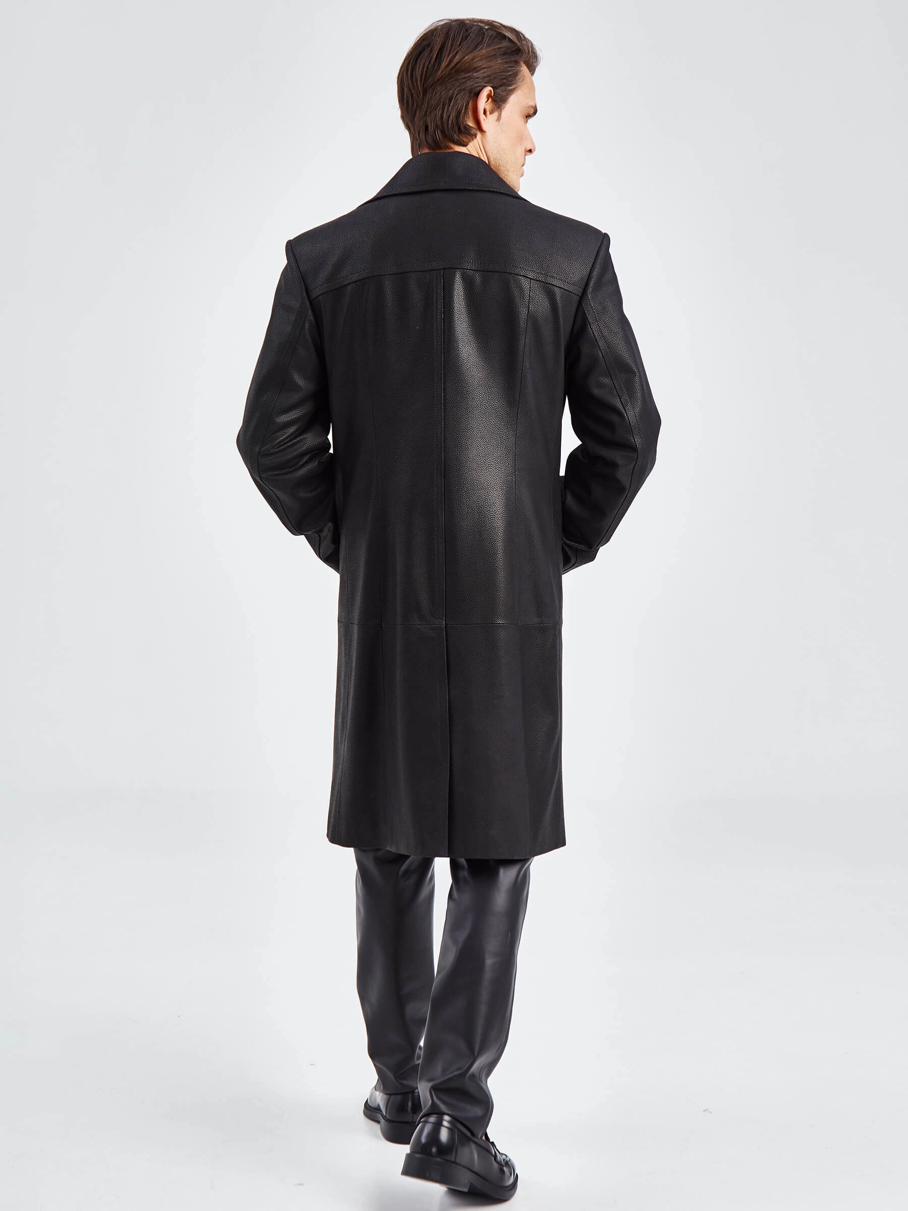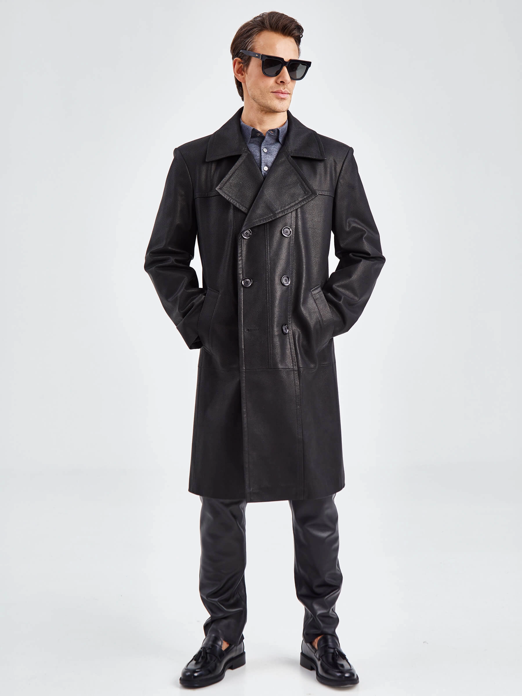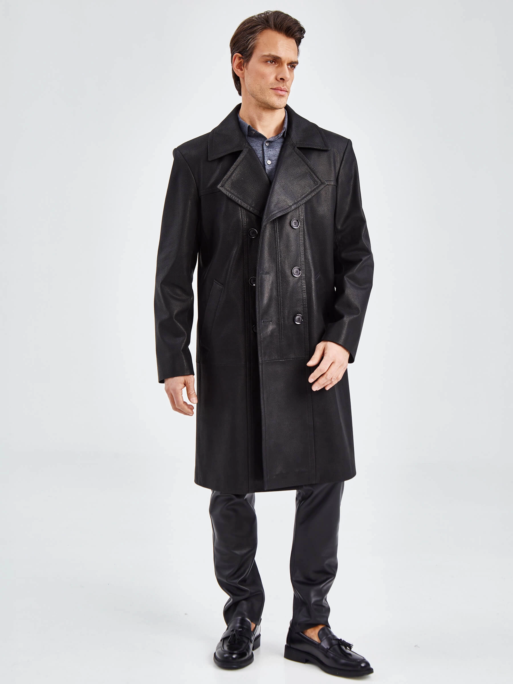 Двубортное кожаное пальто для уверенных в себе мужчин. Усиленные листочки наружных карманов. Предусмотрены внутренние застёгивающиеся карманы для документов. Особая обработка петель под пуговицы предотвращает их изнашивание. Сзади предусмотрена удобная шлица. Прекрасно сочетается по стилю как со свободной одеждой, так и со строгим деловым костюмом. Аккуратность во всей работе. Чёткая и очень комфортная посадка по фигуре. Стильно и дорого.