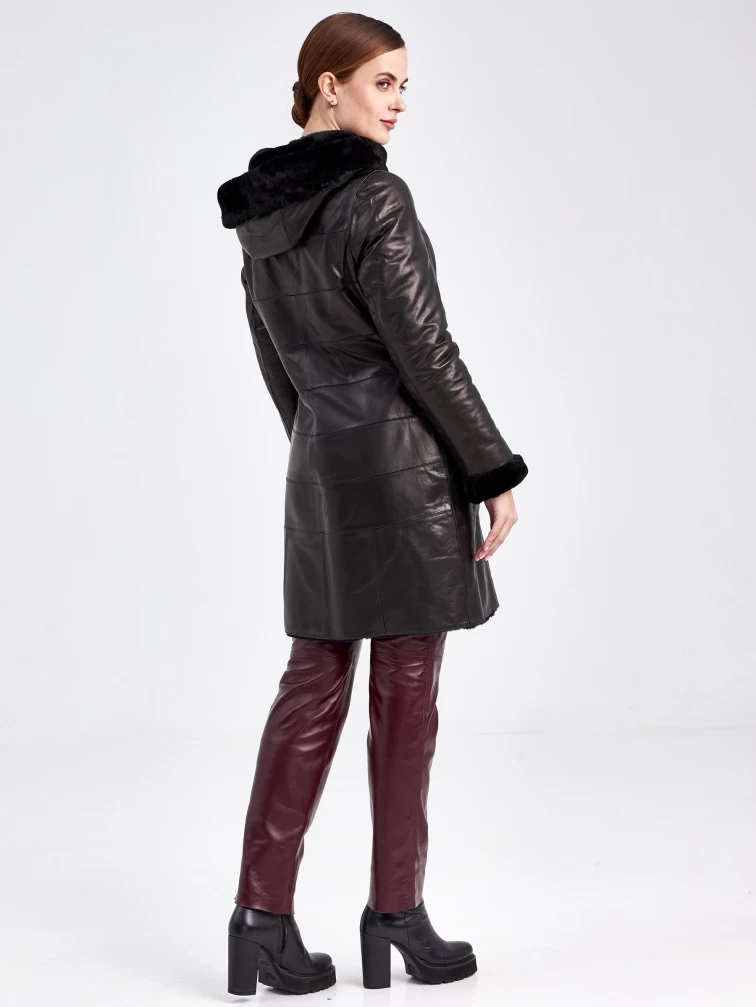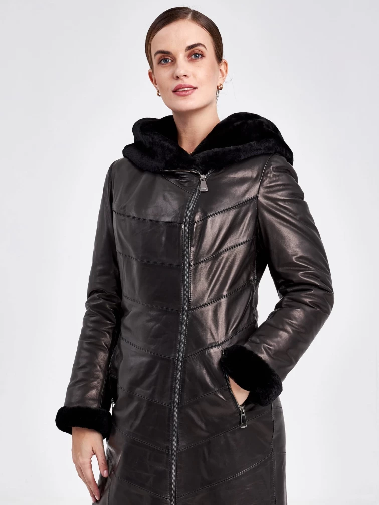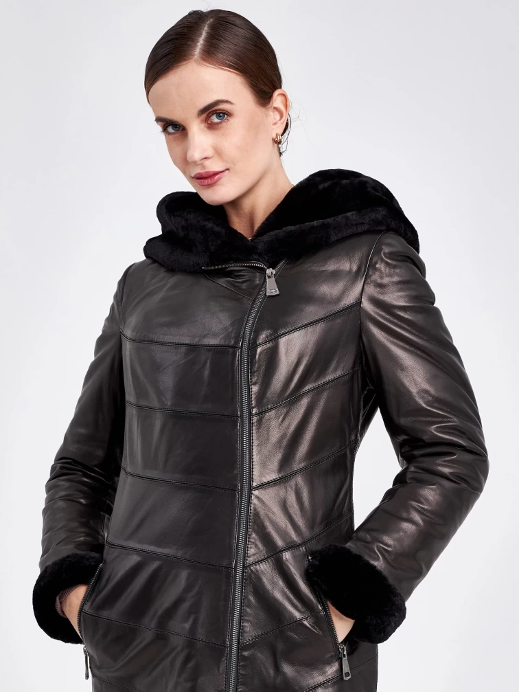 Самое популярное решение на зимний сезон станет теплое и практичное пальто выполненное из натуральной черной кожи в тандеме с плотной овчиной. Пальто хорошо сохраняет тепло,легко сочетается с любой одеждой. Два врезных кармана, как и сама модель, застегиваются на молнию.За комфорт в капризную погоду отвечает уютный капюшон.