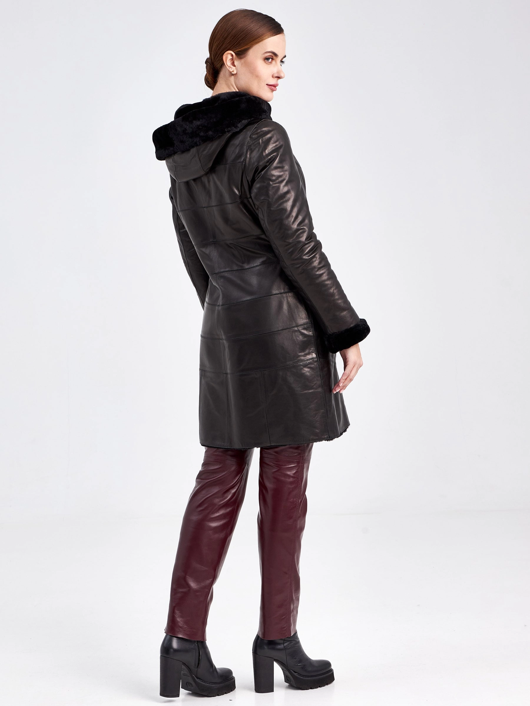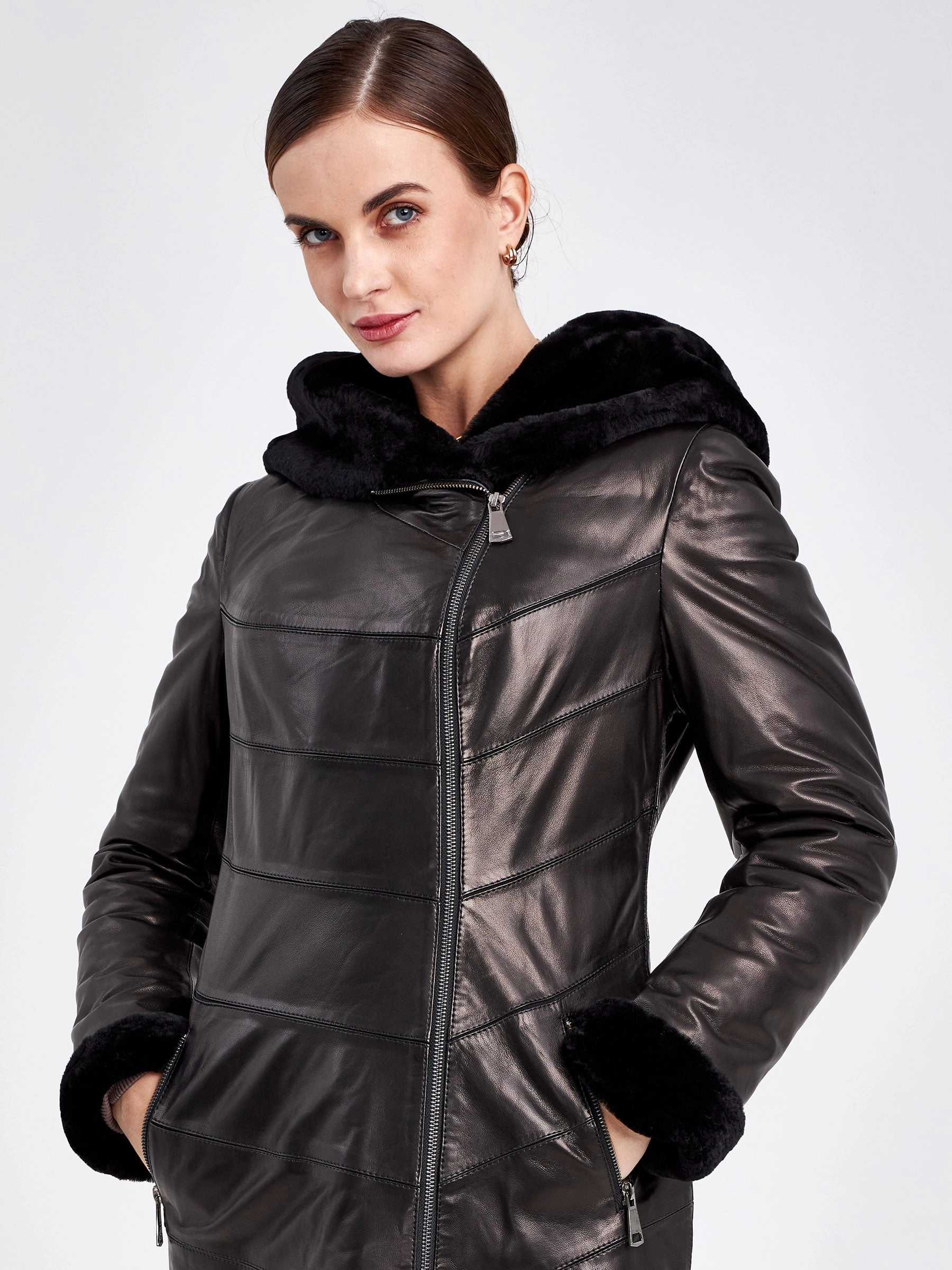 Кожаное пальто зимнее женское 391мех, с капюшоном, черное, размер 46, артикул 91820